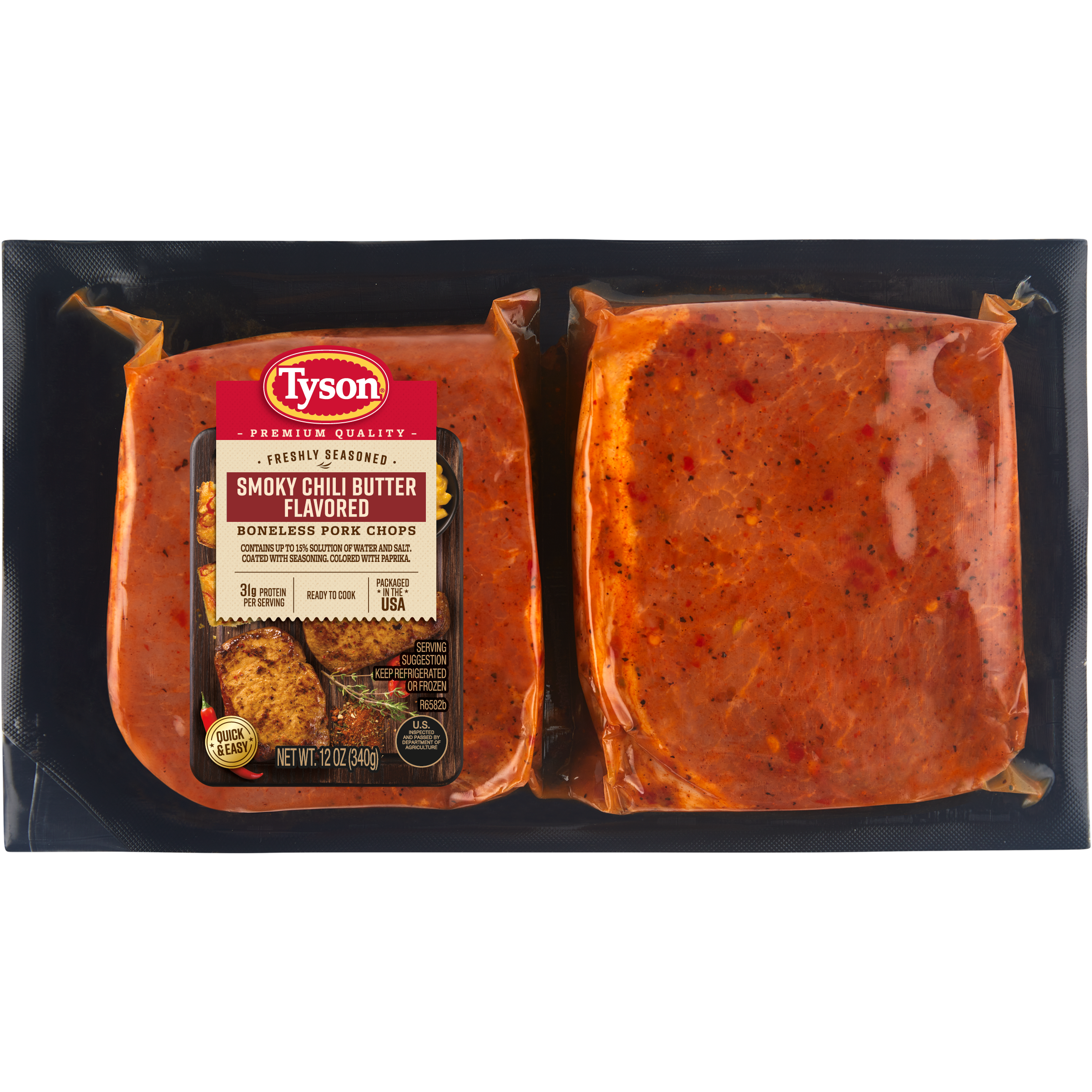 | Retail eCommerce Marketing Message | Spice up your dinner routine with Tyson® Smokey Chili Butter Pork Chops! Each chop is infused with the bold kick of chili and the rich goodness of butter, creating a masterpiece that will tantalize your taste buds. With 2 servings, there’s just the right amount for your meal. With decades of experience and a legacy of trust, the Tyson® brand has been a household name, delivering quality and consistency to families around the world. |