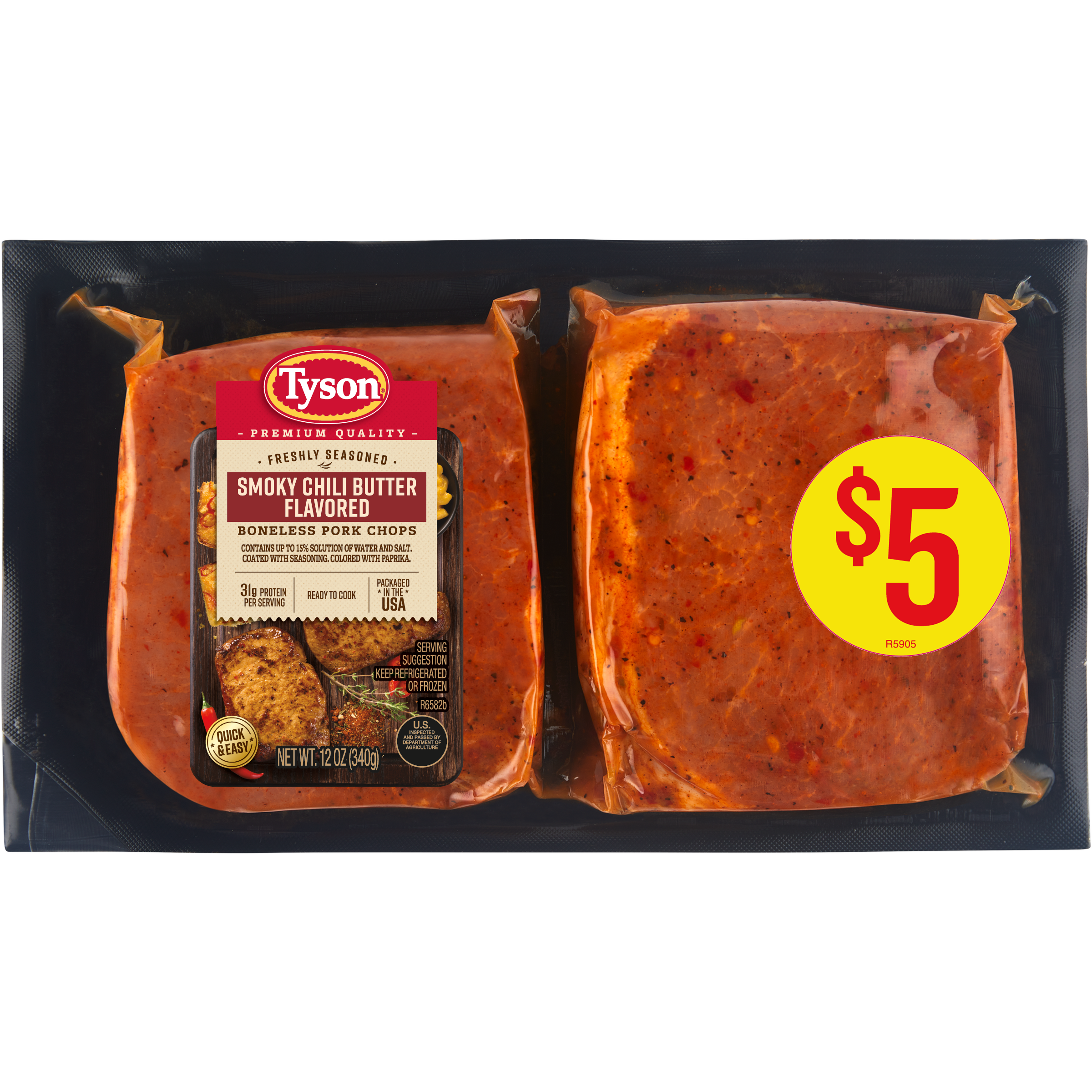 | Retail eCommerce Marketing Message | Spice up your dinner routine with Tyson® Smokey Chili Butter Pork Chops! Each chop is infused with the bold kick of chili and the rich goodness of butter, creating a masterpiece that will tantalize your taste buds. With 2 servings, there’s just the right amount for your meal. With decades of experience and a legacy of trust, the Tyson® brand has been a household name, delivering quality and consistency to families around the world. |