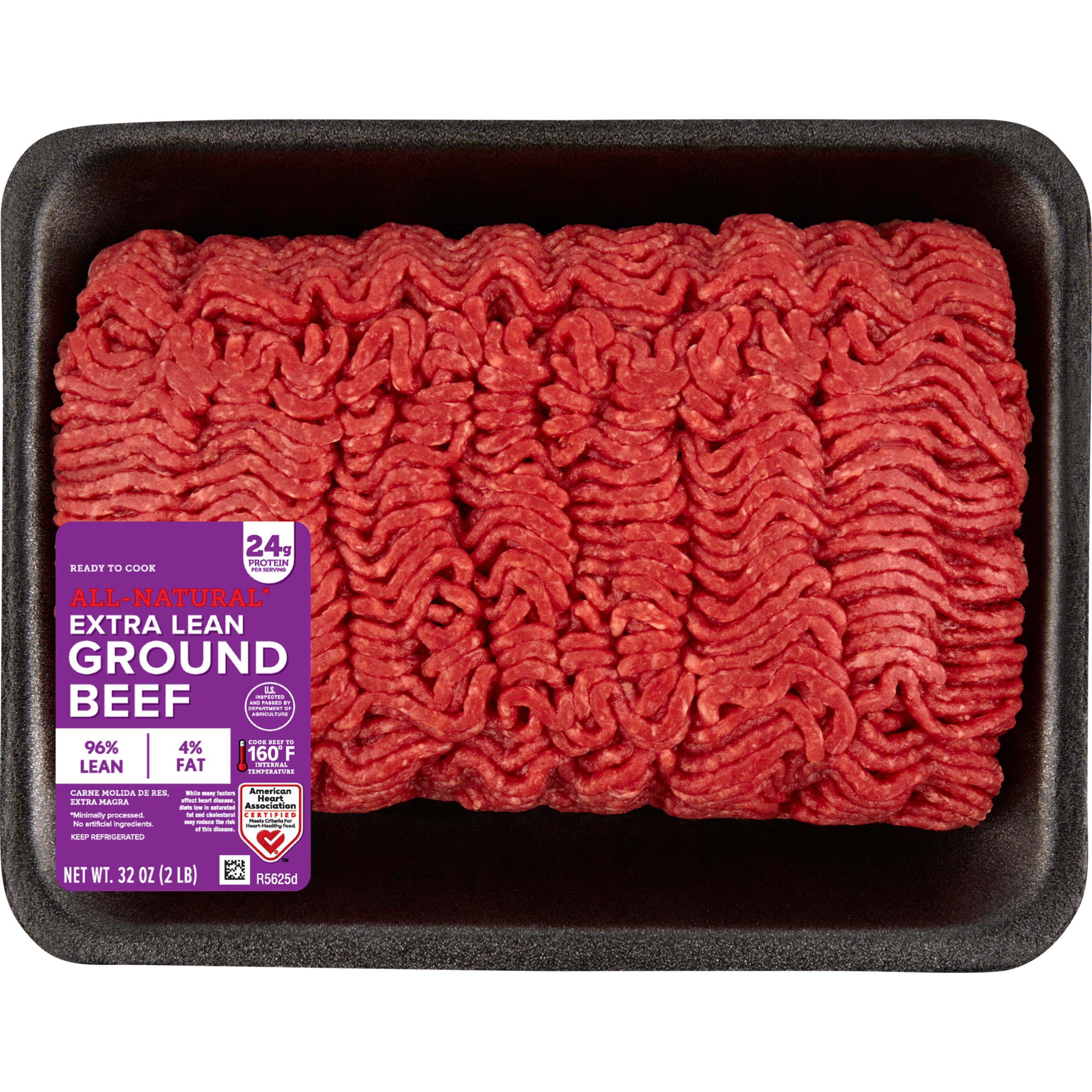 | Retail eCommerce Marketing Message | The All Natural* Extra Lean 2 pound ground beef pack is wholesome, juicy and delicious. Our high quality beef products are perfect for quick and easy beef meals that are both nutritious and delicious. Our beef is sourced from the finest beef cuts, ensuring freshness and quality. Our ground beef pack is made from extra lean beef that is 96% lean and 4% fat. It is USDA inspected and contains no artificial ingredients. This ground beef is certified by the American Heart Association which means it is heart healthy and meets the AHA's criteria for extra lean meat.
