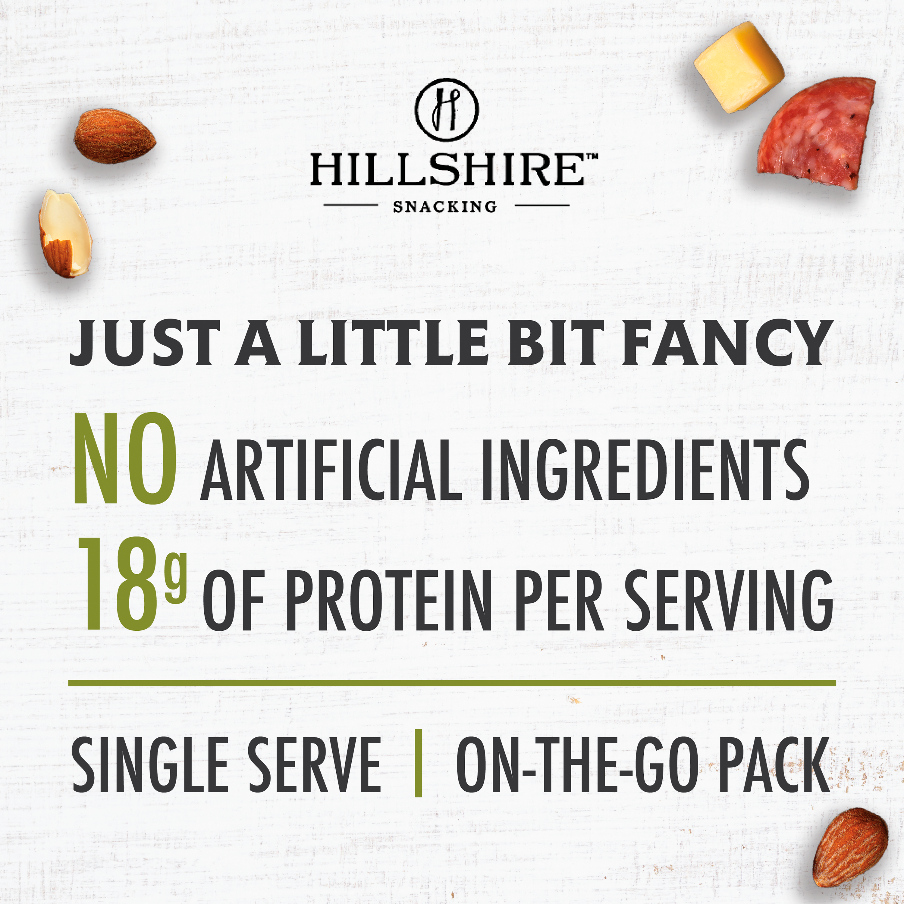 | Retail eCommerce Marketing Message | Enjoy a grown up take on snack time with Hillshire® Snacking Bistro Bites Genoa Salame Gouda Cheese and Salted Almonds. With this fancy snack pack, complementary flavors come together to deliver a gourmet snacking experience with no artificial ingredients. Ready to eat meat snack and perfectly portioned in a single serve pack for snacking on the go, these Bistro Bites provide 18 grams of protein per serving. For a tasty snack, tear open a package and enjoy. Includes one 2.8 oz package of Bistro Bites Genoa salame and Gouda cheese. We are big believers in a little thing called snack time. To us snacking is not about rushing or mindless eating, but about turning a few stolen moments into an elevated celebration worth savoring. We are here to turn snacking into an occasion, and you are invited. |