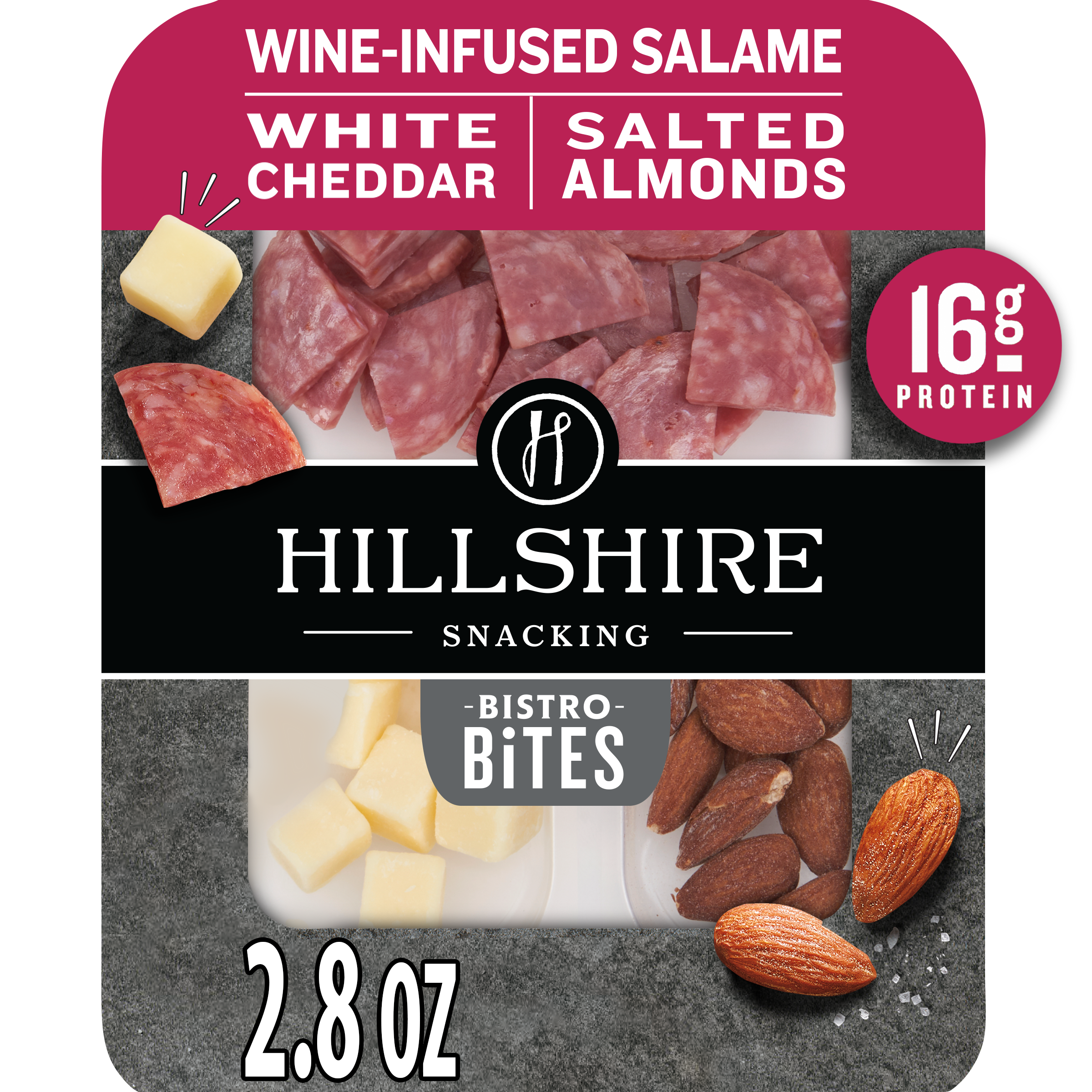 | Retail eCommerce Marketing Message | Enjoy a grown up take on snack time with Hillshire Snacking Bistro Bites Wine Infused Salami, White Cheddar Cheese and Salted Almonds. With this fancy snack pack, flavorful wine infused salami, delectable white cheddar cheese and a portion of salted almonds come together to deliver a premium snacking experience. Ready to eat and perfectly portioned in a single serve pack for snacking on the go, these Bistro Bites provide 16 grams of protein per serving. For a tasty snack, tear open a package and enjoy. Includes one 2.8 oz package of Bistro Bites wine infused salami, white cheddar cheese and salted almonds. Make every day feel a little more special with Hillshire Snacking. Snacking is viewed not as something rushed or mindless, but as an opportunity to transform a few quiet moments into an elevated experience worth savoring. The goal is to turn snacking into an occasion and everyone is invited to enjoy it. |