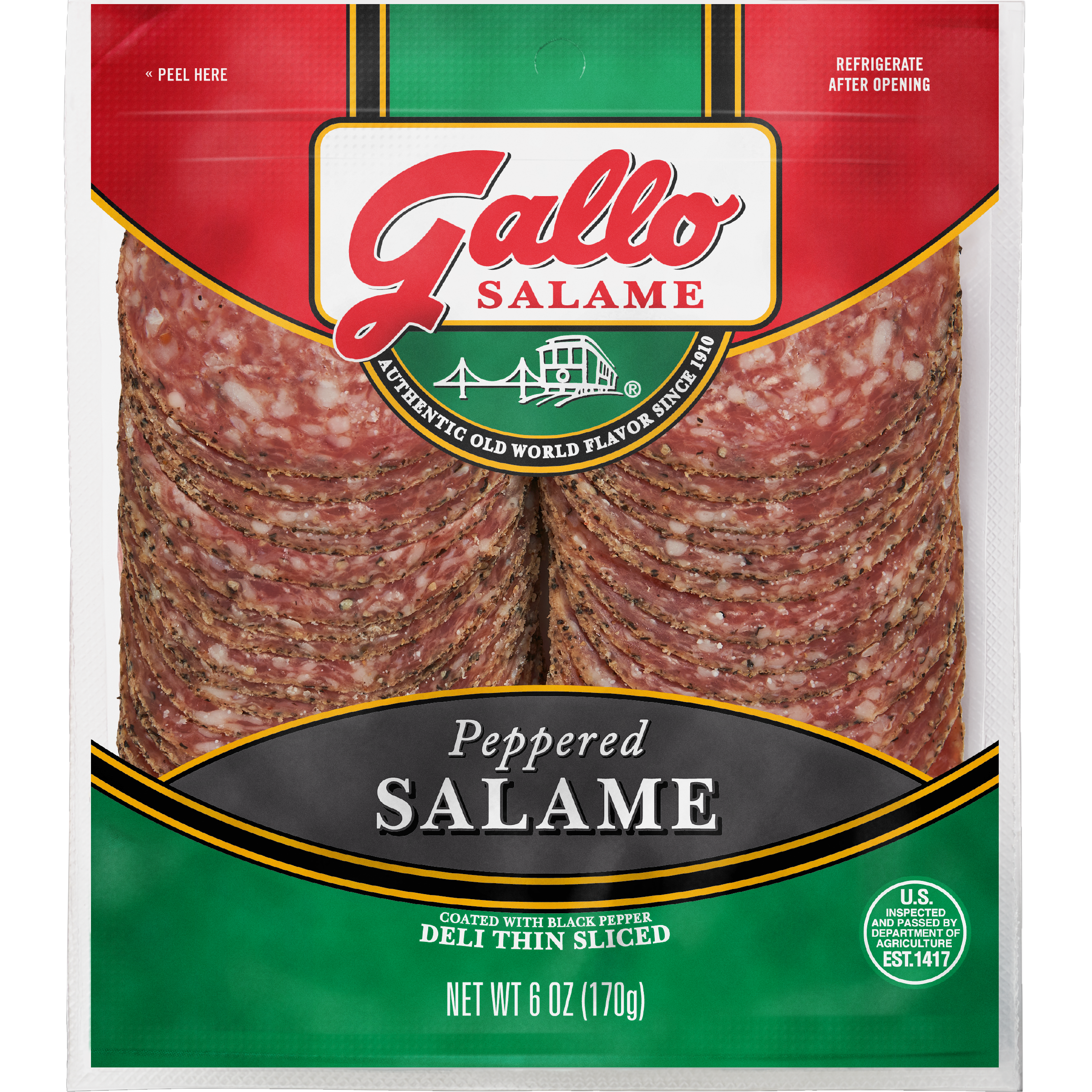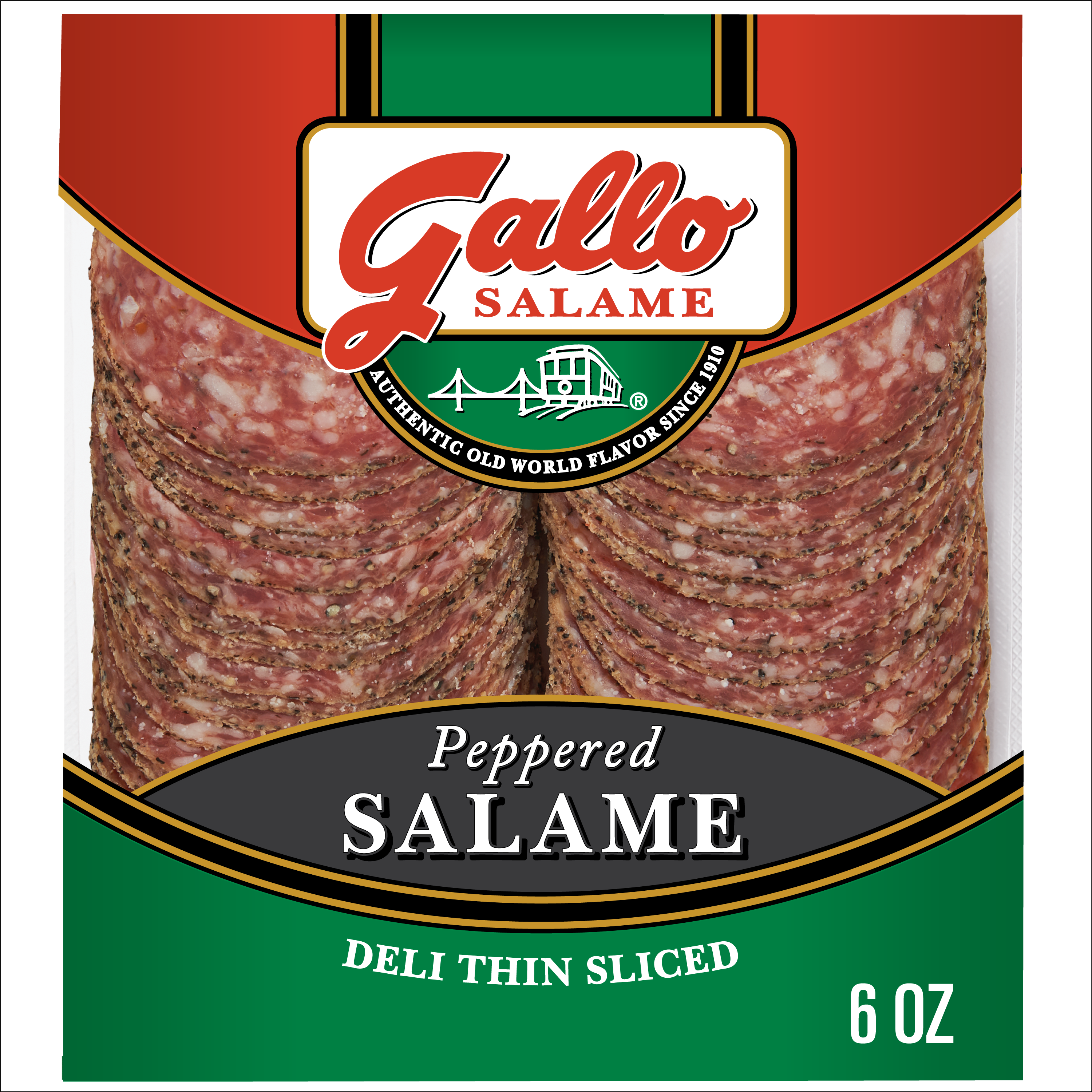 | Retail eCommerce Marketing Message | Bring the old world taste of Italy to your table with Gallo Salame Deli Thin Sliced Peppered Hard Salami Lunch Meat. This traditionally crafted salami is made with lean, high quality pork and seasoned with classic Italian spices. With 0 grams of trans fat per serving, this deli sliced salami is a zesty addition to any meal. Fully cooked and ready-to-eat , simply serve with pepperoni, provolone cheese, sliced tomatoes, and mixed greens on toasted ciabatta bread for a delicious Italian-inspired sandwich. Over 100 years ago, Gallo Foods was founded in the San Francisco Bay Area with a passion for making authentic Italian dry salami using an old-world process brought from Italy to America. As we've grown from a small family operation to becoming one of the nation’s leading producers of salami, we've stayed committed to making salami the old-fashioned way: with high quality pork, exceptional spices, and lots of care and attention. |