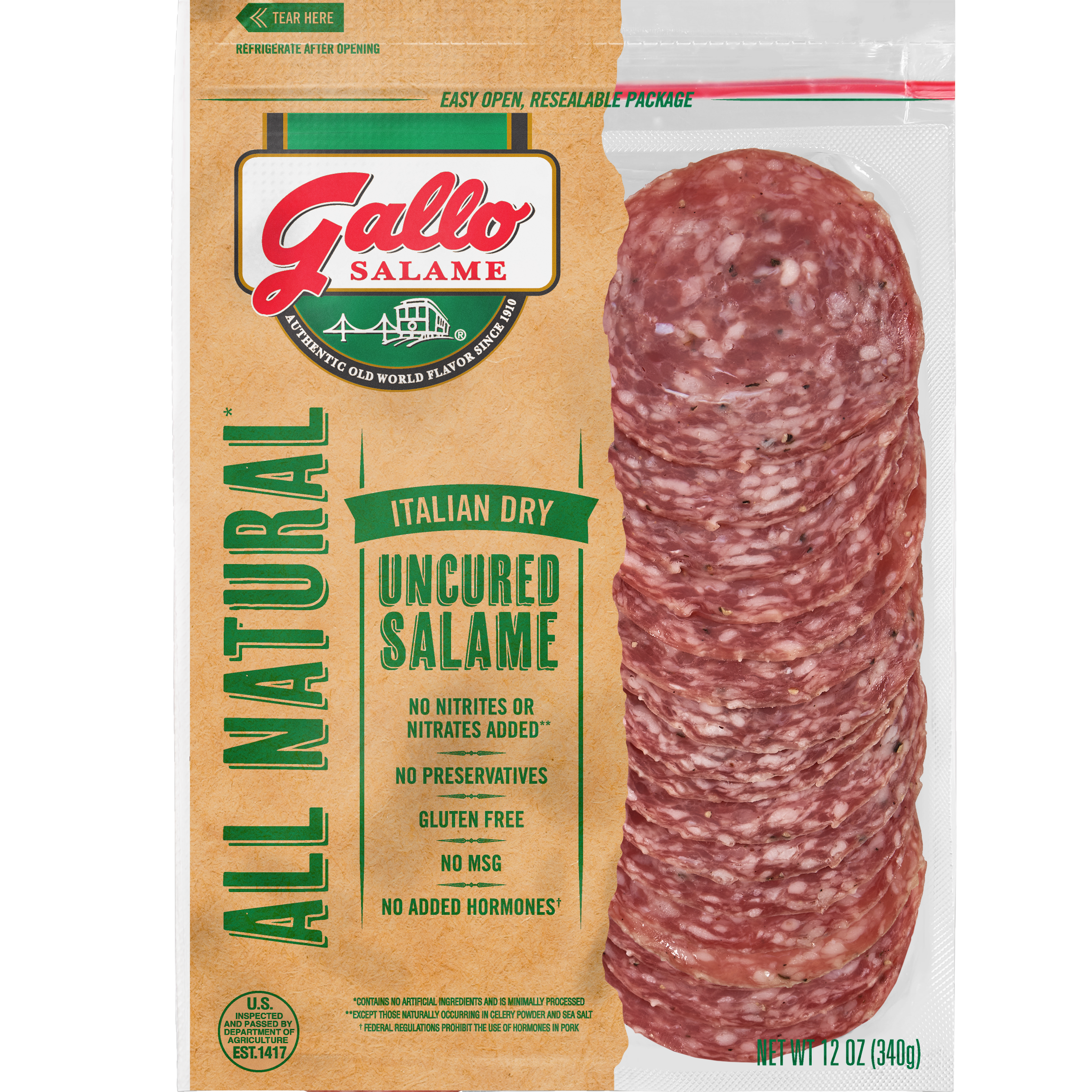 | Retail eCommerce Marketing Message | Bring the old world taste of Italy to your table with Gallo Salame Deli Thin Sliced All Natural Uncured Salami. Our traditionally crafted salami is made with lean, high quality pork and seasoned with classic Italian spices. With no nitrites or added hormones, this all natural* uncured salami is a zesty addition to any meal. Fully cooked and ready-to-eat , simply serve with pepperoni, provolone cheese, sliced tomatoes, and mixed greens on toasted ciabatta bread for a delicious Italian-inspired sandwich. Over 100 years ago, Gallo Foods was founded in the San Francisco Bay Area with a passion for making authentic Italian dry salami using an old-world process brought from Italy to America. As we've grown from a small family operation to becoming one of the nation’s leading producers of salami, we've stayed committed to making salami the old-fashioned way: with high quality pork, exceptional spices, and lots of care and attention. *Minimally processed, no artificial ingredients. |