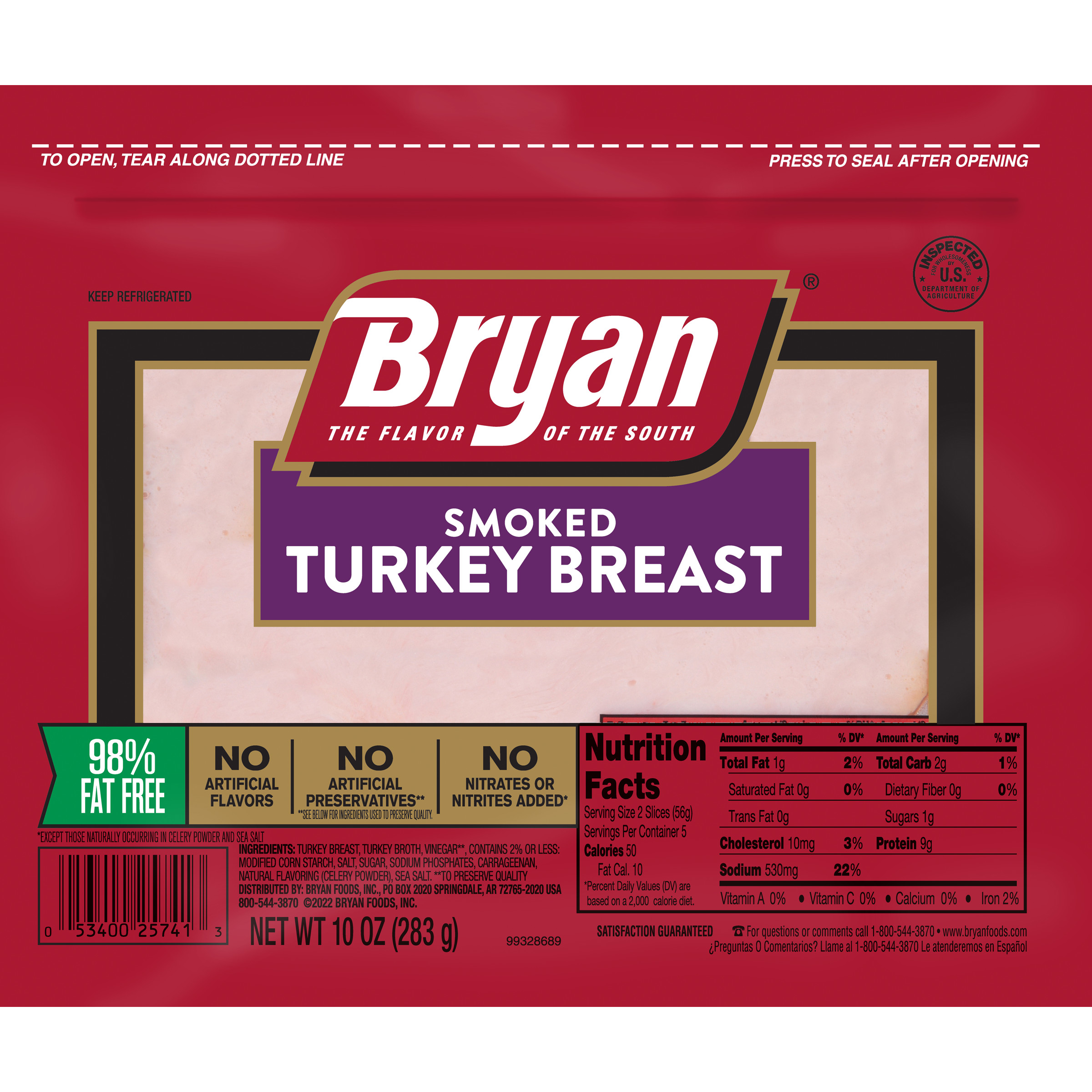 | Retail eCommerce Marketing Message | Enjoy the home-cooked flavors of the South with Bryan Smoked Turkey Breast Deli Lunch Meat. Sliced and seasoned to perfection, this turkey breast is juicy, smoky and 97% fat-free. Fully cooked and ready-to-eat , this lunch meat is a tasty addition to your sandwiches and wraps. Serve with mayo, bacon and tomato on sourdough for a delicious sandwich. Includes one 10 oz package of smoked turkey breast deli lunch meat. At Bryan Foods, everything we do is rooted in our Southern tradition. Founded by John H. Bryan, Sr. and his brother W.B. Bryan in West Point, Mississippi, Bryan Foods offers products that have been family favorites since 1936. Today, this legacy continues through our commitment to quality and the unique blend of spices in the original family recipes that we still use. |