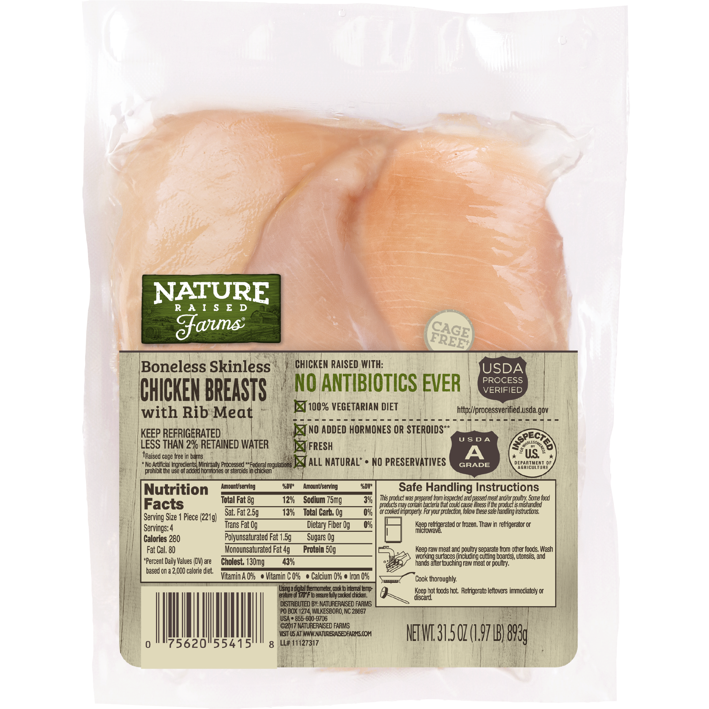 | Retail eCommerce Marketing Message | Start your grill and get cooking with NatureRaised Farms Boneless Skinless Chicken Breasts with Rib Meat. Our USDA Grade A Chicken is raised on a 100% vegetarian diet with no antibiotics ever for juicy, all-natural* chicken breasts that are perfect for all your favorite sauces, spice rubs, and marinades. Simply grill and serve with your favorite barbecue sauce for a quick weeknight dinner. At NatureRaised Farms, we believe the meats you set on your table should be as good as the care that goes into raising our animals. Our farmers share our commitment to bring you only tasty, wholesome chicken with no added hormones**, steroids**, or antibiotics ever. We think this is the right way to farm, and we hope you'll agree. At NatureRaised Farms, our values come through in every delicious bite. *Minimally processed, no artificial ingredients. **Federal regulations prohibit the use of added hormones or steroids in chicken. |