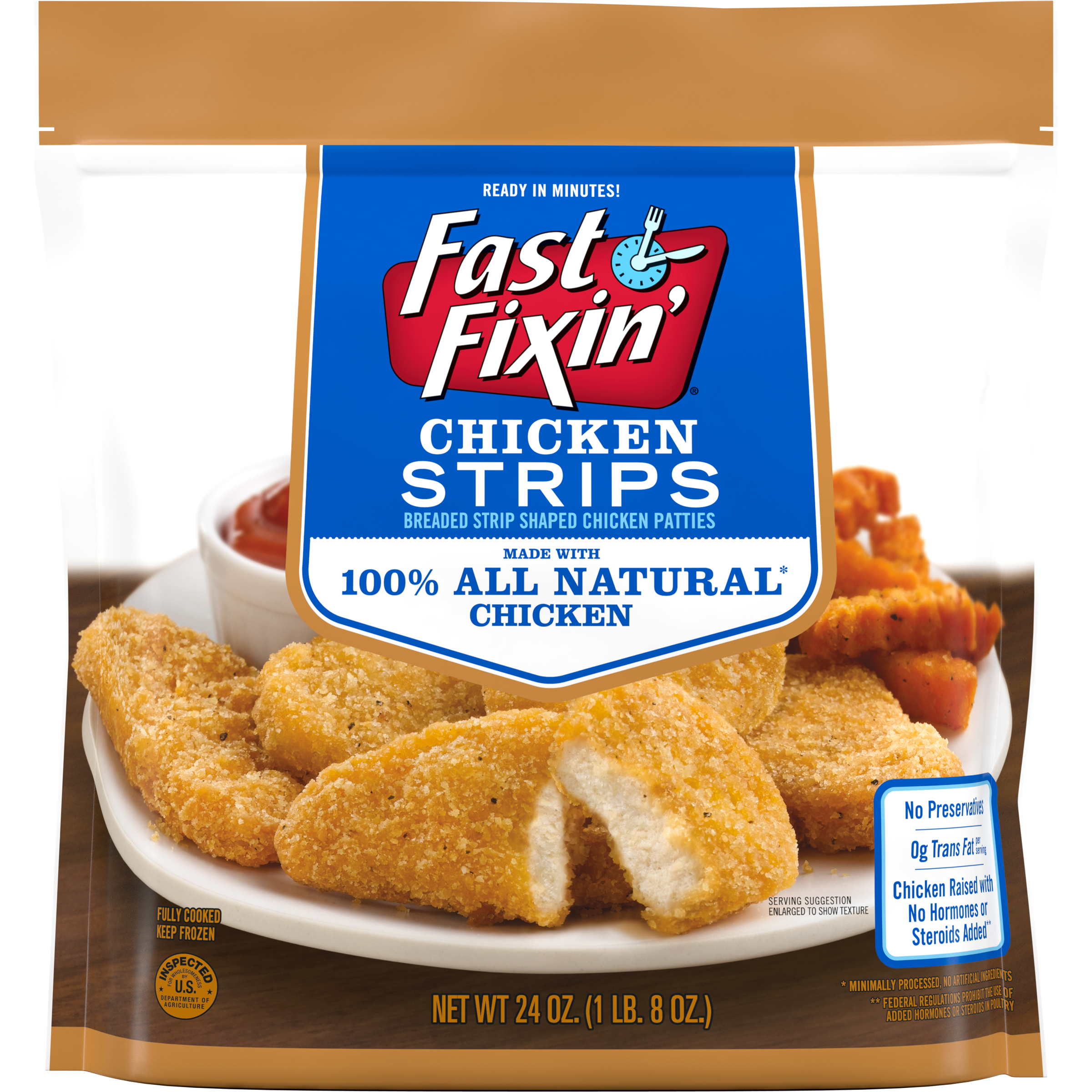 | Retail eCommerce Marketing Message | Enjoy a family favorite snack ready in minutes with Fast Fixin' Frozen Chicken Breast Strips. Made with 100% natural* chicken breasts from chicken raised with no hormones or steroids added**, these strip shaped chicken patties are seasoned and breaded to crispy perfection for a deliciously crunchy meal addition. These microwavable and oven ready white meat chicken strips provide 14 grams of protein per serving. For a tasty appetizer that is easy to prepare, heat and serve with a selection of your favorite dips. Includes one 24 oz package of 20 or more crispy chicken strips. *Minimally processed, no artificial ingredients **Federal regulations prohibit the use of added hormones or steroids in poultry |