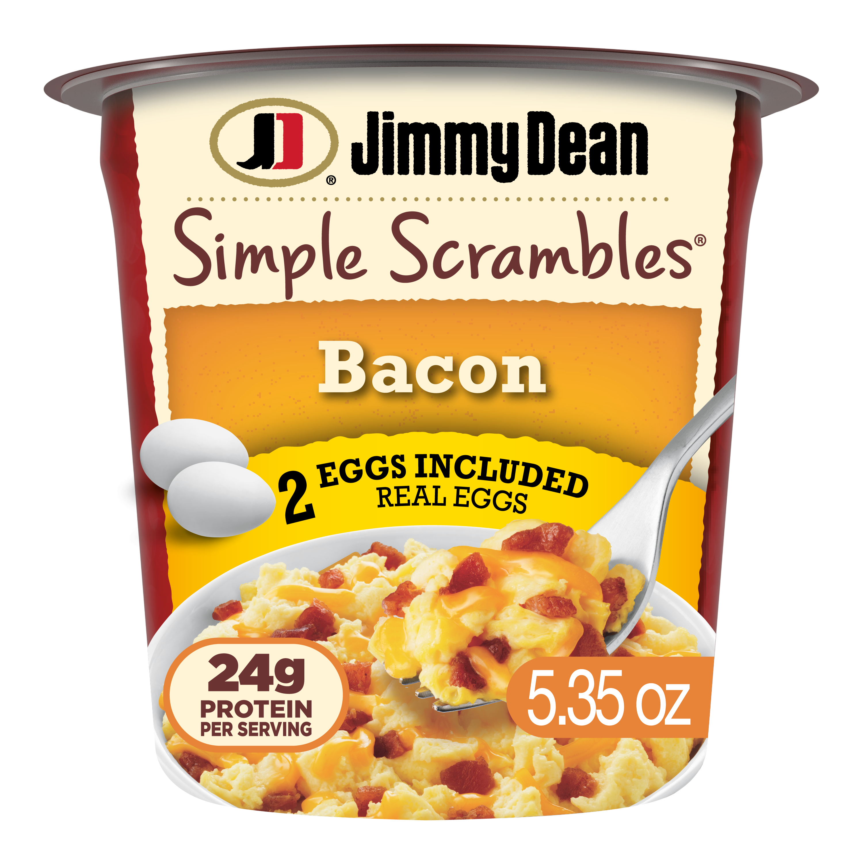 | Retail eCommerce Marketing Message | Wake up and enjoy a hearty breakfast in one simple cup with Jimmy Dean Simple Scrambles Bacon Breakfast Cup. Each scramble is made with two real eggs, crispy bacon, and cheddar cheese. Everything you need is included in the cup, and the scramble is ready in just seconds, making it ideal for a quick breakfast at home or on the go. To prepare, simply combine the ingredients, heat, and eat. Each microwave-safe portable cup contains one serving and is packed with 24 grams of protein to fill you up and fuel your day. Keep refrigerated until you’re ready to prepare your breakfast and get your morning started. |
