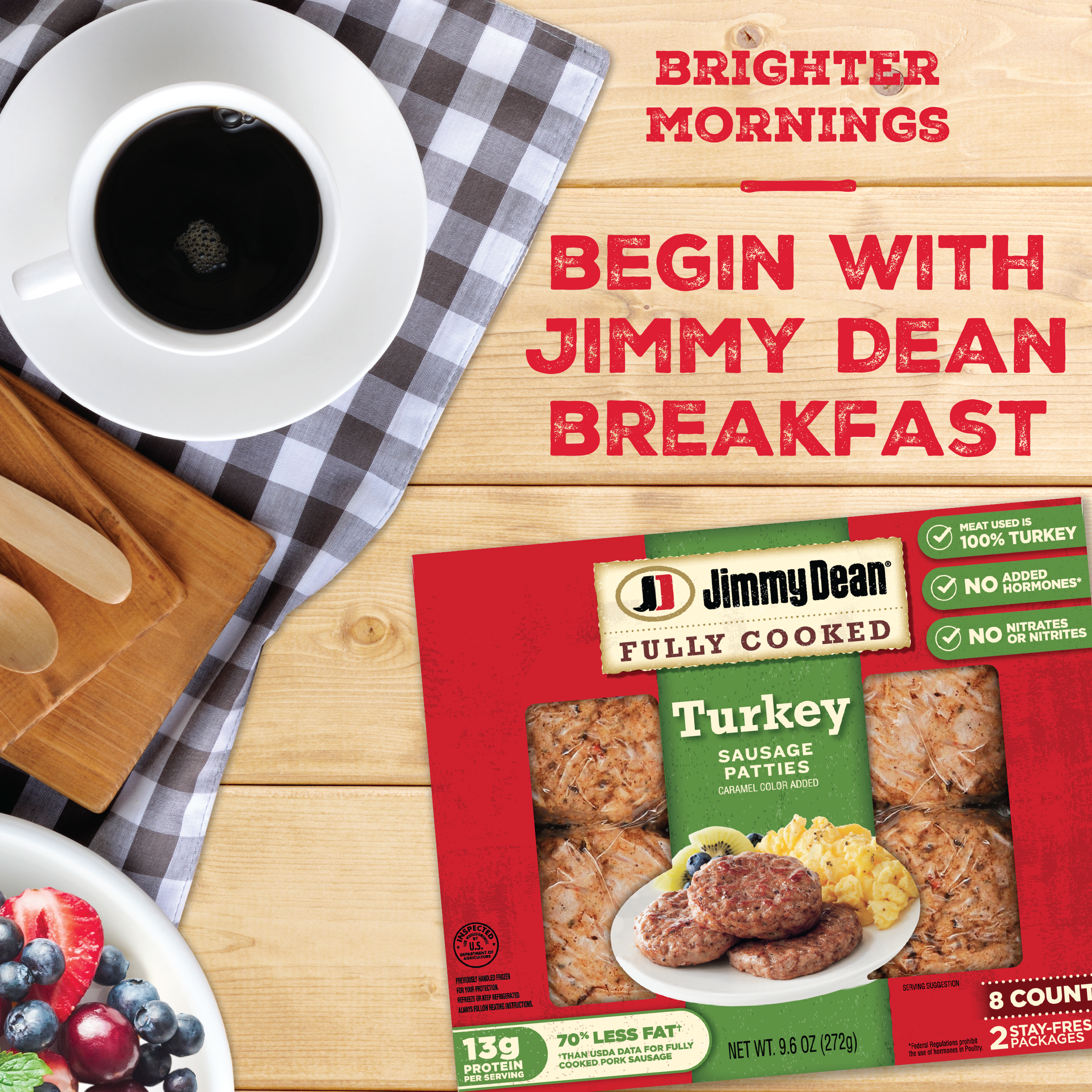 | Retail eCommerce Marketing Message | Jimmy Dean Fully Cooked Breakfast Turkey Sausage Patties are made with premium turkey and seasoned to perfection with a signature blend of spices. These savory sausage patties have 13 grams of protein per serving to provide more fuel to help power the day. Simple to prepare and ready in minutes, just microwave and serve Jimmy Dean turkey sausage with eggs and toast for a classic breakfast. |