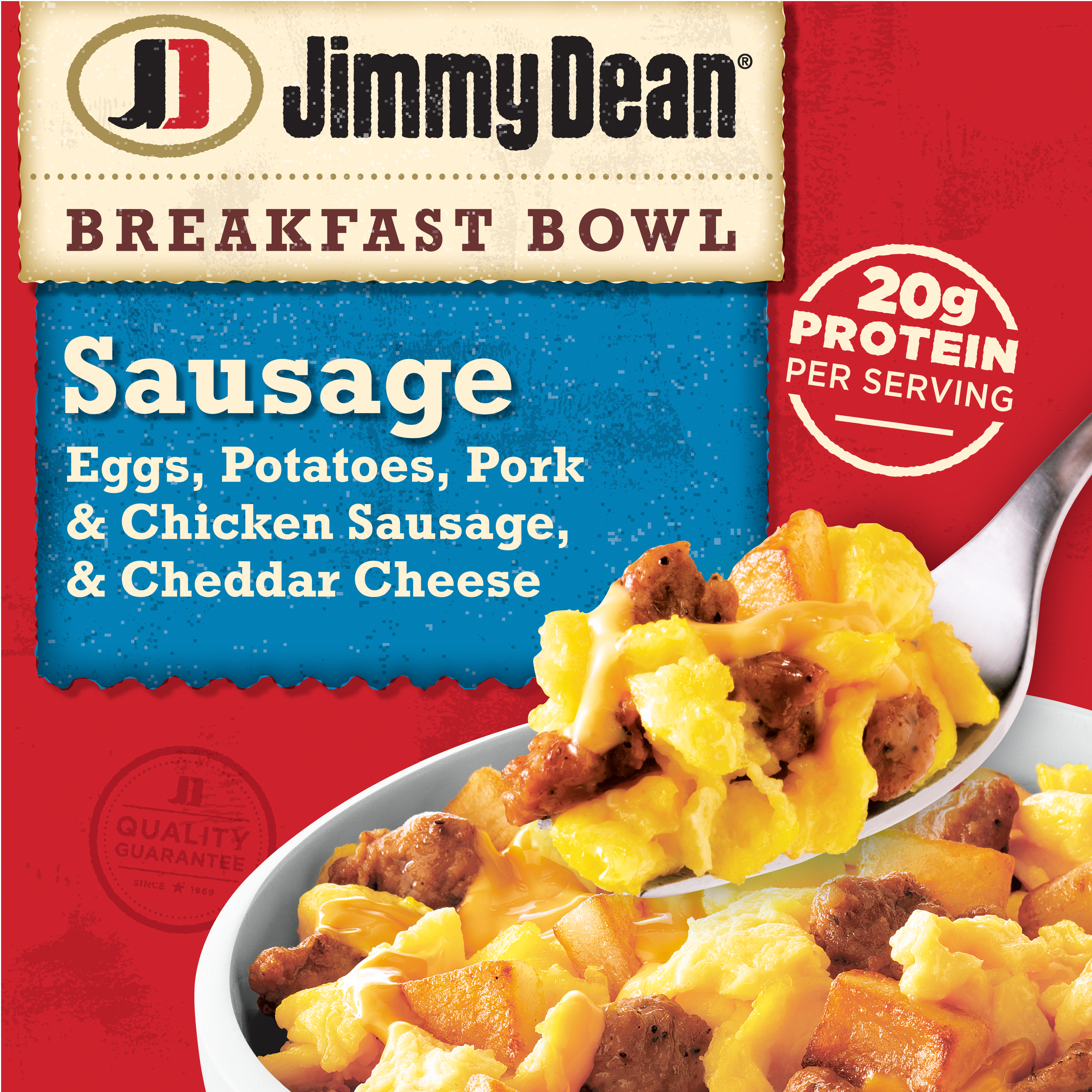 | Retail eCommerce Marketing Message | Filled with sausage crumbles, eggs, potatoes, and cheddar cheese, Jimmy Dean Sausage, Egg & Cheese Breakfast Bowls are sure to be the best part of the morning. Each microwavable bowl contains 20 grams of protein per serving. Simple to prepare and ready in minutes, this frozen breakfast bowl is made with premium ingredients and the Jimmy Dean brand quality known and trusted. |