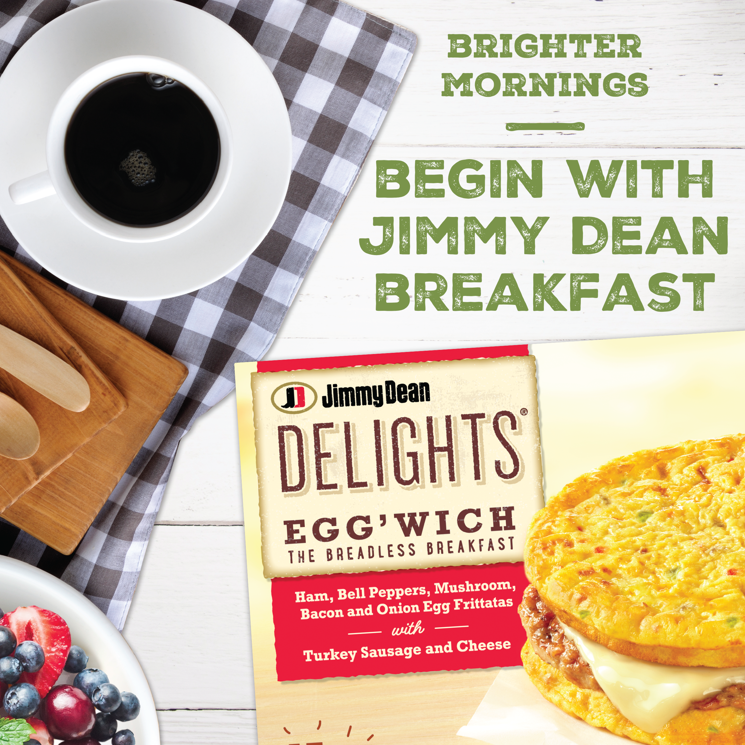| Retail eCommerce Product Title | Jimmy Dean Delights Egg’wich Breakfast Sandwiches with Ham, Bell Peppers, Mushroom, Bacon, and Onion Egg Frittatas with Turkey Sausage and Cheese, Breadless, Frozen, 4 Count |