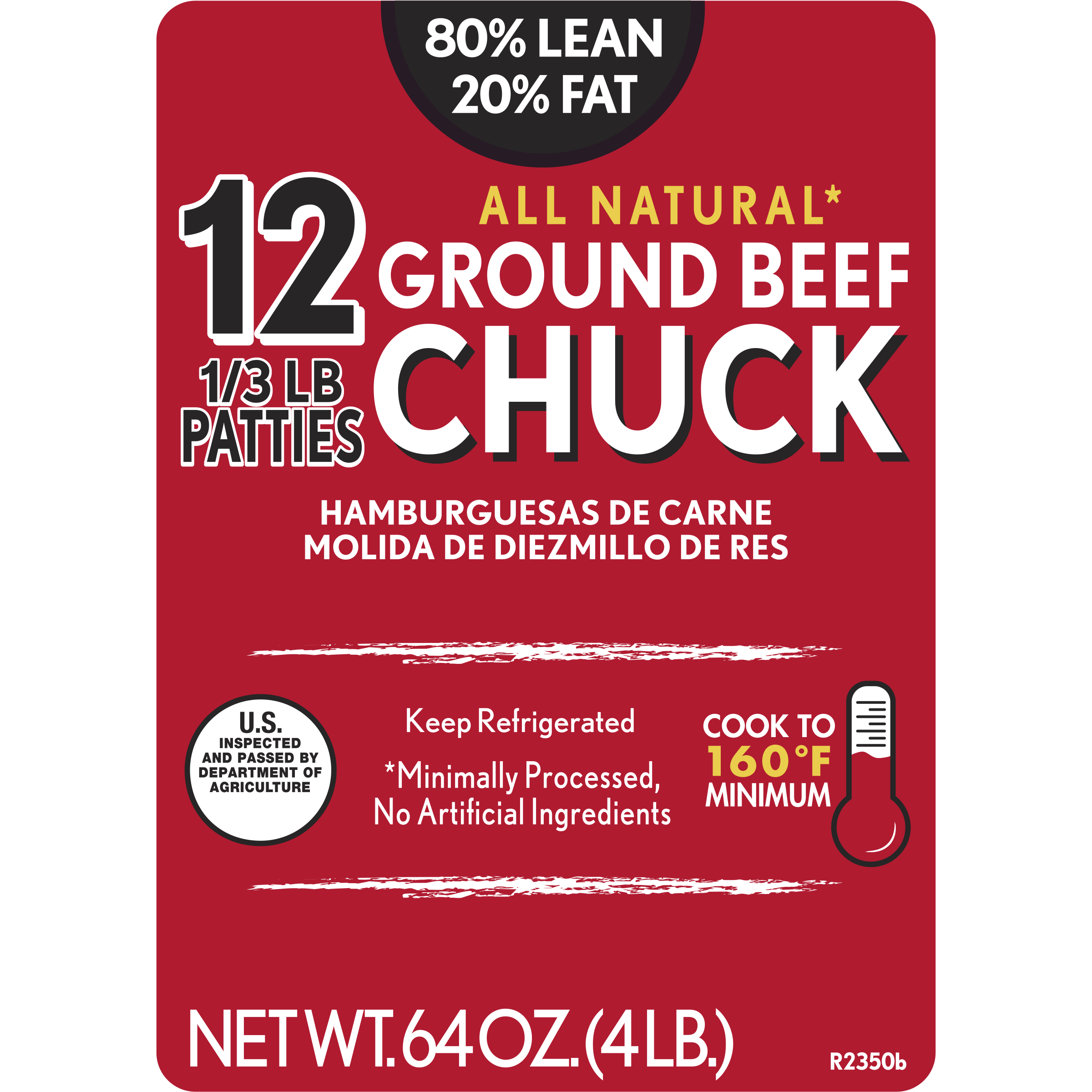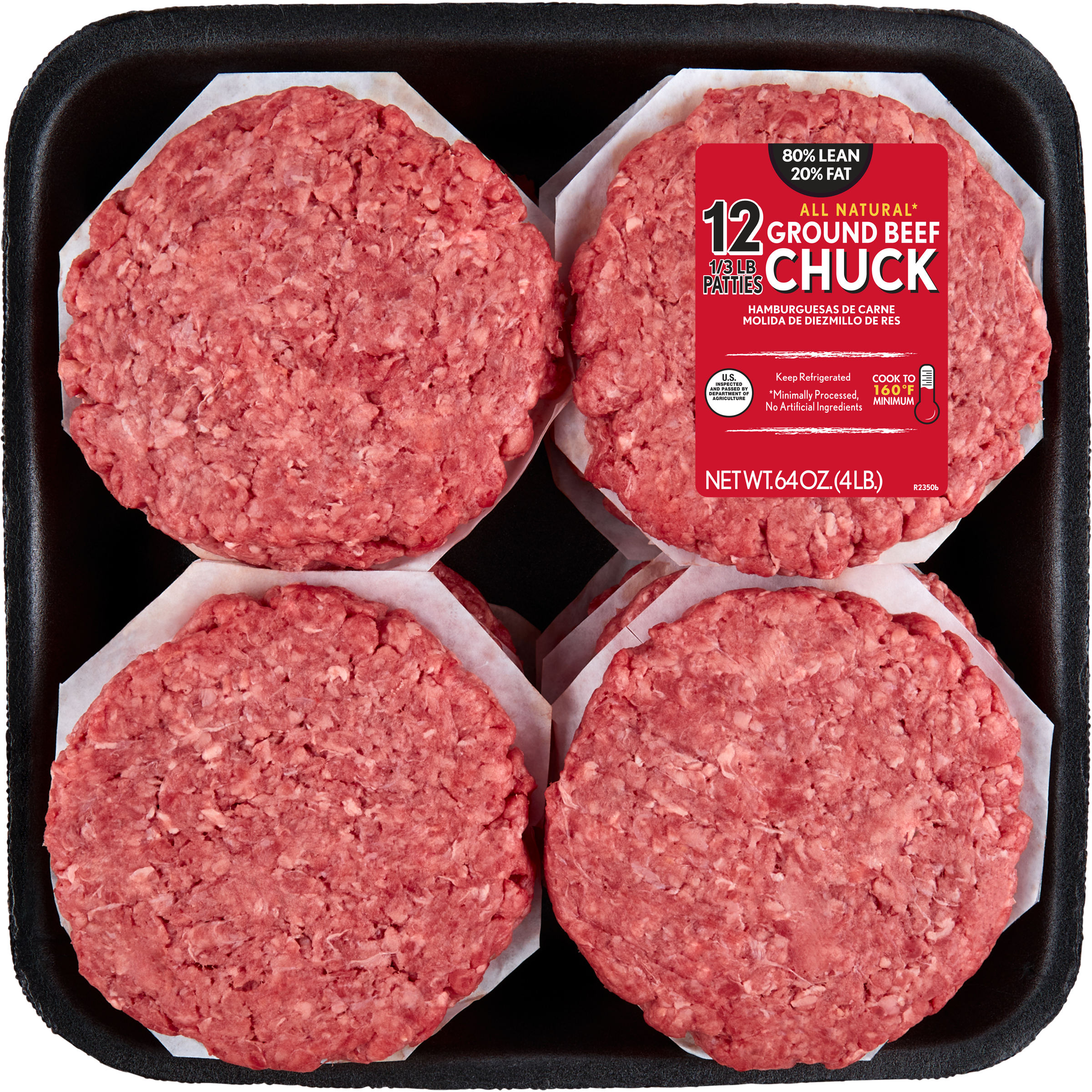 | Retail eCommerce Marketing Message | Start your grill and get cooking with All Natural 80% Lean/20% Fat Lean Ground Beef Chuck Patties. Made with quality USDA inspected beef and no artificial ingredients, our all natural* ground chuck patties are juicy, tender and wet aged for flavor. Our beef is an excellent source of protein, vitamin B6, vitamin B12, zinc, niacin, selenium and a good source of phosphorous, riboflavin and iron. All 9 essential nutrients are naturally found in beef and are a flavorful way to give your body nutrients to help power through the day. Great for sautéing or grilling, our ground beef is a delicious addition to your favorite recipes. Simply cook and serve with avocado, lettuce and tomato for a delicious weekend lunch. Ground Beef should be cooked to a safe internal temperature of 160°F. Includes one package. *Minimally processed, no artificial ingredients |