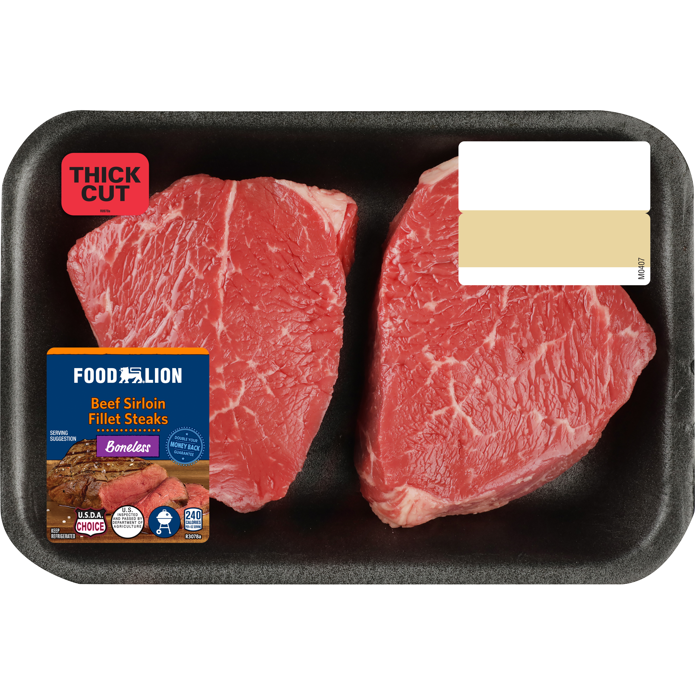| Retail eCommerce Marketing Message | There's nothing like cooking from scratch, especially when you start with Food Lion Sirloin Filet Steaks Thick Cut Boneless Beef. Made with premium quality USDA Choice Angus beef, our steak is a savory cut with natural tenderness and exceptional taste. Essential minerals are naturally found in beef and are a flavorful way to give your body nutrients to help power through the day. Great for grilling, our beef is a delicious addition to your favorite recipes. Simply marinate in balsamic vinaigrette for 2 to 6 hours, season with black pepper, grill and serve with steamed potatoes and broccoli. For medium rare beef, the internal temperature should read 145°F, and the temperature for medium beef should read 160°F. Includes one package. |