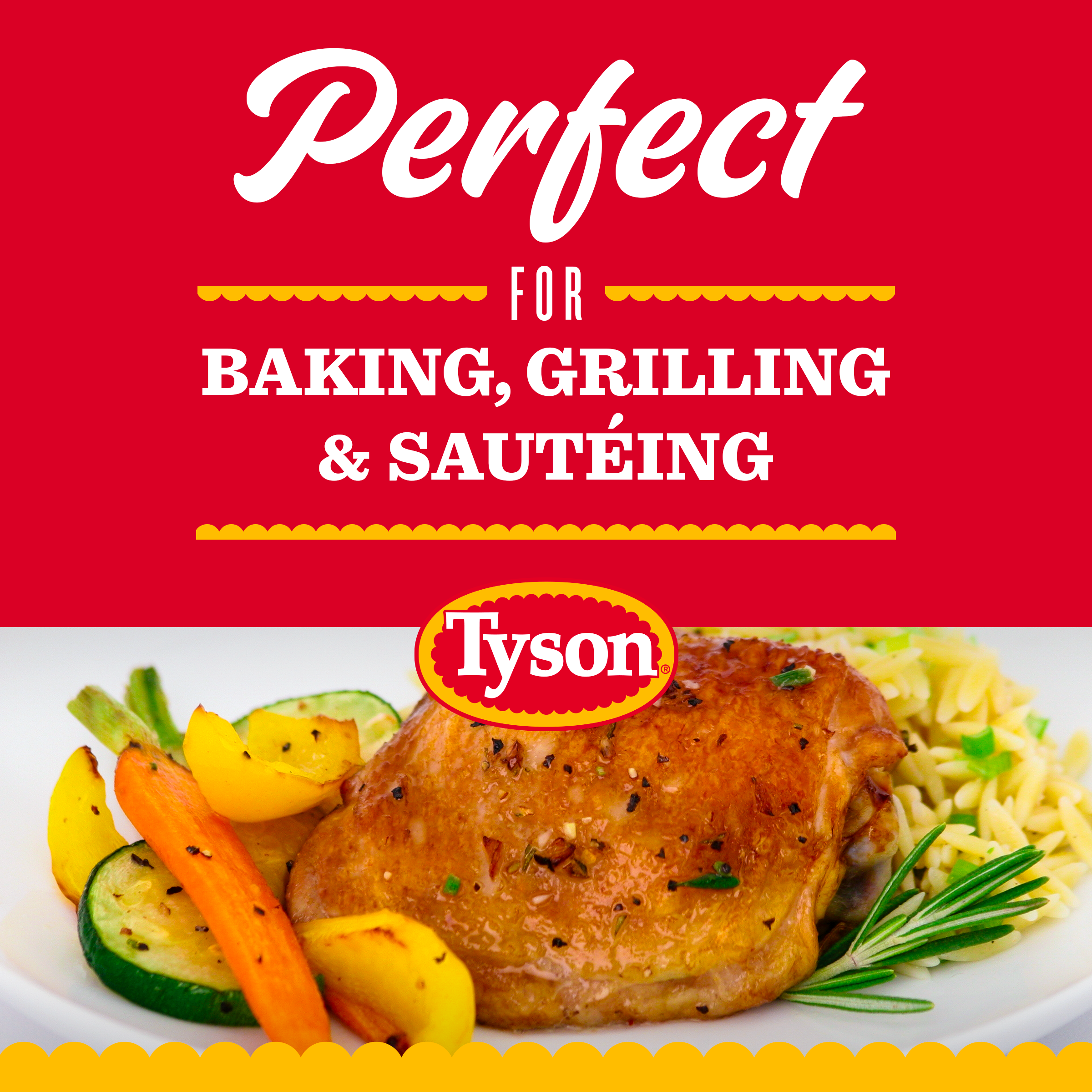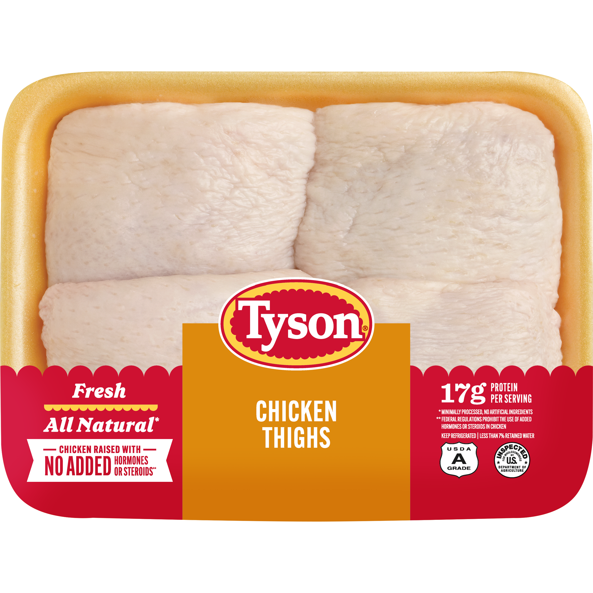 | Retail eCommerce Marketing Message | There's nothing like cooking from scratch, especially when you start with Tyson Chicken Thighs. Our all-natural* chicken is juicy and tender. Perfect for grilling and roasting, simply cook and serve our chicken thighs with BBQ sauce for a quick and delicious weeknight dinner. Includes one 2.32 lb. package, weight may vary. Everything seems to turn out a whole lot better when you just keep it simple. No nonsense. Just stick to the good stuff. The 100% real stuff that makes life, and chicken, great. With farm raised chicken of the highest quality, we keep it real in everything we do. Keep it real. Keep it Tyson. *Minimally processed, no artificial ingredients. |
