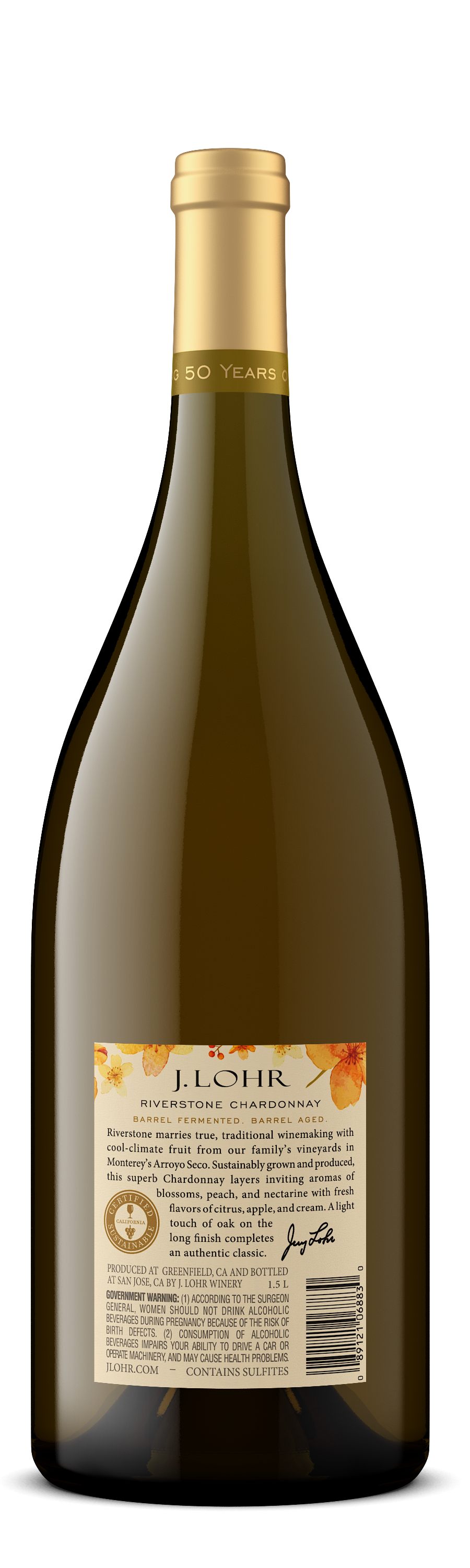 | Description | Barrel fermented. Barrel aged. The J. Lohr Estates Riverstone Chardonnay marries true, traditional winemaking with cool-climate fruit from our family’s vineyards in Monterey’s Arroyo Seco. Sustainably grown and produced, this superb Chardonnay layers inviting aromas of blossoms, peach, and nectarine with fresh flavors of citrus, apple, and cream. A light touch of oak on the long finish completes an authentic classic. This wine has earned the Certified California Sustainable seal. |