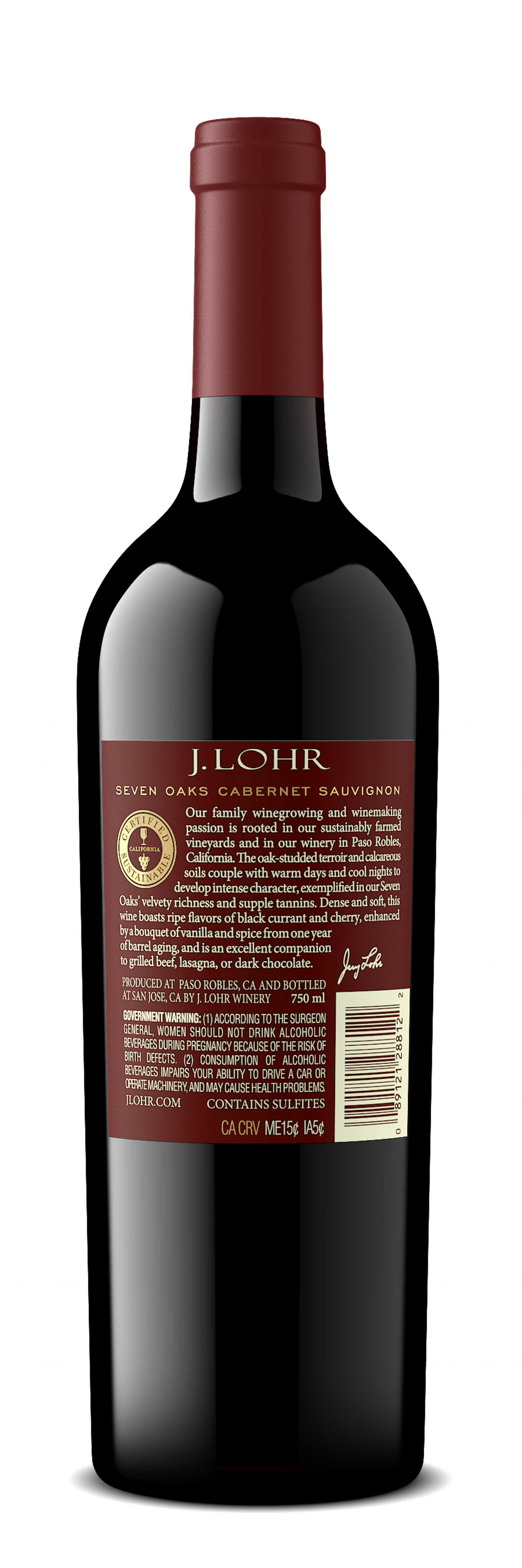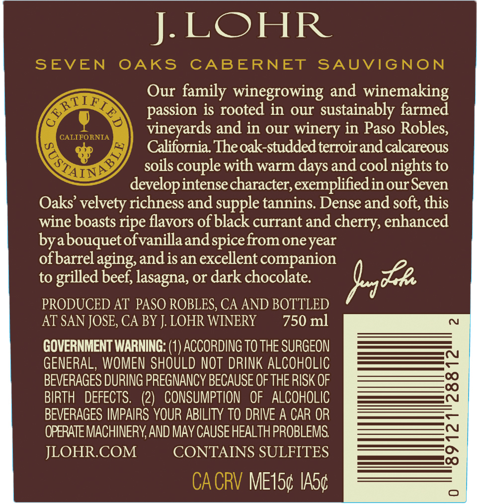 | Description | The J. Lohr Estates Seven Oaks Cabernet Sauvignon shows ripe fruit aromas of black cherry and currant accented by notes of toasted pastry, hazelnut, and vanilla from our authentic barrel aging program. Big, juicy red-fruit flavors infuse the palate while softly textured tannins lead to a long, gratifying finish. This wine has earned the Certified California Sustainable seal. |