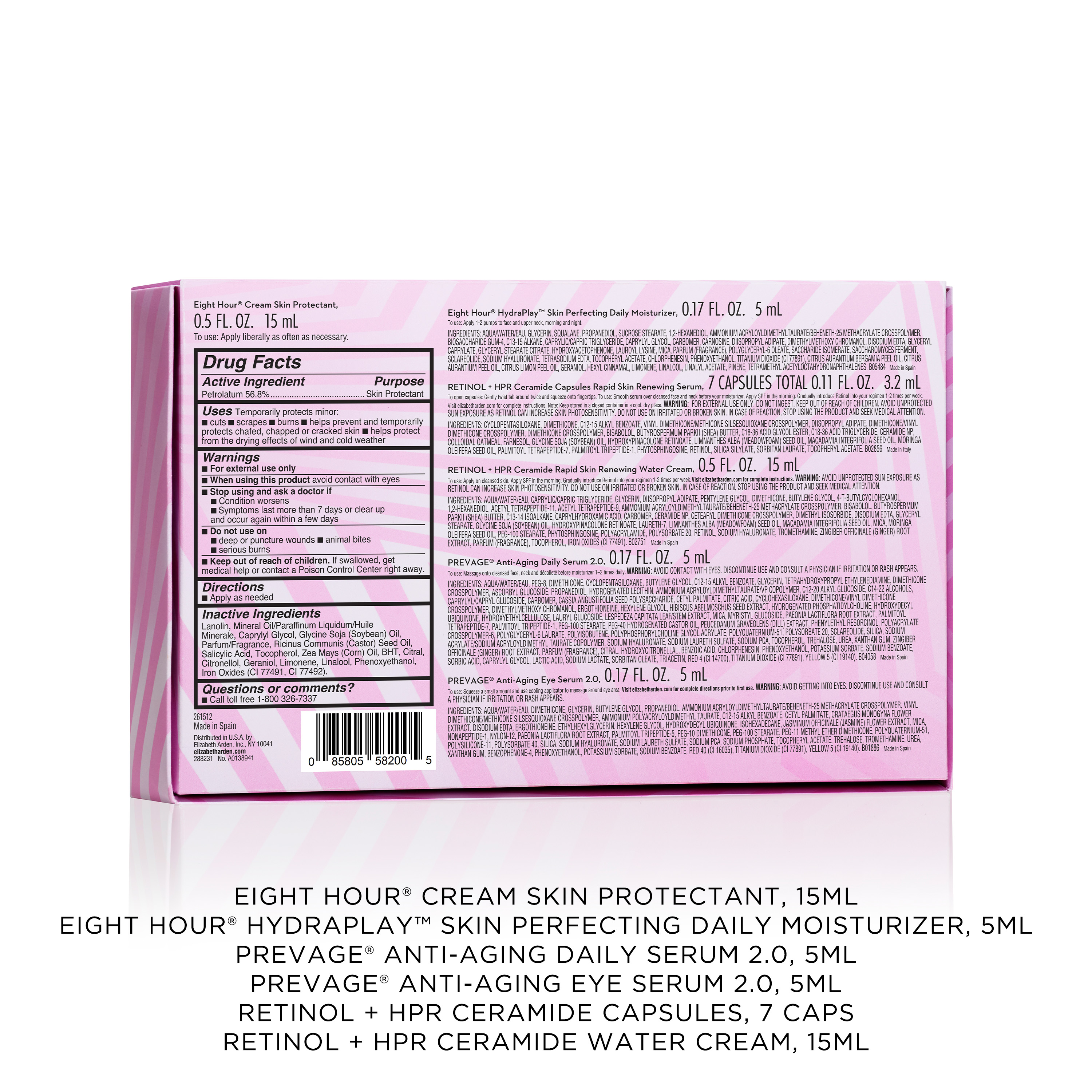 Prestige - Division Elizabeth Arden Prestige - House OTHER ARDEN HSE Brand Other Skincare Prestige - Segment MAKEUP Product Category Prepacks Product Subcategory Prepack Product Segment Gift Sets Product Launch Season - EMEA 2026-H1 Short Description Discover The Little Icons 6-Piece Skincare Gift Set with PREVAGE® serums, Retinol + HPR Ceramide treatments, Eight Hour® balm and HydraPlay™ cream. Directions for use Morning Routine Apply PREVAGE® Anti-Aging Daily Serum 2.0 to cleansed face and neck. Gently pat PREVAGE® Anti-Aging Eye Serum 2.0 around the eye area. Follow with Eight Hour® HydraPlay™ Skin Perfecting Daily Moisturizer for hydration and a smooth makeup base. Evening Routine Apply one Retinol + HPR Ceramide Capsule to face and neck. Layer with the Water Cream for overnight hydration. When using retinol in the evening, always apply SPF the following morning. Anytime Care Use Eight Hour® Cream Skin Protectant as needed on face, lips, or dry areas to soothe, protect, and nourish. Material/SKU A0138943 Product ID 7273457000 EAN-13 0085805582005