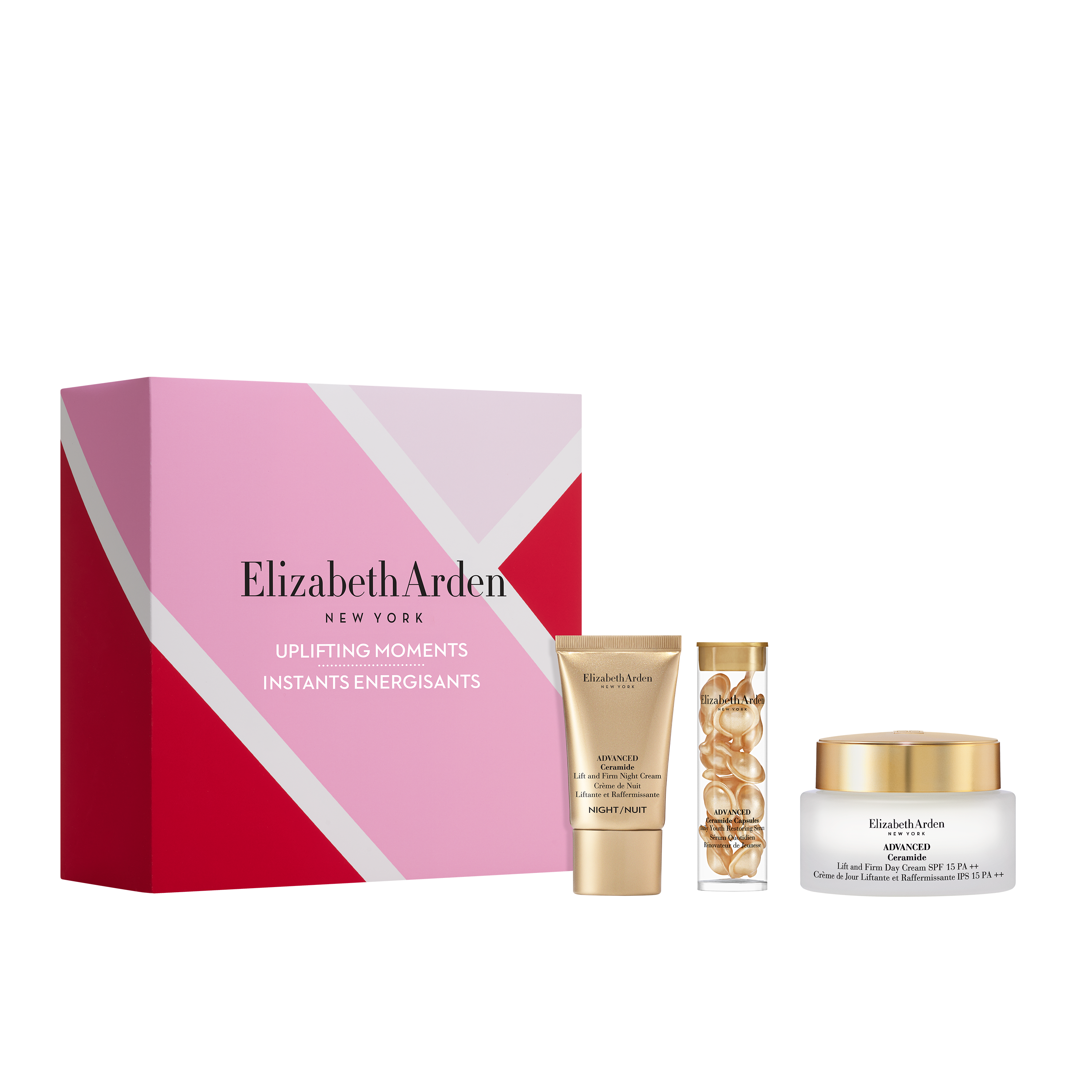 Prestige - Division Elizabeth Arden Prestige - House CERAMIDE SKINCARE HSE Brand Ceramides Prestige - Segment SKINCARE Product Category Prepacks Product Subcategory Prepack Product Segment Multiproduct Sets Product Launch Season - EMEA 2026-H1 Short Description A youth-restoring trio with Ceramide Capsules, Day Cream SPF 15 and Night Cream to smooth lines, firm contours and hydrate for radiant, sculpted skin. Directions for use Twist open one capsule and apply the serum to cleansed face and neck. In the morning, smooth the Day Cream SPF 15 over face and neck using upward motions. At night, gently pat the Night Cream onto face and neck to lift and firm while you sleep. Material/SKU A0140107 Product ID 7274667000 EAN-13 0085805284381