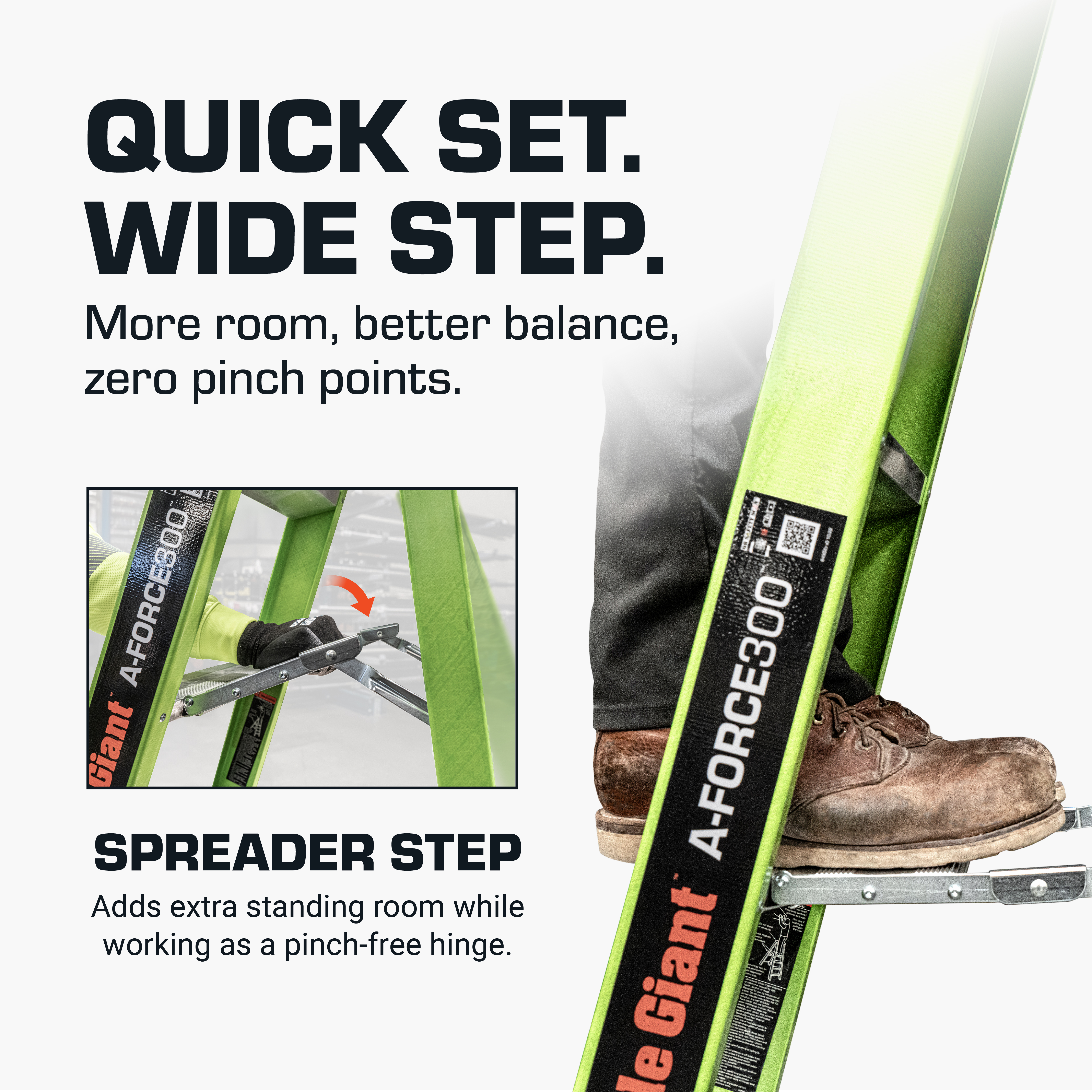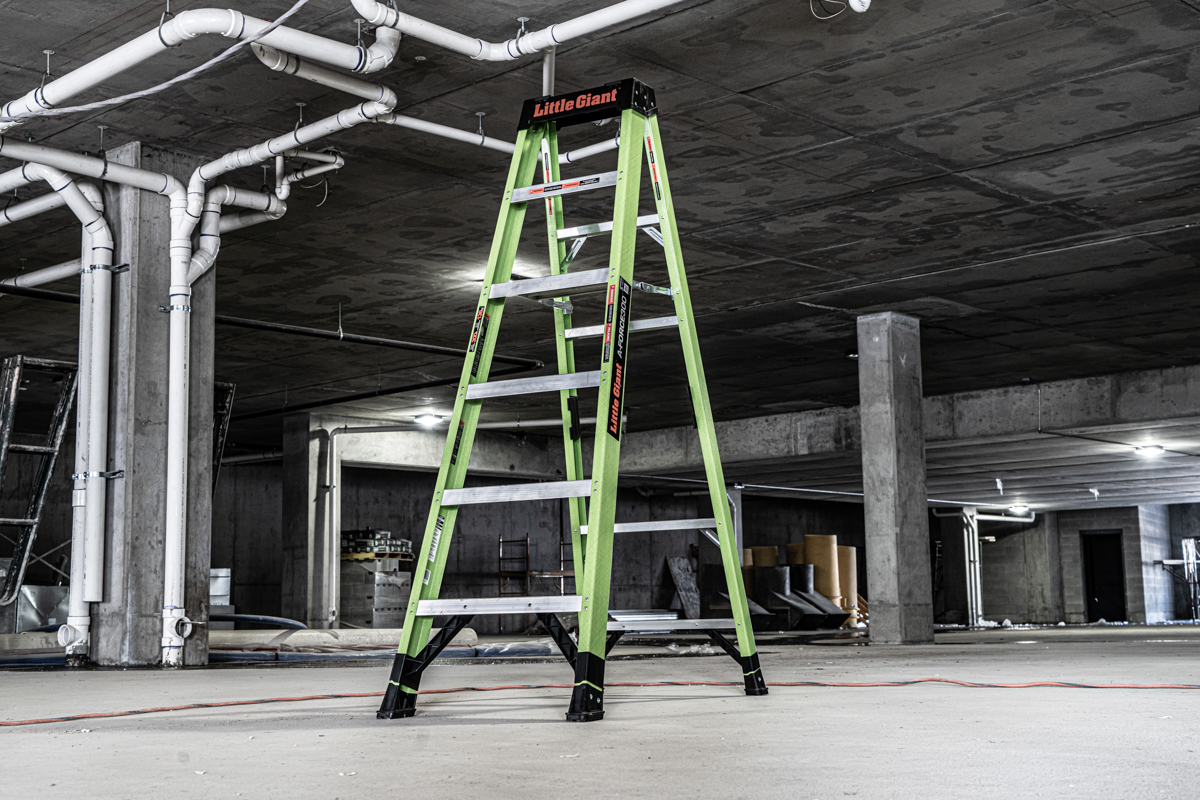 Material Fiberglass Duty Rating (Weight) 300 lbs. Country of Origin China Ladder Weight (lbs) 23 Stepladder Max Reach (in.) 124 Stepladder Max Highest Standing Level (in.) 46 Stepladder Min Highest Standing Level (in.) 46 Stepladder Minimum Footprint (in.) 43 Stepladder Maximum Footprint (in.) 43 Storage Height (in.) 72 Storage Width (in.) 24 Storage Depth (in.) 7 Top Width (in.) 14.5 Clear Width (in.) 13.4 Inside Clear Width (in.) 13.4 Outer Rung Width (in.) 3 Freight Class 300 Freight Class Description AL and/or FG Ladder NMFC 156600-11 Shipping Method FedEx Shipping Length (Ft.) 6' 2" Shipping Length (in.) 74 Shipping Width (Ft.) 2' 1" Shipping Width (in.) 25 Shipping Height (Ft.) 0' 7.25" Shipping Height (in.) 7.25 Ship Weight 28.5 Pallet Size 48 x 40 x 5 Palletized Length 74 Palletized Width 48 Palletized Height 48 Palletized Weight 410 Qty per Pallet 16 Number of Pallets 1 Number of Pallets in a 53' Truck 16 Number of Ladders in a 53' Truck 256 Stackable Pallets No Marketing Collateral https://images.salsify.com/image/upload/s--XOy425Ba--/r5cm7sfooxtn1q3dry6m.pdf Marketing Description A-Force300 Step Ladder, Type IA - Extra Heavy Duty, 6ft Short Marketing Copy A-FORCE300,6',1A,FG A-FRM LDDR-RTL PLCRD Long Marketing Copy The A-Force300™ isn’t just another A-frame. It’s built from non-conductive, jobsite-tough fiberglass for safe, all-in performance where electrical hazards live. The patent-pending 5" spreader step gives you extra room to plant your feet—more comfort, more control, more confidence. It locks in fast with a one-handed motion, cutting setup time and eliminating pinch points from outdated spreader bars. Up top, the heavy-duty cap turns into a mobile workstation. Load it with drill bits, fasteners, tape, drills, even full-size cans. It’s also compatible with the Little Giant® Ladders Work Bench (sold separately) for a full tabletop setup that keeps your gear close and your workflow tight. Down below, the A-Force300™ digs in with slip-resistant, non-marring feet that grip any surface and protect finished floors. The reinforced brace design cranks up the stability, while field-replaceable feet mean long-term reliability you can count on. Molded hand grips make carry and transport fast, easy, and comfortable—even when the job isn’t. Tough yet lightweight, this ladder hauls heavy, moves light, and keeps you visible with high-impact Hi-Viz green. Built for safety. Built to move. Built for the grind. Type IA. Rated to 300 lbs. OSHA and ANSI compliant. Marketing Bullet 1 SINGLE-HAND SETUP. FULL-FOOT COMFORT The patent-pending 5" spreader step gives you more room to work for serious balance and comfort. It opens fast with one hand to keep you moving and eliminates pinch points, unlike old-school spreader bars. Marketing Bullet 2 BUILT-IN WORKSTATION The tool tray top cap keeps your gear where it belongs—right at the top. Drills, bits, fasteners, clip-ons, screwdrivers, even paint cans. A magnetic tray holds the small stuff tight, and accessory ports unlock more storage with Little Giant® Ladders accessories. Marketing Bullet 3 ROCK-SOLID, SLIP-RESISTANT FEET Heavy-duty feet grip any surface without marking floors, and swap out fast when worn. Reinforced with a rock-solid brace design, this setup stays steady under pressure—no slips, no wobbles. Marketing Bullet 4 CARRY WITH EASE Molded hand grips at the balance points make it easy to carry and control, while also keeping the ladder secure during transport to prevent it from opening. Marketing Bullet 5 CURRENT-PROOF CONFIDENCE. Working hot? Our exclusive fiberglass blend is lightweight, jobsite-tough, and built to block live current. Marketing Bullet 6 HARD TO MISS. EASY TO SPOT. Our Hi-Viz Green Fiberglass is science-backed and jobsite-tested. Engineered in the most visible color on the light spectrum to stay seen and prevent accidents before they happen. Marketing Bullet 7 300 LBS OF UNSHAKABLE SUPPORT Type IA rated, this ladder exceeds OSHA and ANSI standards and is built to handle up to 300 lbs with unwavering reliability. Marketing Bullet 8 AMERICAN INNOVATION Designed and engineered in the USA, this ladder is packed with homegrown innovations. Full stateside oversight ensures top-notch quality so your ladder’s ready to take on the toughest jobs.