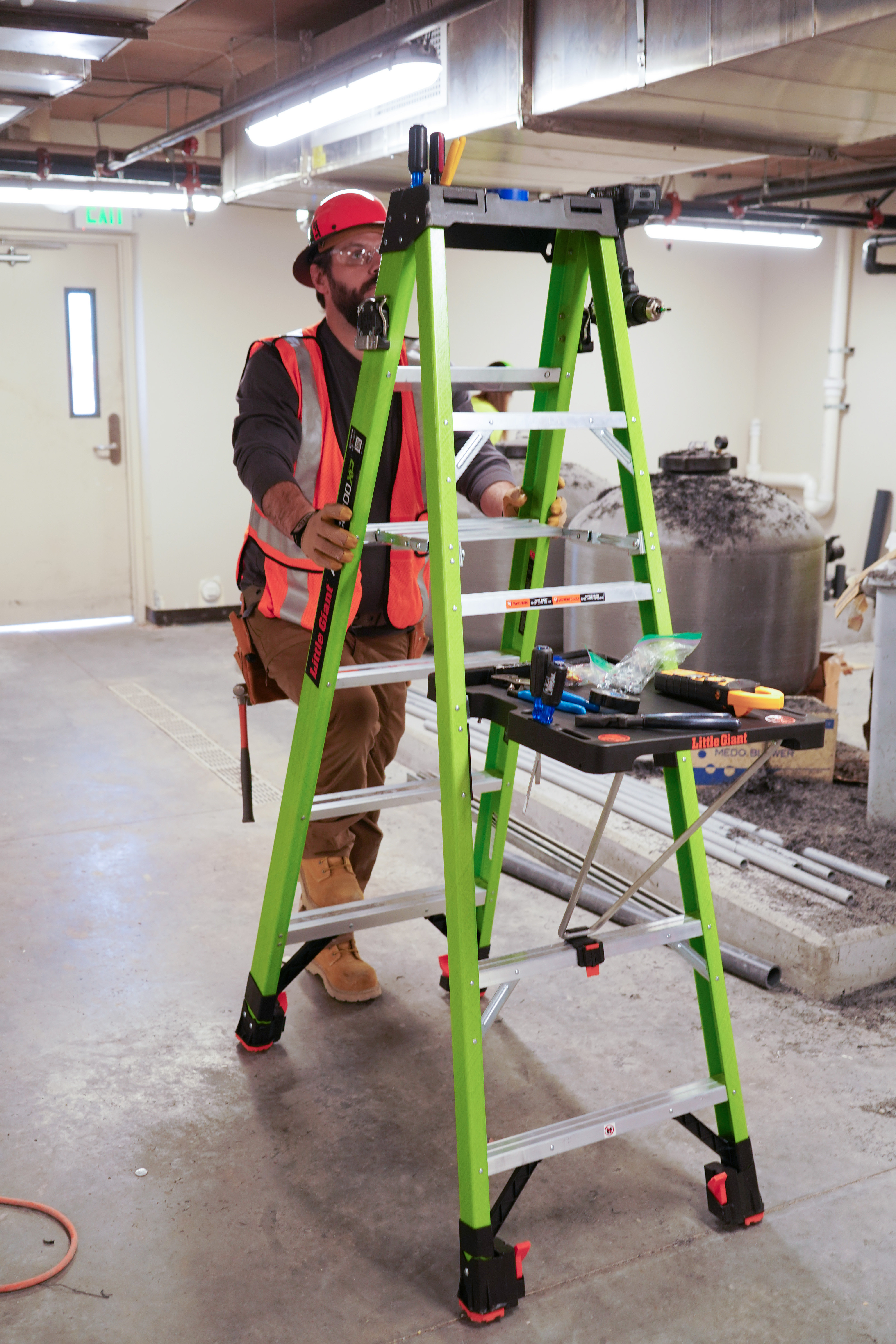 Material Fiberglass Duty Rating (Weight) 300 lbs. Country of Origin China Ladder Weight (lbs) 26.5 Stepladder Max Highest Standing Level (in.) 46 Stepladder Min Highest Standing Level (in.) 46 Stepladder Minimum Footprint (in.) 43 Stepladder Maximum Footprint (in.) 43 Storage Height (in.) 72 Storage Width (in.) 24 Storage Depth (in.) 7 Top Width (in.) 14.5 Outer Rung Width (in.) 3 Pallet Size 48 x 40 x 5 Palletized Length 74 Palletized Width 48 Palletized Height 75 Palletized Weight 502 Qty per Pallet 20 Number of Pallets 1 Number of Pallets in a 53' Truck 16 Number of Ladders in a 53' Truck 320 Stackable Pallets No Marketing Collateral https://images.salsify.com/image/upload/s--ZqADYAxH--/x9drfncm5tto5mbpaxps.pdf Marketing Description A-Force300XP Step Ladder, Type IA - Extra Heavy Duty, 6ft Short Marketing Copy The A-Force™ 300XP is a pro-grade step ladder loaded with smart features. The one-hand, 5-inch Comfort Step opens fast and gives you more room to stand with better balance. HoverGlide™ Feet make it easy to roll and reposition—wheels engage when you move, then lock down when you climb. Use the built-in platform as a mobile workbench, strong enough for your tools and laptop. Quick-draw holsters and a top tool tray keep everything within reach. Accessory ports let you customize your setup to fit the task. Non-conductive Hi-Viz Green fiberglass keeps you visible and protected. Type IA rated to hold 300 pounds and built in the USA, the A-Force™ 300XP is made to take the hard hits and keep working. Long Marketing Copy The A-Force™ 300XP is built for pros who demand more from their gear. Every feature is designed to make your work faster, safer, and more efficient. The patent-pending 5-inch Comfort Step opens easily with one hand and gives you a wider, more stable surface to stand on. No spreader bars. No pinch points. Just full-foot comfort and solid balance every time you climb. When it’s time to move, HoverGlide™ Feet make it easy. Spring-loaded wheels engage when the ladder moves, then lock automatically when you step on. Stay put as long as you need with manual locks that keep the wheels disengaged until you're ready to roll again. The A-Force™ also doubles as your mobile workbench. The platform is big enough for your laptop and strong enough for your tools, giving you a stable surface to plan and prep when you're off the ladder. Built-in accessory ports work with Little Giant add-ons so you can customize your setup to match the job. Quick-draw tool holsters on both sides keep your go-to gear close, each holding up to 10 pounds. Up top, a built-in tool tray organizes drills, bits, fasteners, and even paint cans. A magnetic zone holds small parts in place, and accessory ports give you even more ways to store what you need. Carrying the A-Force™ is just as smart. Molded hand grips at the balance points give you control during transport and keep the ladder secure while you move. The non-conductive fiberglass blend is lightweight, durable, and helps block live current. And the Hi-Viz Green color? It’s engineered to be the most visible on the light spectrum to help reduce accidents on the job. Rated Type IA and built to handle up to 300 pounds, the A-Force™ 300XP exceeds OSHA and ANSI standards. Designed and engineered in the USA, it’s packed with innovation and ready for the demands of real jobsite work. Marketing Bullet 1 SINGLE-HAND SETUP. FULL-FOOT COMFORT The patent-pending 5" spreader step gives you more room to work for serious balance and comfort. It opens fast with one hand to keep you moving and eliminates pinch points, unlike old-school spreader bars. Marketing Bullet 2 MOVES WHEN YOU MOVE. LOCKS WHEN YOU DON’T. Spring-loaded wheels on the HoverGlide™ Feet make it easy to roll and reposition the ladder. Step on, and they lock in place. Step off, and you're ready to move again. Staying put for a while? Manual locks keep the wheels disengaged until you're ready to roll. Marketing Bullet 3 ALL-IN WORKBENCH Big enough for your laptop, tough enough for your tools. Doubles as an extended workbench when you're off the ladder, giving you a solid surface to plan, prep, and get it done. Built-in accessory ports are compatible with Little Giant add-ons—so you can customize your setup to fit the job. Marketing Bullet 4 GEAR UP AND GO Quick-draw tool holsters on both sides for fast, hassle-free access. Built to hold up to 10 lbs each, keeping your essentials secure, close, and ready for action. Marketing Bullet 5 BUILT-IN WORKSTATION The tool tray top cap keeps your gear where it belongs—right at the top. Drills, bits, fasteners, clip-ons, screwdrivers, even paint cans. A magnetic tray holds the small stuff tight, and accessory ports unlock more storage with Little Giant® Ladders accessories. Marketing Bullet 6 CARRY WITH EASE Molded hand grips at the balance points make it easy to carry and control, while also keeping the ladder secure during transport to prevent it from opening. Marketing Bullet 7 CURRENT-PROOF CONFIDENCE. Working hot? Our exclusive fiberglass blend is lightweight, jobsite-tough, and built to block live current. Marketing Bullet 8 HARD TO MISS. EASY TO SPOT. Our Hi-Viz Green Fiberglass is science-backed and jobsite-tested. Engineered in the most visible color on the light spectrum to stay seen and prevent accidents before they happen. Marketing Bullet 9 300 LBS OF UNSHAKABLE SUPPORT Type IA rated, this ladder exceeds OSHA and ANSI standards and is built to handle up to 300 lbs with unwavering reliability. Marketing Bullet 10 AMERICAN INNOVATION Designed and engineered in the USA, this ladder is packed with homegrown innovations. Full stateside oversight ensures top-notch quality so your ladder’s ready to take on the toughest jobs.