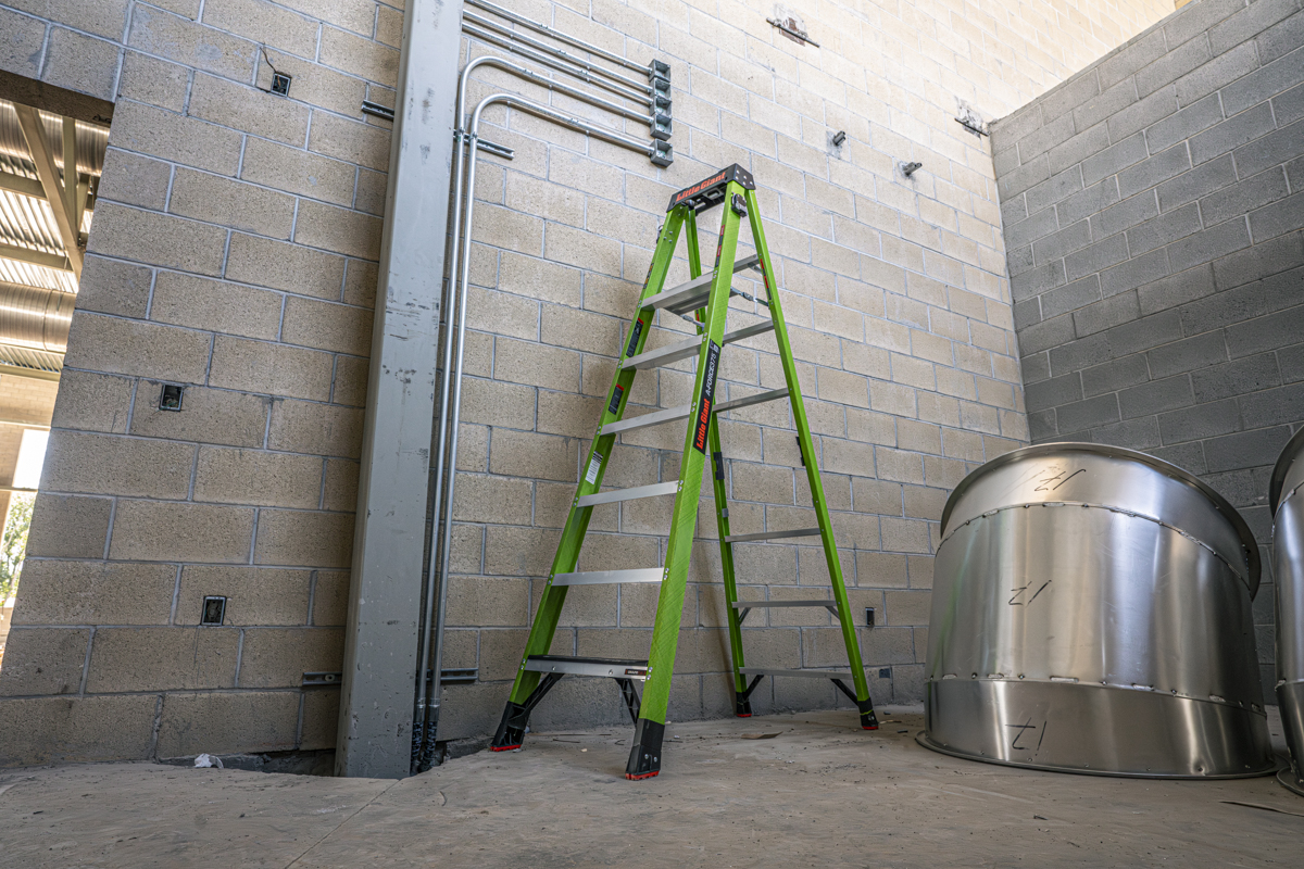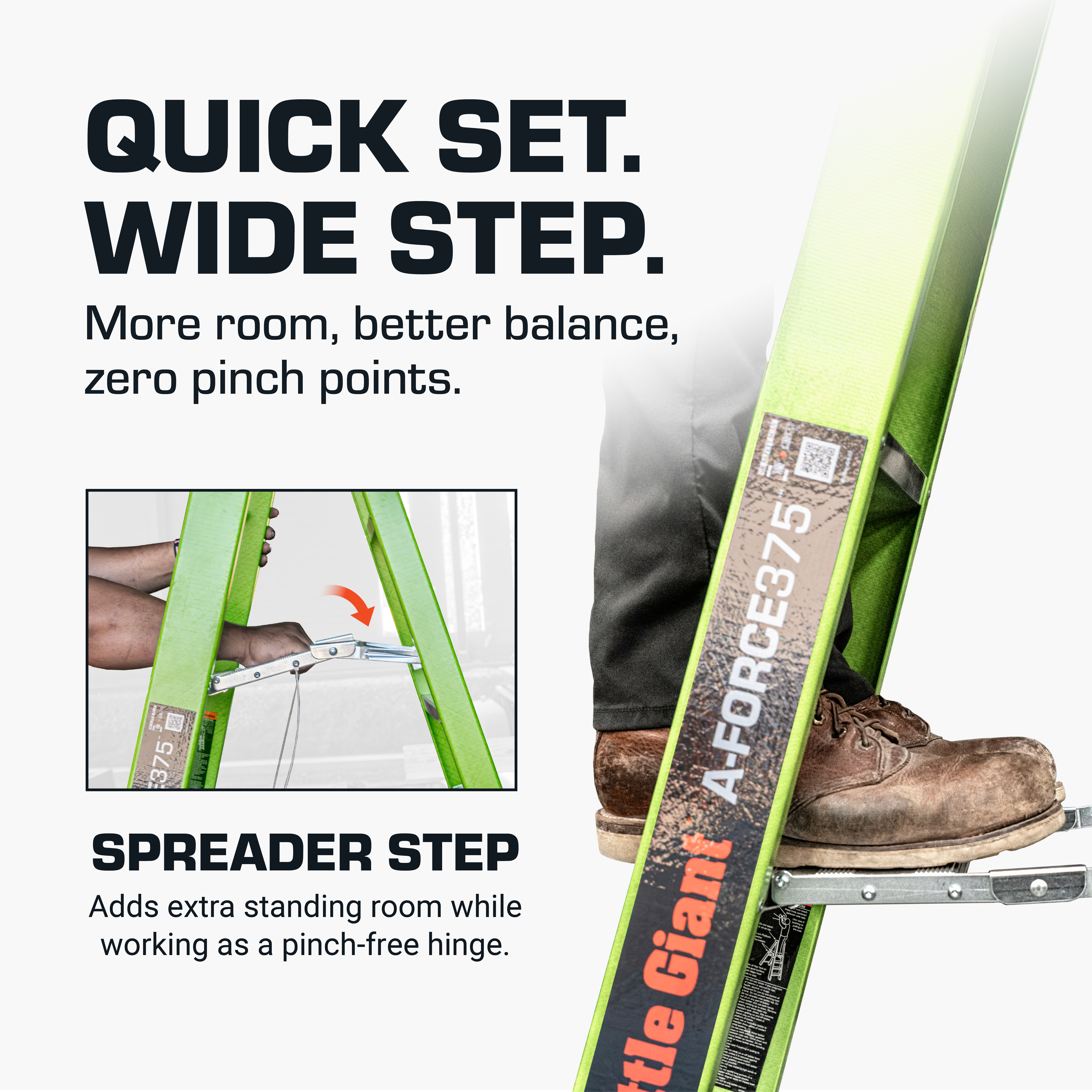 Material Fiberglass Country of Origin China Ladder Weight (lbs) 32 Stepladder Max Highest Standing Level (in.) 69 Stepladder Min Highest Standing Level (in.) 69 Stepladder Minimum Footprint (in.) 56 Stepladder Maximum Footprint (in.) 56 Storage Height (in.) 96 Storage Width (in.) 27 Storage Depth (in.) 7 Top Width (in.) 14.5 Outer Rung Width (in.) 3 Ship Weight 34 Pallet Size 48 x 40 x 5 Palletized Length 99 Palletized Width 48 Palletized Height 85 Palletized Weight 682 Qty per Pallet 20 Number of Pallets 2 Number of Pallets in a 53' Truck 12 Number of Ladders in a 53' Truck 240 Stackable Pallets No Marketing Collateral https://images.salsify.com/image/upload/s--cwQFX_5a--/euzfqndnj8nbh0hjyqbo.pdf Marketing Description A-Force375 Step Ladder, Type IAA - Special Duty, 8ft Long Marketing Copy The A-Force375™ is an A-frame ladder that brings pro-grade strength and unmatched reliability. Made from non-conductive fiberglass, it’s designed for maximum stability and safety, especially around electricity. With two patent-pending 5" spreader steps, you get more standing room and foot comfort. These spreader steps open and close with one simple, fast motion—eliminating pinch points and saving you time. The versatile top cap turns your ladder into a mobile tool station, holding drill bits, fasteners, tape, drills, cans, and other must-haves. Integrated tool holsters on either side give you even more storage options, and it’s compatible with the Little Giant® Ladders Work Bench (sold separately) to expand your workspace. Safety is non-negotiable. Heavy-duty, slip-resistant feet grip securely on all terrains and won’t mar floors. The brace design adds stability, and the feet are field-replaceable for consistent, reliable performance. When it’s time to move, molded hand grips make carrying easy and comfortable. The A-Force375™ is built to help you work safer and smarter. With Ground Cue®, you’ll know when it’s safe to step off, reducing the risk of falls—the second-most common cause of ladder injuries. The removed top rung adds even more comfort and safety for easy descent. Lightweight yet built for tough jobs, the Hi-Viz green color keeps you visible and safe on the jobsite. Rated Type IAA to 375 lbs, this ladder exceeds OSHA and ANSI standards for durability and strength. Marketing Bullet 1 SINGLE-HAND SETUP. FULL-FOOT COMFORT The patent-pending 5" spreader step gives you more room to work for serious balance and comfort. It opens fast with one hand to keep you moving and eliminates pinch points, unlike old-school spreader bars. Marketing Bullet 2 MORE ROOM. SAFER STAND. With the top rung removed, there’s no temptation to step too high. You get more space to move, less strain on the job, and a safer way to work all day. Marketing Bullet 3 KNOW WHEN TO STEP OFF The patented Ground Cue® gives a distinct click you can hear and feel, so you know when you’ve hit the bottom rung. No second-guessing. No rolled ankles. Just confidence with every step. Marketing Bullet 4 BUILT-IN WORKSTATION The tool tray top cap keeps your gear where it belongs—right at the top. Drills, bits, fasteners, clip-ons, screwdrivers, even paint cans. A magnetic tray holds the small stuff tight, and accessory ports unlock more storage with Little Giant® Ladders accessories. Marketing Bullet 5 ROCK-SOLID, SLIP-RESISTANT FEET Heavy-duty feet grip any surface without marking floors, and swap out fast when worn. Reinforced with a rock-solid brace design, this setup stays steady under pressure—no slips, no wobbles. Marketing Bullet 6 GEAR UP AND GO Quick-draw tool holsters on both sides for fast, hassle-free access. Built to hold up to 10 lbs each, keeping your essentials secure, close, and ready for action. Marketing Bullet 7 CARRY WITH EASE Molded hand grips at the balance points make it easy to carry and control, while also keeping the ladder secure during transport to prevent it from opening. Marketing Bullet 8 CURRENT-PROOF CONFIDENCE. Working hot? Our exclusive fiberglass blend is lightweight, jobsite-tough, and built to block live current. Marketing Bullet 9 375 LBS OF UNYIELDING STRENGTH Type IAA rated, this ladder exceeds OSHA and ANSI standards and is built to take on up to 375 lbs with all-in toughness and jobsite-tested reliability. Marketing Bullet 10 AMERICAN INNOVATION Designed and engineered in the USA, this ladder is packed with homegrown innovations. Full stateside oversight ensures top-notch quality so your ladder’s ready to take on the toughest jobs.