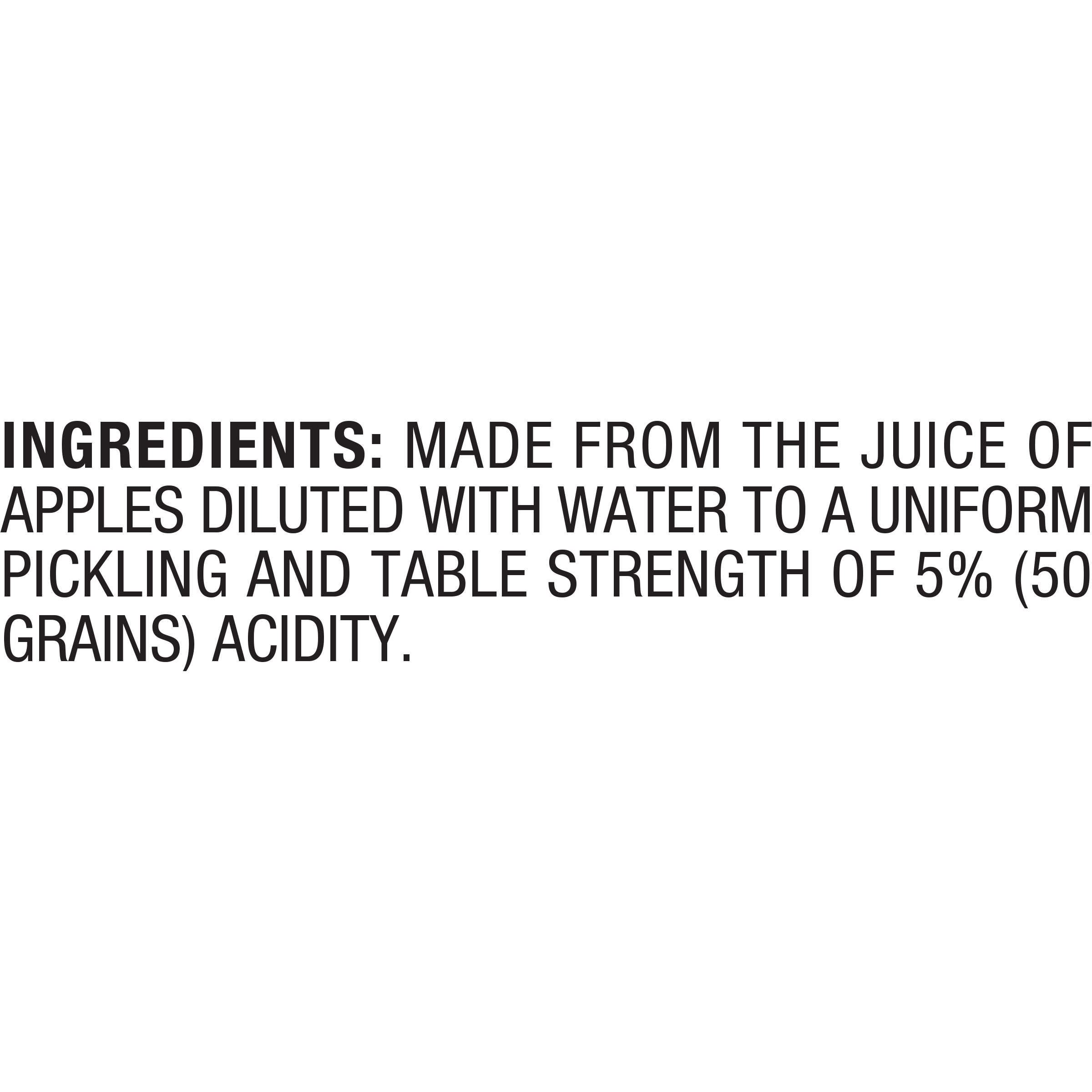 Product Description Handy in the kitchen as a base ingredient for so many of the things we make, Heinz Apple Cider Vinegar is made from all natural apples, has 5% acidity, and is bottled at its peak of freshness. Heinz Apple Cider Vinegar is ultra-filtered to guarantee sparkling clarity. It's a natural for salad dressings and vinaigrettes but also works as a marinade for meat so keep it on hand whenever you're cooking. Just like white vinegar, apple cider vinegar is useful as a non-toxic, biodegradable cleaning alternative for everything from floors to drains and coffee makers.