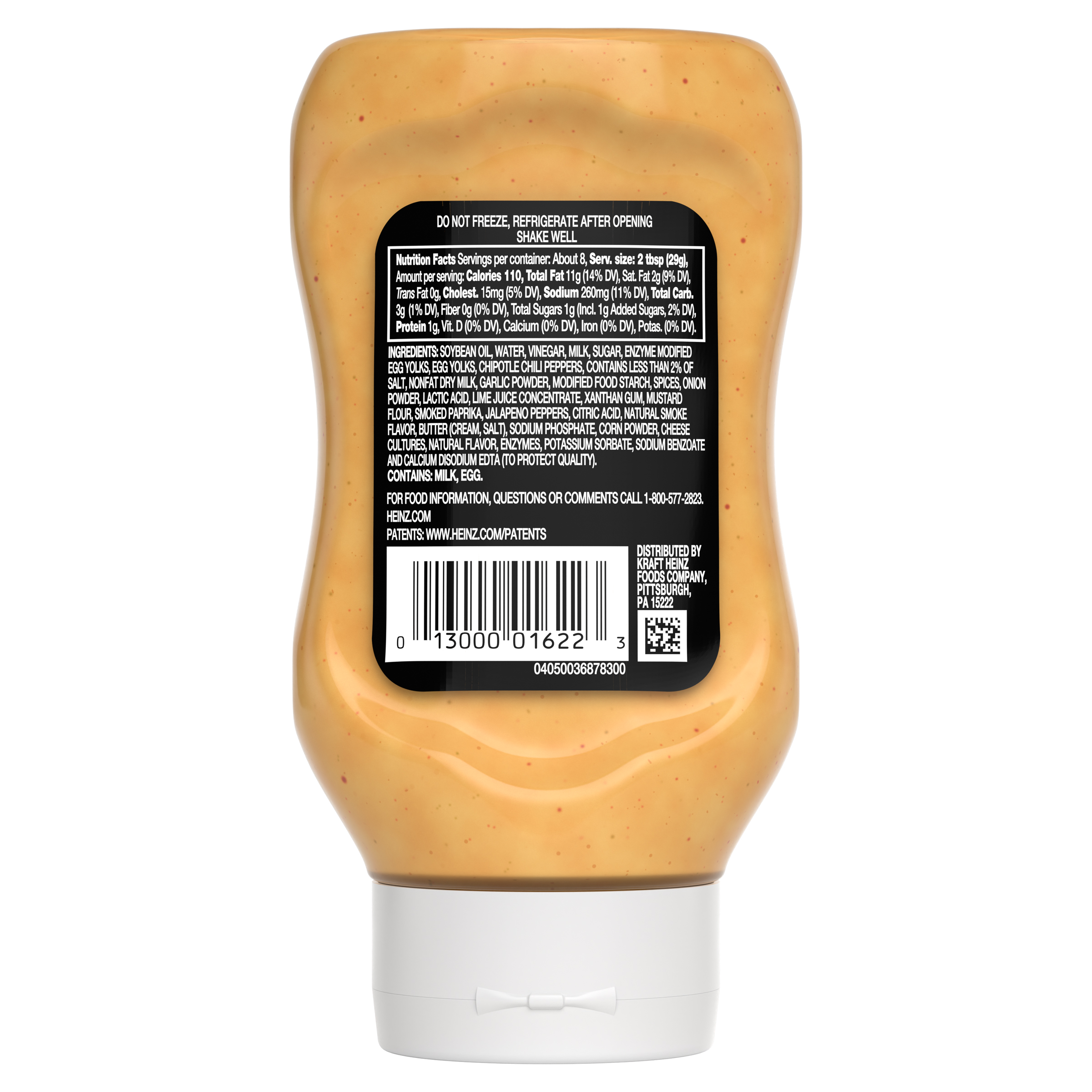 GTIN 00013000016223 Kraft Item Code (SKU) 00130000162270 Product Status Active Pack Level EACH Brand Name Heinz Business Unit Elevation Catalog Platform Taste Elevation Product Category Mayonnaise Consumer Unit Size 8 Consumer Unit Size UOM FO Packaging Type (Computed) Bottle Packaging Type Code BOTTLE Sub Units Per Item 1 Variant Mexican Inspired Street Corn Global Product Classification Code 10000280 Computed Exports - Ingredients SOYBEAN OIL, WATER, VINEGAR, MILK, SUGAR, ENZYME MODIFIED EGG YOLKS, EGG YOLKS, CHIPOTLE CHILI PEPPERS, CONTAINS LESS THAN 2% OF SALT, NONFAT DRY MILK, GARLIC POWDER, MODIFIED FOOD STARCH, SPICES, ONION POWDER, LACTIC ACID, LIME JUICE CONCENTRATE, XANTHAN GUM, MUSTARD FLOUR, SMOKED PAPRIKA, JALAPENO PEPPERS, CITRIC ACID, NATURAL SMOKE FLAVOR, BUTTER (CREAM, SALT), SODIUM PHOSPHATE, CORN POWDER, CHEESE CULTURES, NATURAL FLAVOR, ENZYMES, POTASSIUM SORBATE, SODIUM BENZOATE AND CALCIUM DISODIUM EDTA (TO PROTECT QUALITY). Parent Reference 10013000016220 Quality Statement Shake Well | Best If Used By Date On Bottle Storage Instructions Do Not Freeze | Refrigerate After Opening Customer Guarantee 60 Temperature Classification Code 01 Net Weight 0.5 Gross Weight 0.574 Weight UOM LB Height (in) 5.506 Length/Depth (in) 2.7 Width (in) 1.984 Case Cube 0.017 Parent Relation CASE_10013000016220 Parent Kraft Item Code (SKU) 00130000162200 Product Title Heinz Mexican Inspired Street Corn Sauce, 8 fl oz Bottle Product Description Heinz Mexican Inspired Street Corn Sauce, 8 fl oz Bottle