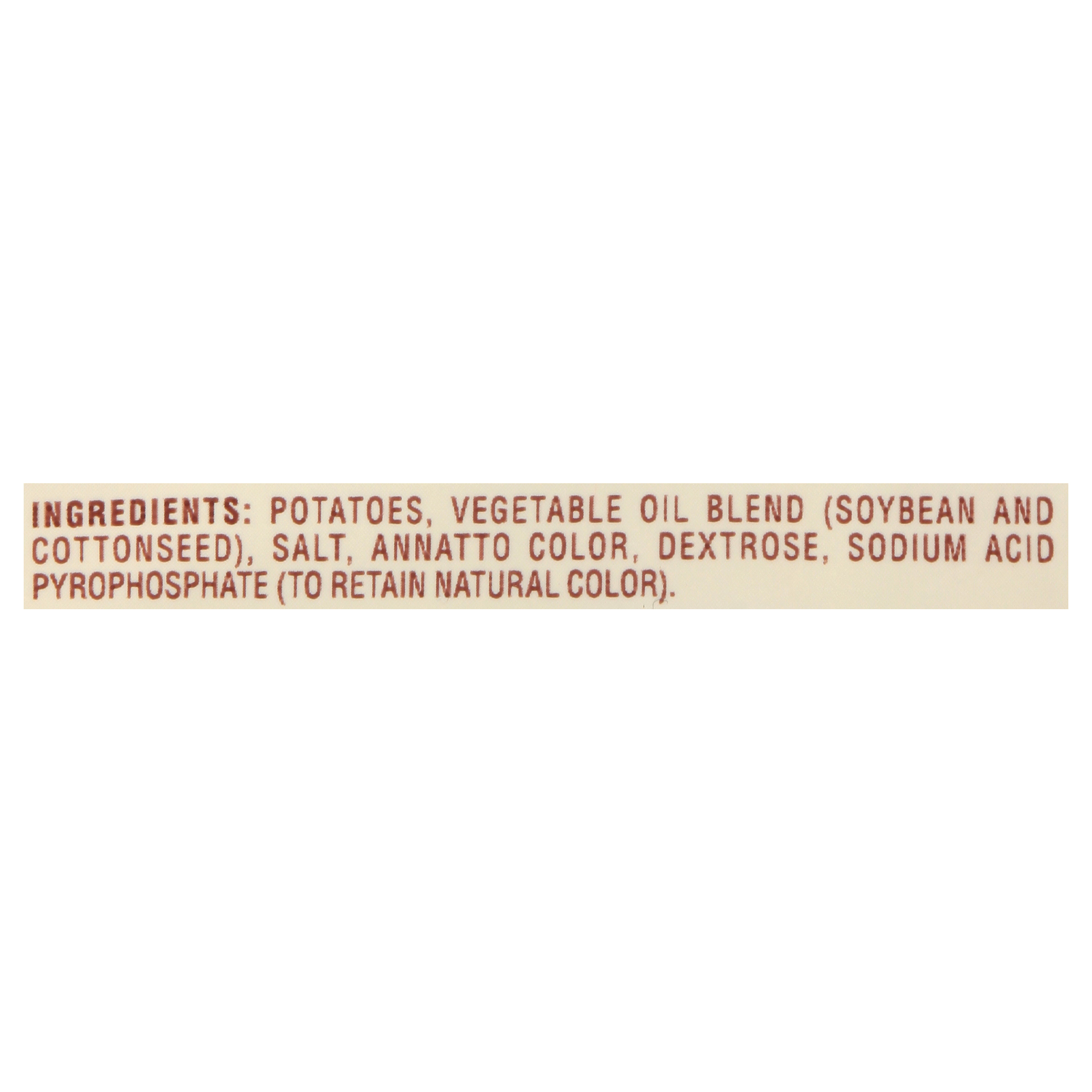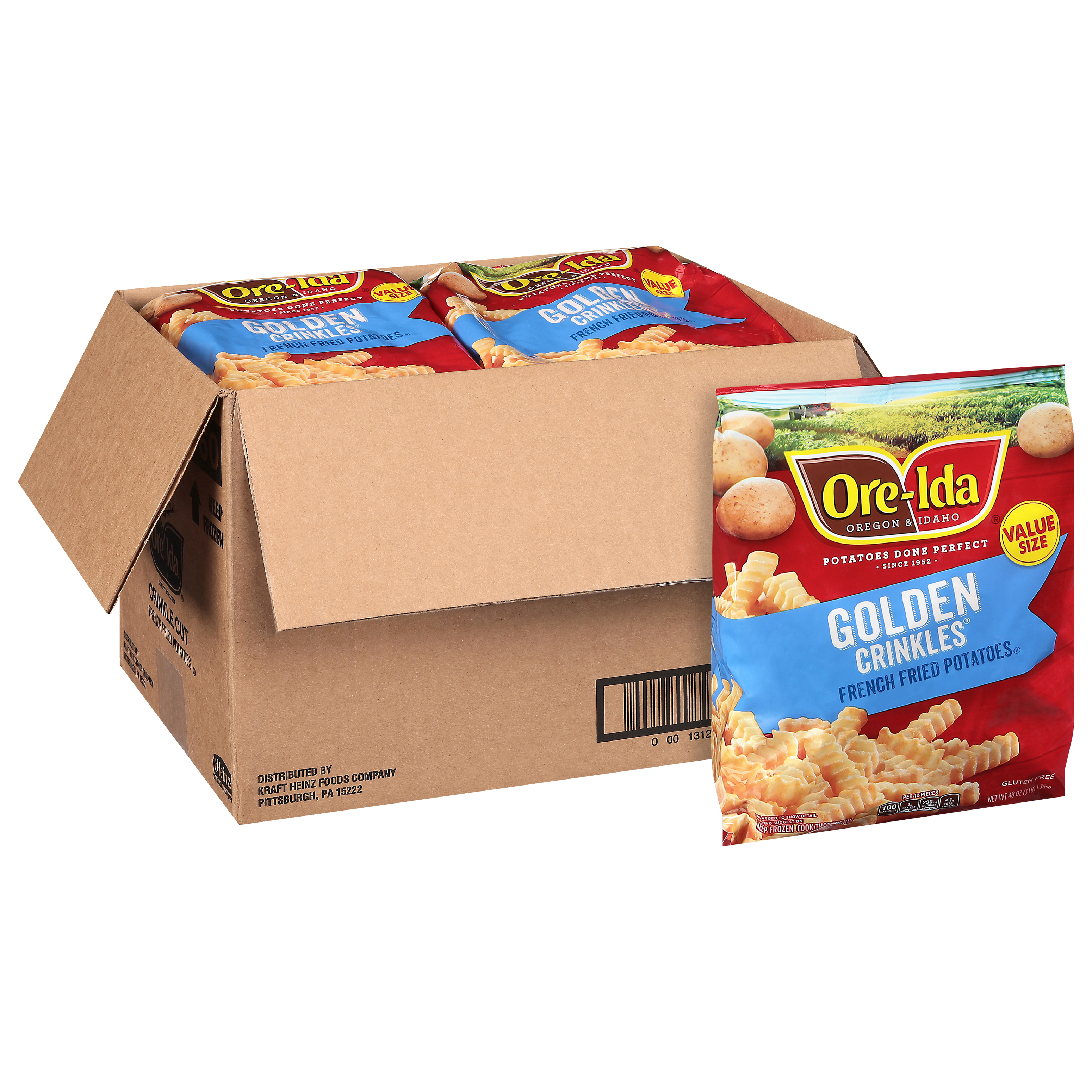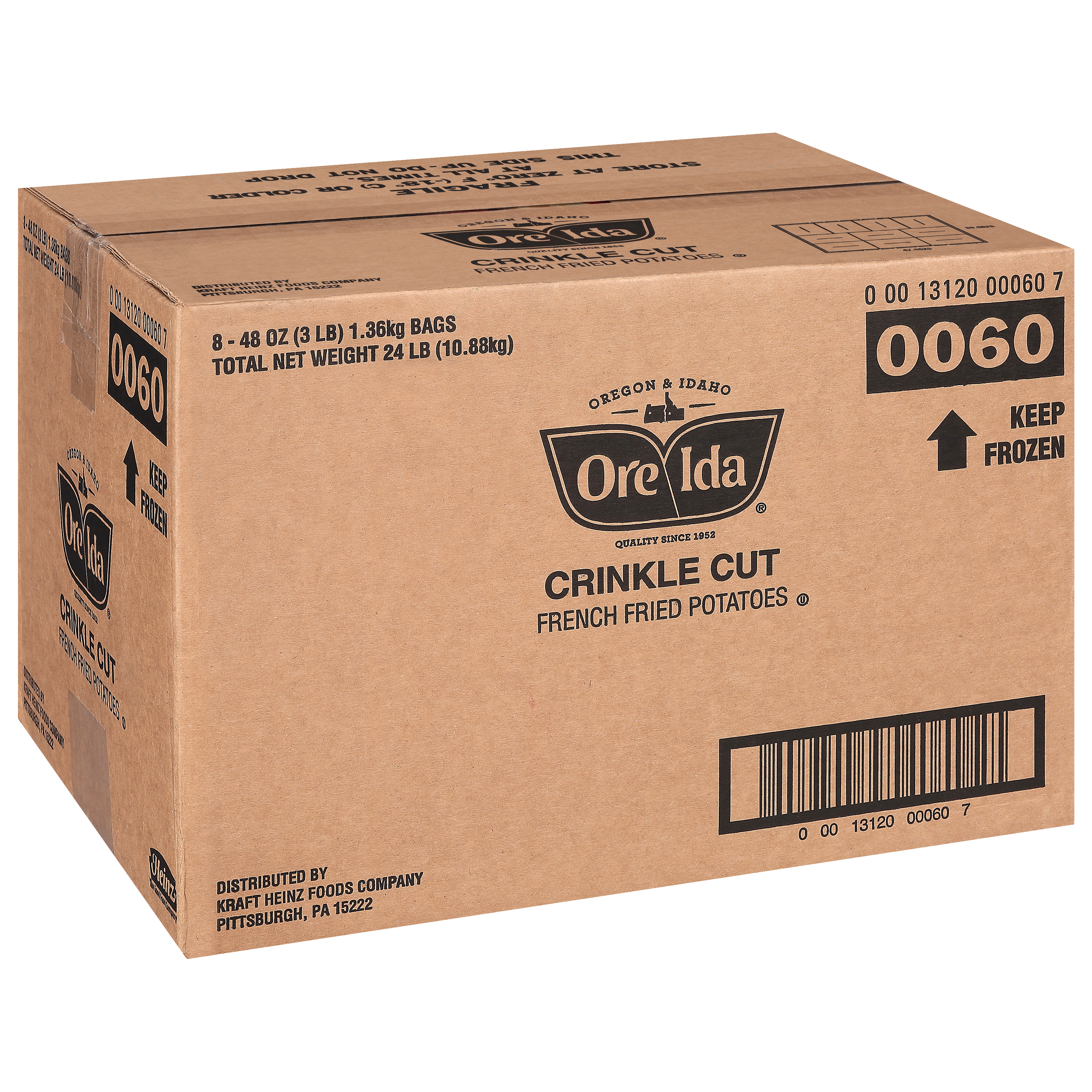 GTIN 00013120000607 Kraft Item Code (SKU) 00131200006000 Product Status Active Pack Level CASE Brand Name Ore-Ida Business Unit Hydration Desserts & Meals Catalog Platform Easy Ready Meals Product Category Branded Frozen Potatoes - OI Fries Consumer Unit Size 48 Consumer Unit Size UOM OZ Packaging Type (Computed) Box Packaging Type Code BOX/CARTON Sub Units Per Item 8 Variant Crispy Crinkles Global Product Classification Code 10000291 Computed Exports - Ingredients POTATOES, VEGETABLE OIL (SOYBEAN AND/OR COTTONSEED), CONTAINS LESS THAN 2% OF SALT, ANNATTO COLOR, DEXTROSE, SODIUM ACID PYROPHOSPHATE (TO RETAIN NATURAL COLOR). Parent Reference 20013120000601 Child Reference 00013120000478 Customer Guarantee 180 Temperature Classification Code 08 Net Weight 24 Gross Weight 24.259 Weight UOM LB Height (in) 11 Length/Depth (in) 15.875 Width (in) 11.875 Case Cube 1.2 Child Relation EACH_00013120000478 Parent Relation PALLET_20013120000601 Cases per Tier 10 Tiers per Pallet 8 Cases per Pallet 80 Pallet Stack Limit 1