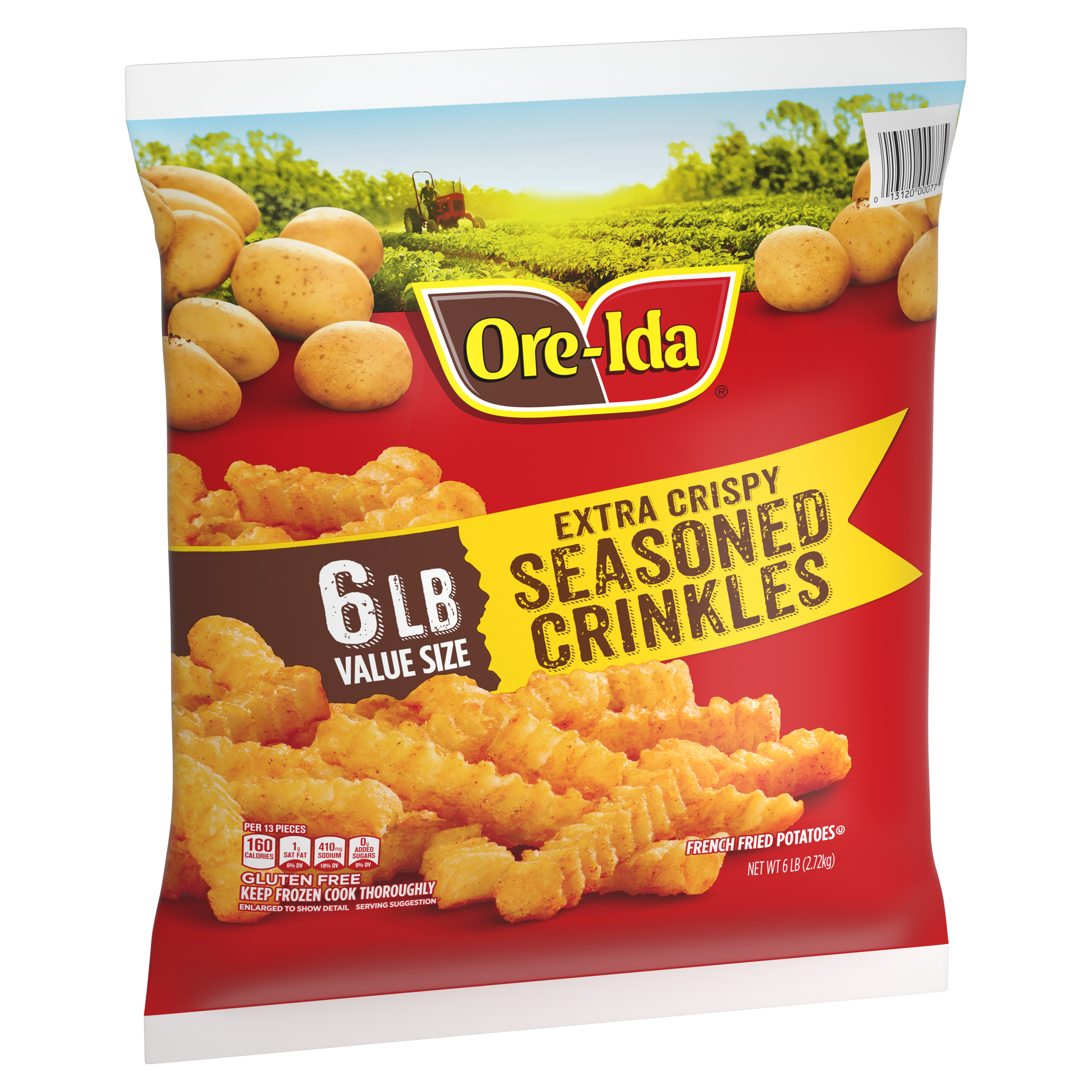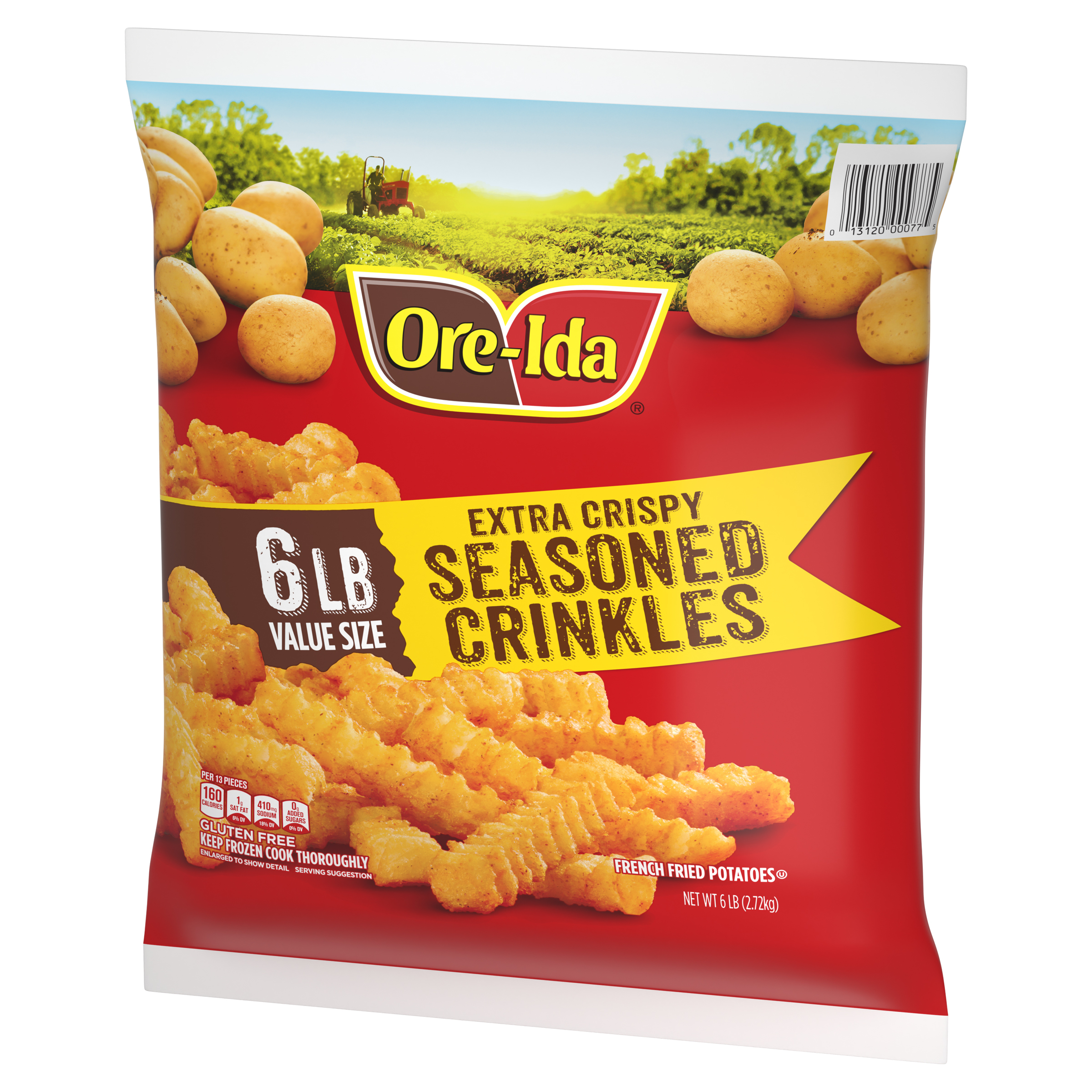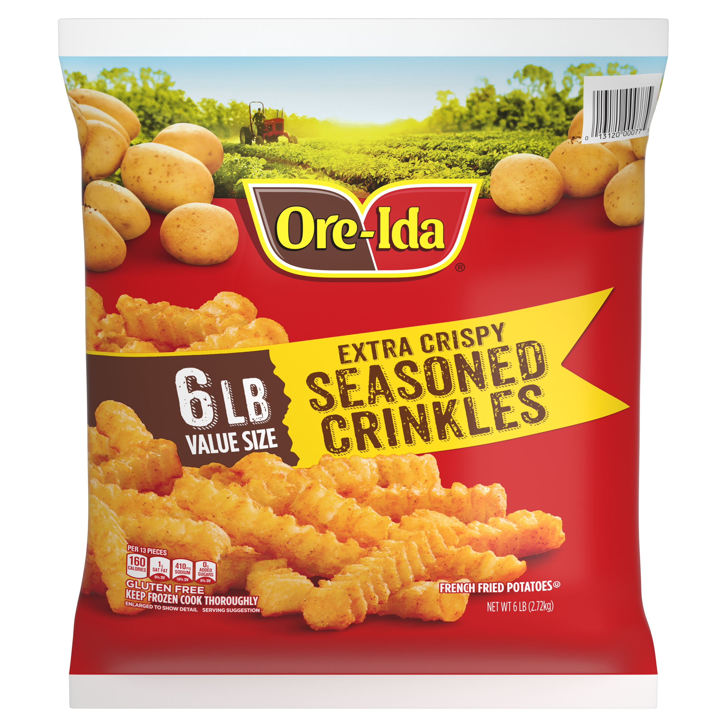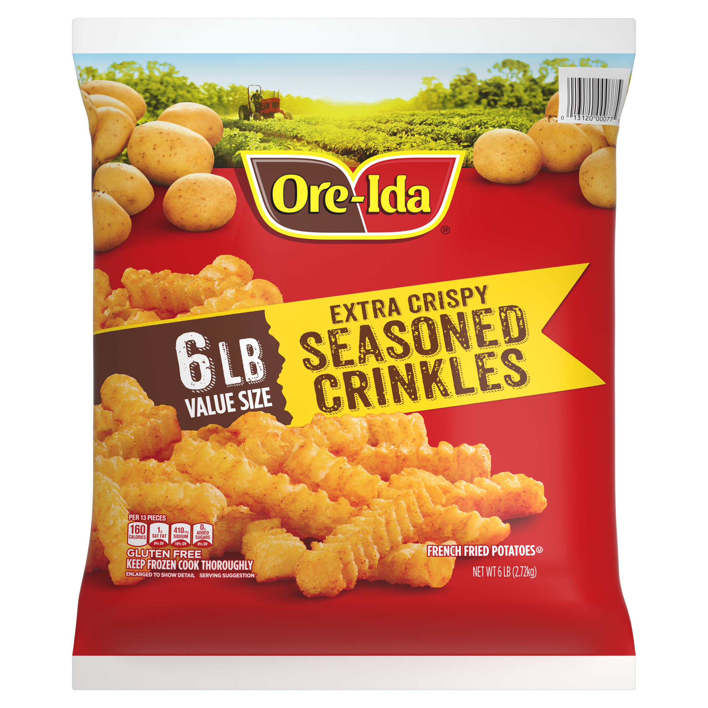 GTIN 00013120000775 Kraft Item Code (SKU) 00131200007770 Product Status Active Pack Level EACH Brand Name Ore-Ida Business Unit Hydration Desserts & Meals Catalog Platform Easy Ready Meals Product Category Branded Frozen Potatoes - OI Fries Consumer Unit Size 6 Consumer Unit Size UOM LB Packaging Type (Computed) Bag Packaging Type Code BAG Sub Units Per Item 1 Variant Extra Crispy Global Product Classification Code 10000291 Computed Exports - Ingredients POTATOES, VEGETABLE OIL (SOYBEAN AND/OR COTTONSEED), MODIFIED FOOD STARCH, RICE FLOUR, CONTAINS LESS THAN 2% OF THE FOLLOWING: SALT, DEXTRIN, ONION POWDER, SODIUM ACID PYROPHOSPHATE (TO RETAIN NATURAL COLOR), CHILI PEPPER, GARLIC POWDER, SPICES, LEAVENING (SODIUM ACID PYROPHOSPHATE, SODIUM BICARBONATE), XANTHAN GUM, EXTRACTIVES OF PAPRIKA (COLOR), NATURAL FLAVOR. Parent Reference 10013120000772 Storage Instructions Keep Frozen Customer Guarantee 180 Temperature Classification Code 08 Net Weight 6 Gross Weight 6.052 Weight UOM LB Height (in) 17 Length/Depth (in) 3 Width (in) 15.125 Case Cube 0.446 Parent Relation CASE_10013120000772 Parent Kraft Item Code (SKU) 00131200007700 Product Title Ore-Ida Extra Crispy Seasoned Crinkles French Fries Fried Frozen Potatoes, 6 lb Bag Product Description Ore-Ida Extra Crispy Seasoned Crinkles French Fries Fried Frozen Potatoes, 6 lb Bag