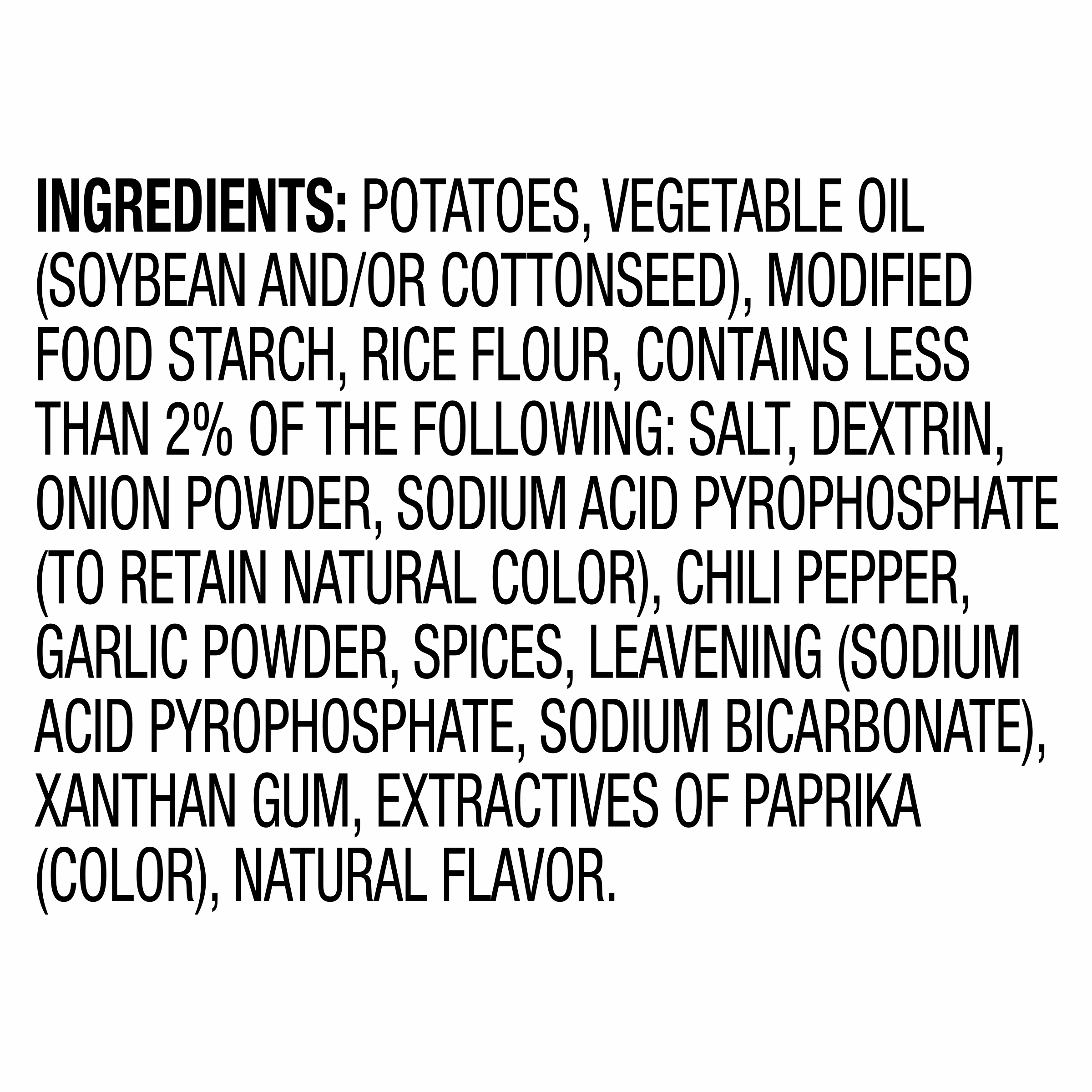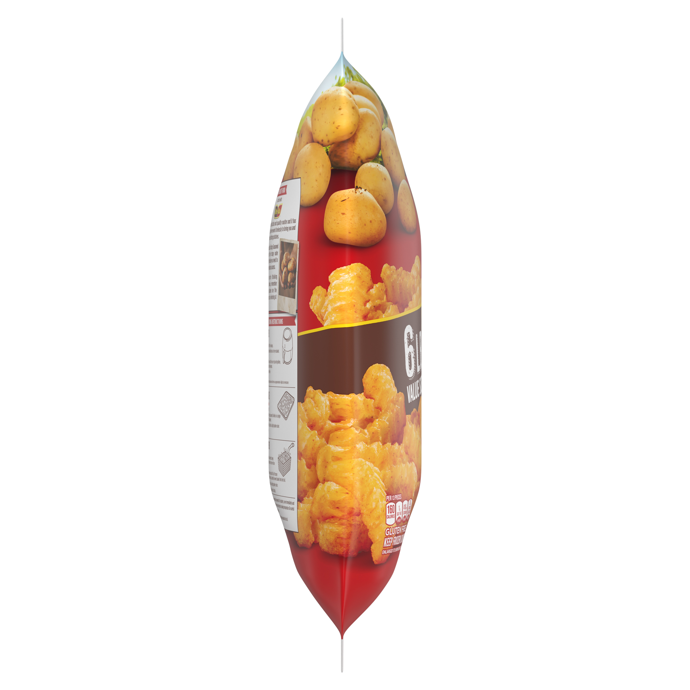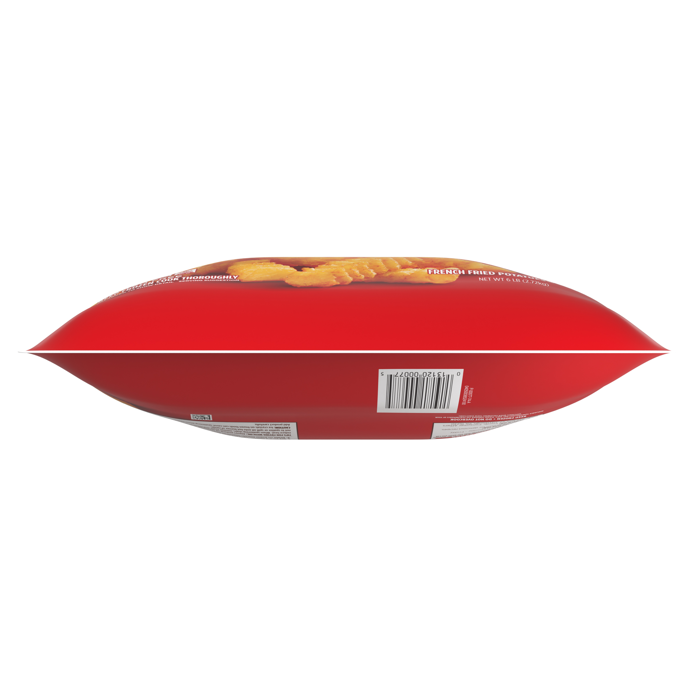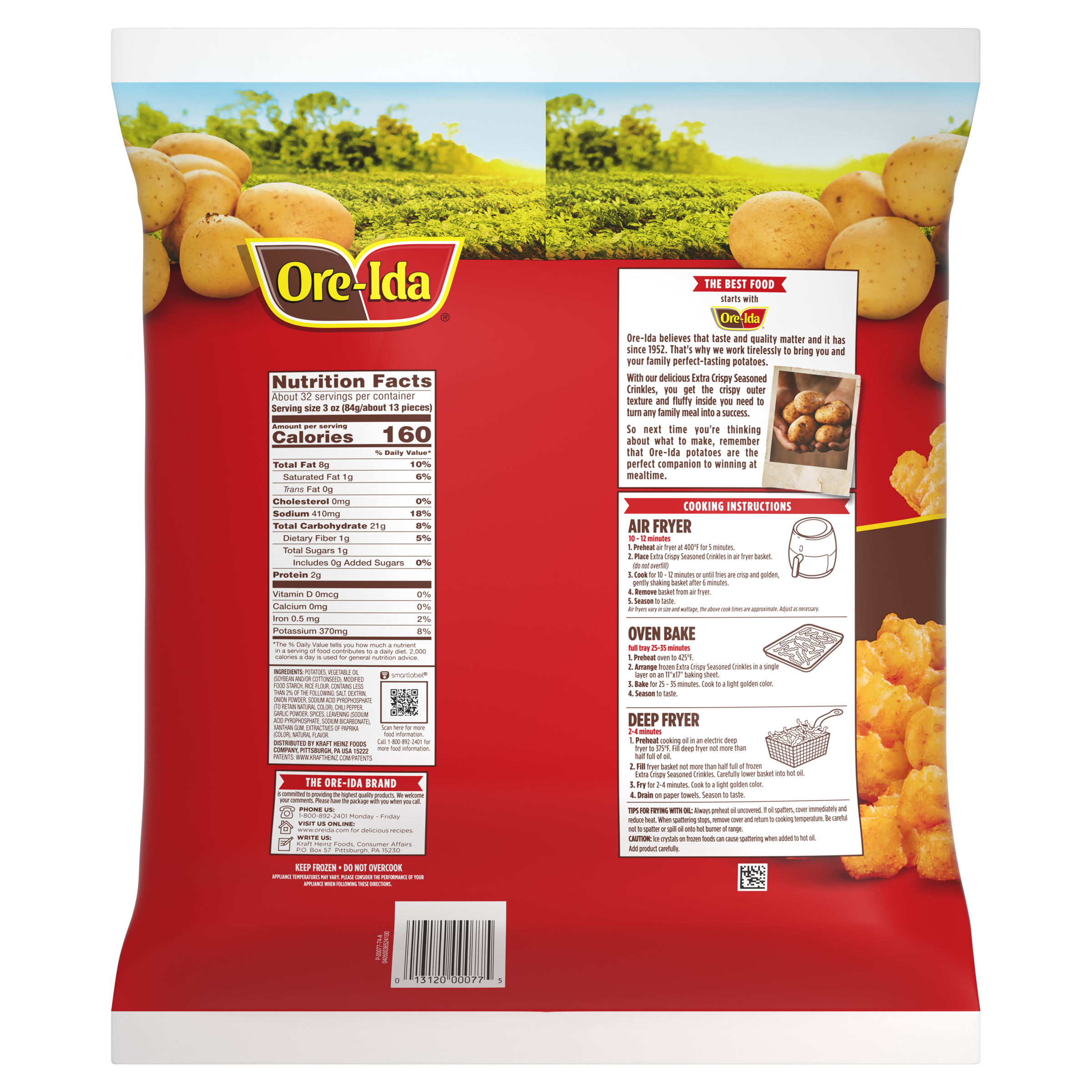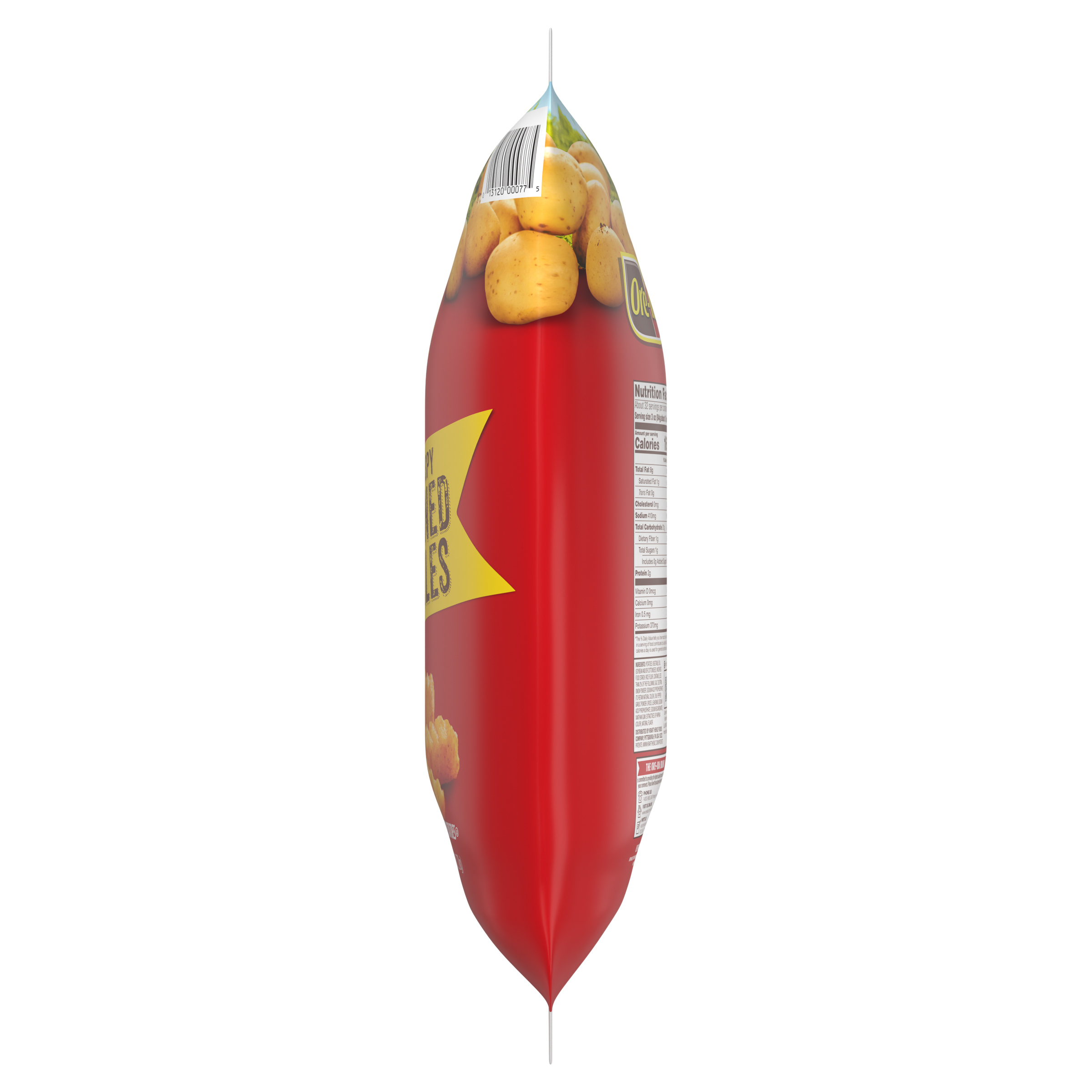 GTIN 00013120000775 Kraft Item Code (SKU) 00131200007770 Product Status Active Pack Level EACH Brand Name Ore-Ida Business Unit Hydration Desserts & Meals Catalog Platform Easy Ready Meals Product Category Branded Frozen Potatoes - OI Fries Consumer Unit Size 6 Consumer Unit Size UOM LB Packaging Type (Computed) Bag Packaging Type Code BAG Sub Units Per Item 1 Variant Extra Crispy Global Product Classification Code 10000291 Computed Exports - Ingredients POTATOES, VEGETABLE OIL (SOYBEAN AND/OR COTTONSEED), MODIFIED FOOD STARCH, RICE FLOUR, CONTAINS LESS THAN 2% OF THE FOLLOWING: SALT, DEXTRIN, ONION POWDER, SODIUM ACID PYROPHOSPHATE (TO RETAIN NATURAL COLOR), CHILI PEPPER, GARLIC POWDER, SPICES, LEAVENING (SODIUM ACID PYROPHOSPHATE, SODIUM BICARBONATE), XANTHAN GUM, EXTRACTIVES OF PAPRIKA (COLOR), NATURAL FLAVOR. Parent Reference 10013120000772 Storage Instructions Keep Frozen Customer Guarantee 180 Temperature Classification Code 08 Net Weight 6 Gross Weight 6.052 Weight UOM LB Height (in) 17 Length/Depth (in) 3 Width (in) 15.125 Case Cube 0.446 Parent Relation CASE_10013120000772 Parent Kraft Item Code (SKU) 00131200007700 Product Title Ore-Ida Extra Crispy Seasoned Crinkles French Fries Fried Frozen Potatoes, 6 lb Bag Product Description Ore-Ida Extra Crispy Seasoned Crinkles French Fries Fried Frozen Potatoes, 6 lb Bag