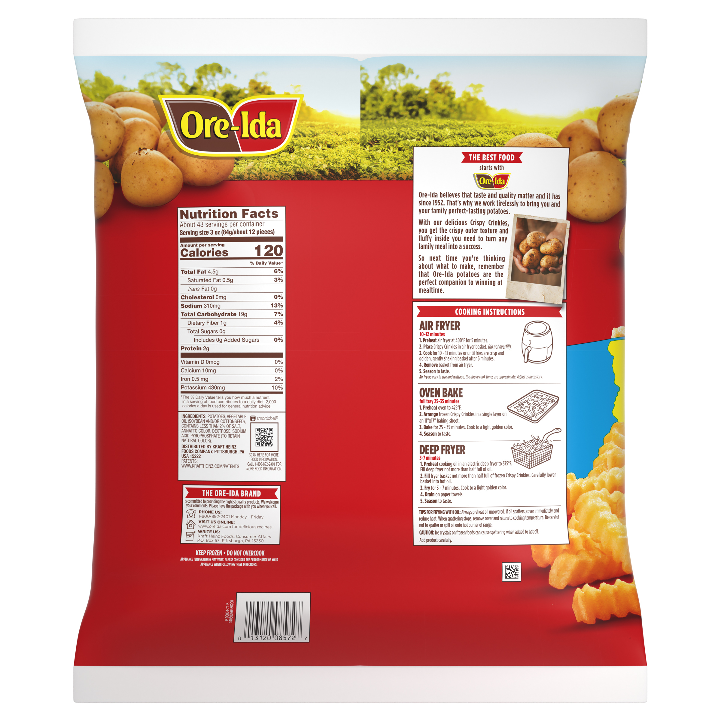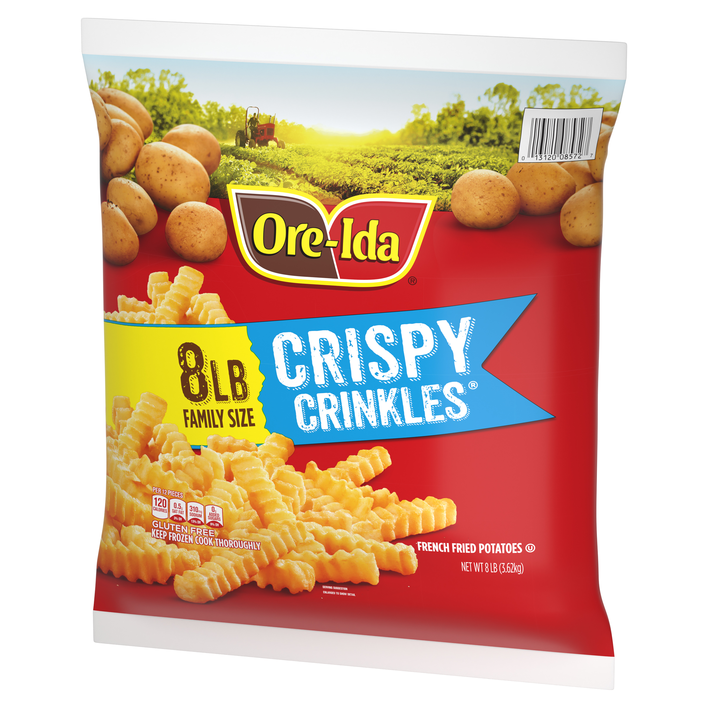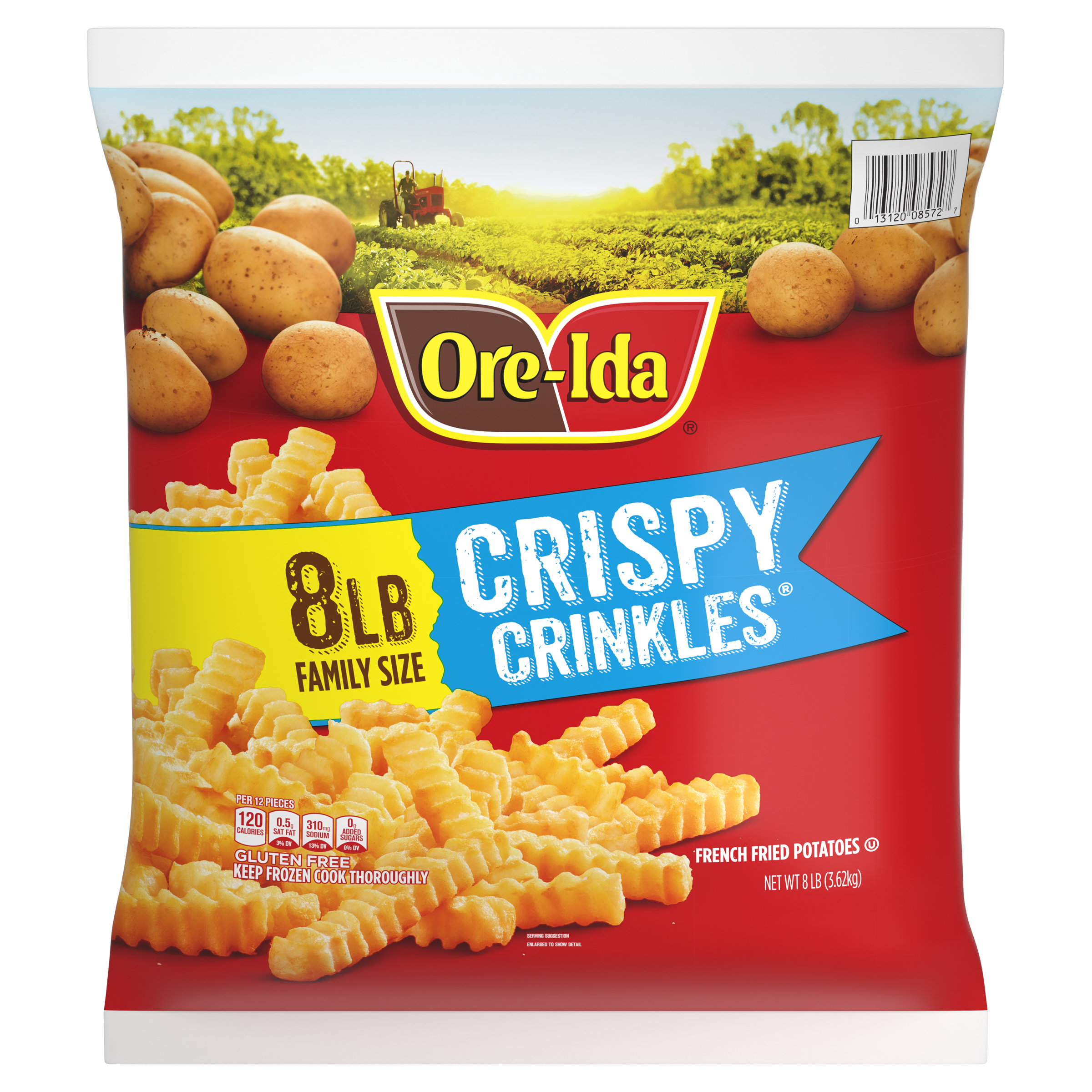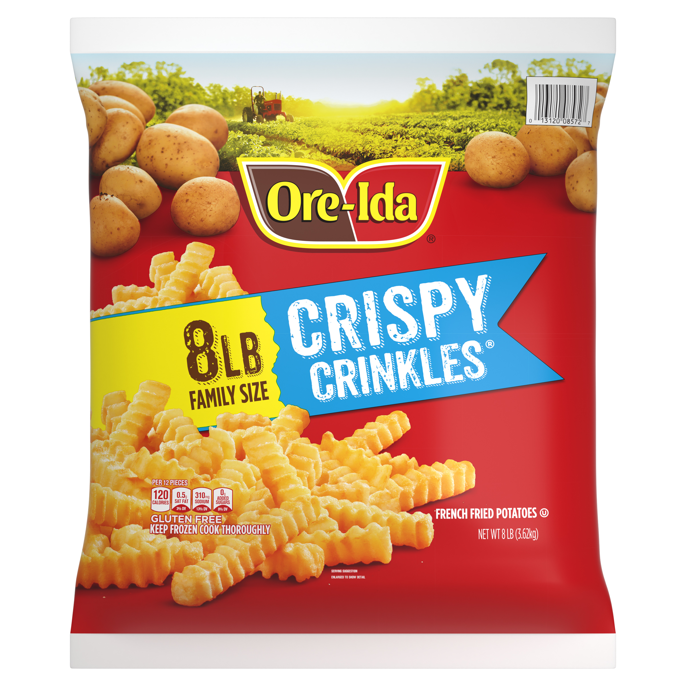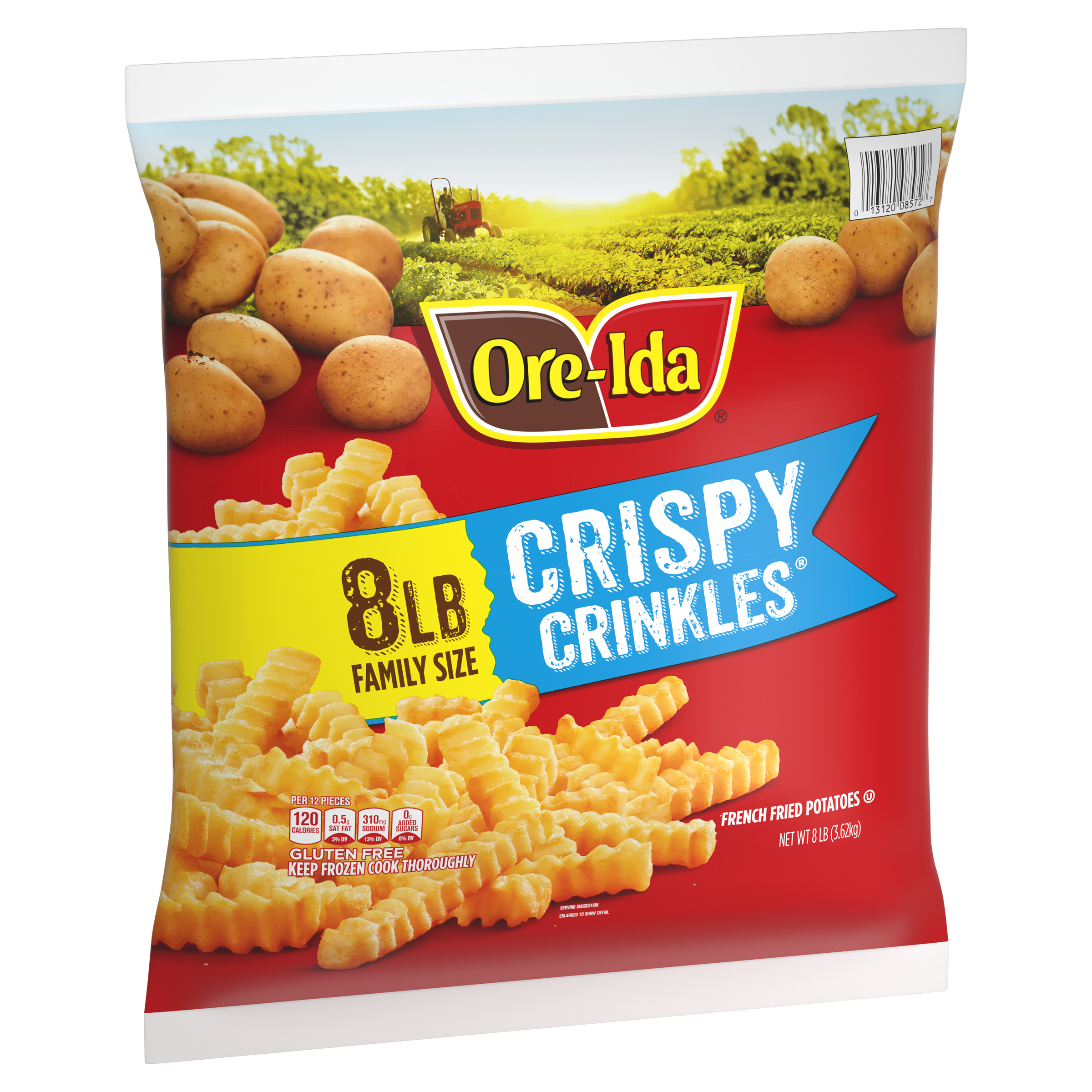 Product Description Crispy and fluffy every time, that's Ore-Ida. Crave-worthy and easy-to-make, Ore-Ida Crispy Crinkles French Fried Potatoes are the perfect side dish. Gluten-free crinkle cut fries offer a golden, crispy texture, making mealtime a moment. Our frozen snacks are easy to prepare in your air fryer, oven or deep fryer. Looking to simplify and spark excitement in your mealtime routines? Transform your meals with our Crispy Crinkles. A classic potato favorite, our frozen fries are perfect for everyday dinners. Serve our crispy fries with your favorite condiments and sauces as an easy, delicious appetizer or side to complete or elevate any meal. Ore-Ida Crispy Crinkles offer a crowd-pleasing bite your whole family will enjoy. Each 8-lb family size bag contains about 43 servings, perfect for dinner sides. Stock up on our frozen French fries, so you always have an easy and convenient option on hand to turn everyday meals into something special. Keep our bag of crinkle fries in your freezer until ready to prepare. Ore-Ida has been perfecting potatoes for over 70 years, and we set the golden standard all potatoes aspire to meet. Explore our selection of frozen potatoes, French Fries, Tater Tots and Hash Browns. It's Ore-Ida or Nothing.