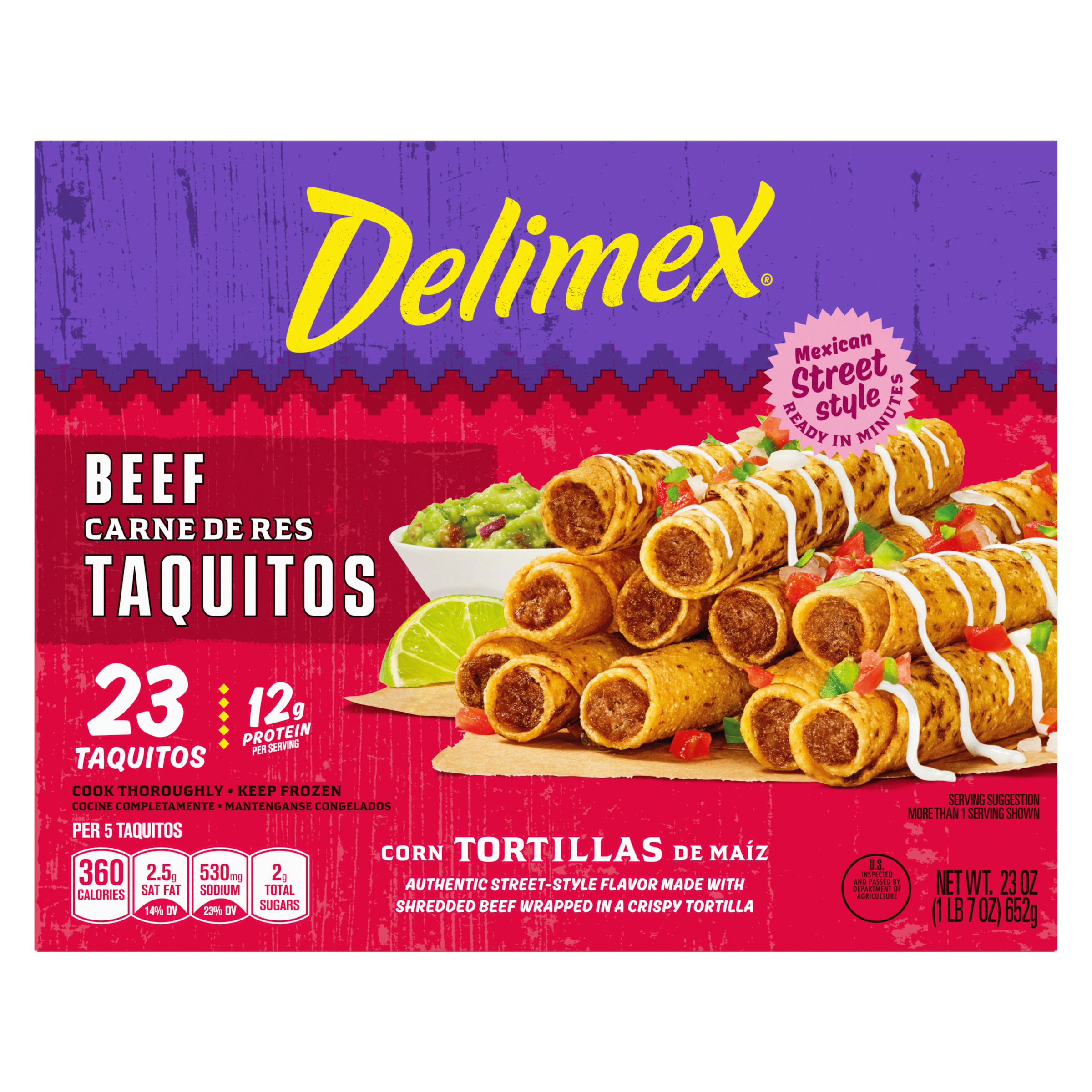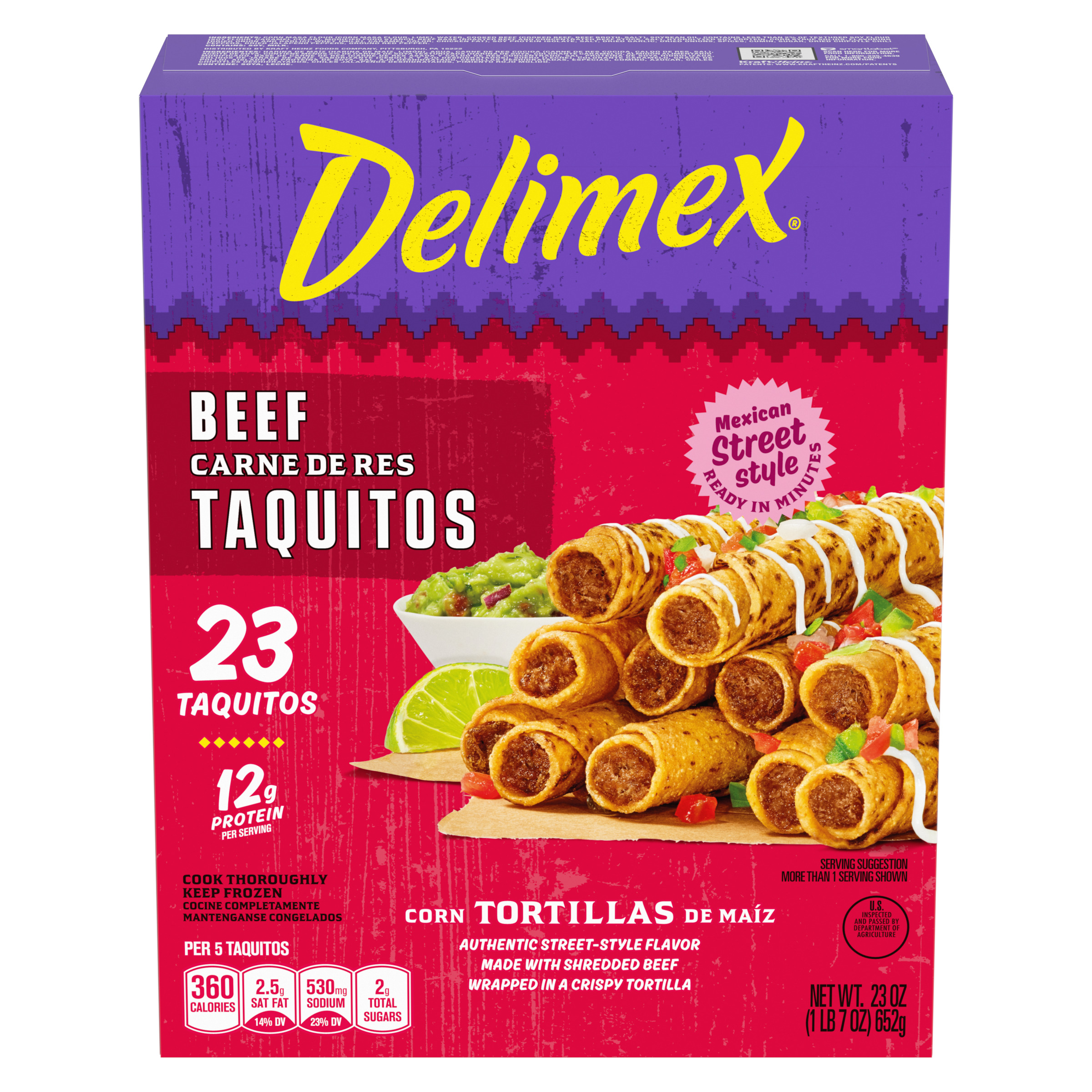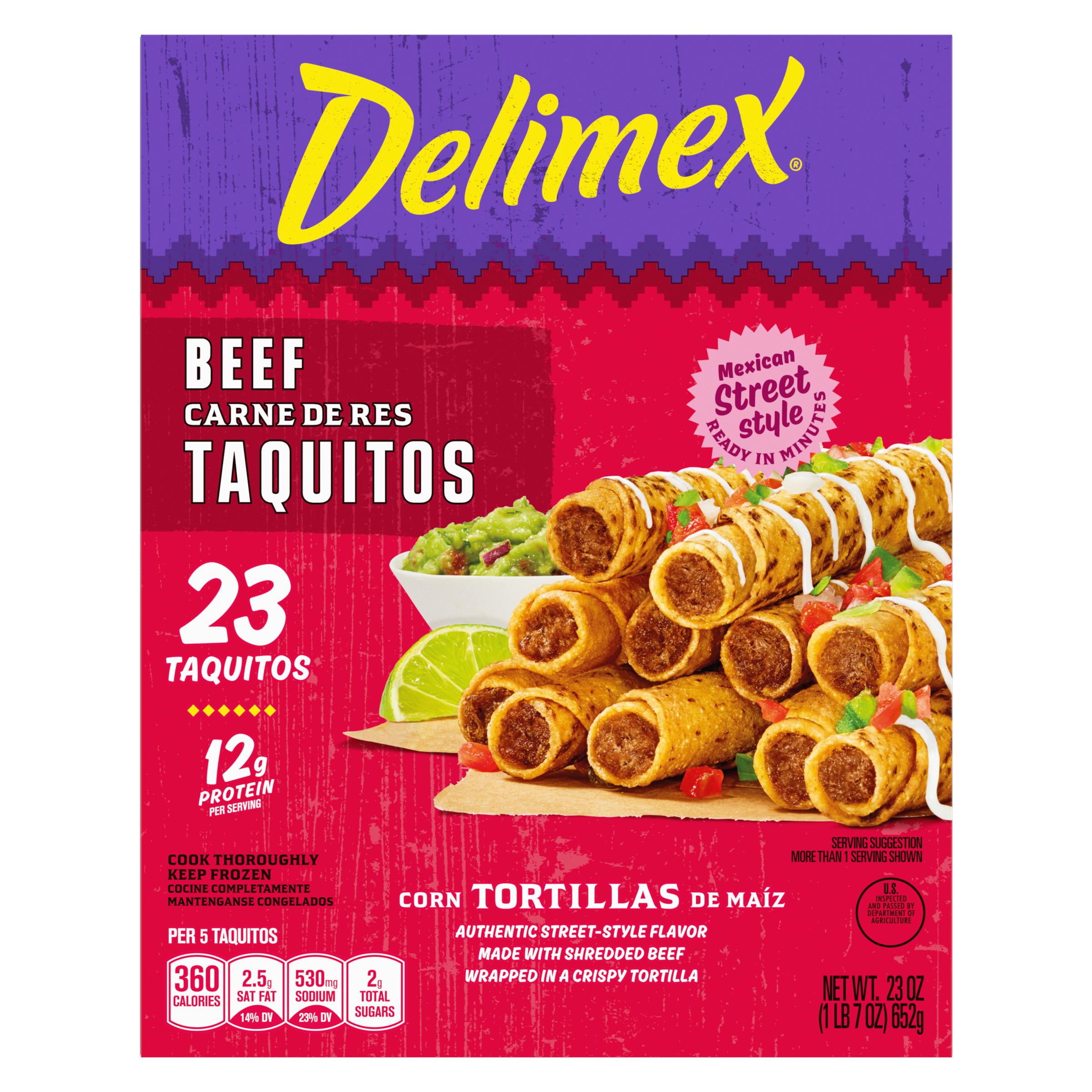 Product Description Taste the tradition of authentic, street-style Mexican flavors with Delimex Beef Taquitos. Oscar Ancira Sr. founded Delimex in 1984, using Mexican-inspired ingredients and traditional recipes to recreate the savory taste of street-style taco shops. Our frozen taquitos are made with shredded beef and seasoned with Mexican-style spices and wrapped in a crispy corn tortilla. Delimex taquitos can be prepared in the microwave, oven or air fryer, and are ready in minutes. Enjoy our taquitos as an appetizer, snack or part of your dinner, served with salsa, guacamole and sour cream. In each mouthwatering bite, you'll taste the original ingredients that you find in Mexican kitchens. Each 23-count box contains about 4.5 servings, with 12 grams of protein per serving. Store our 23-ounce box of frozen taquitos in the freezer until ready to prepare.