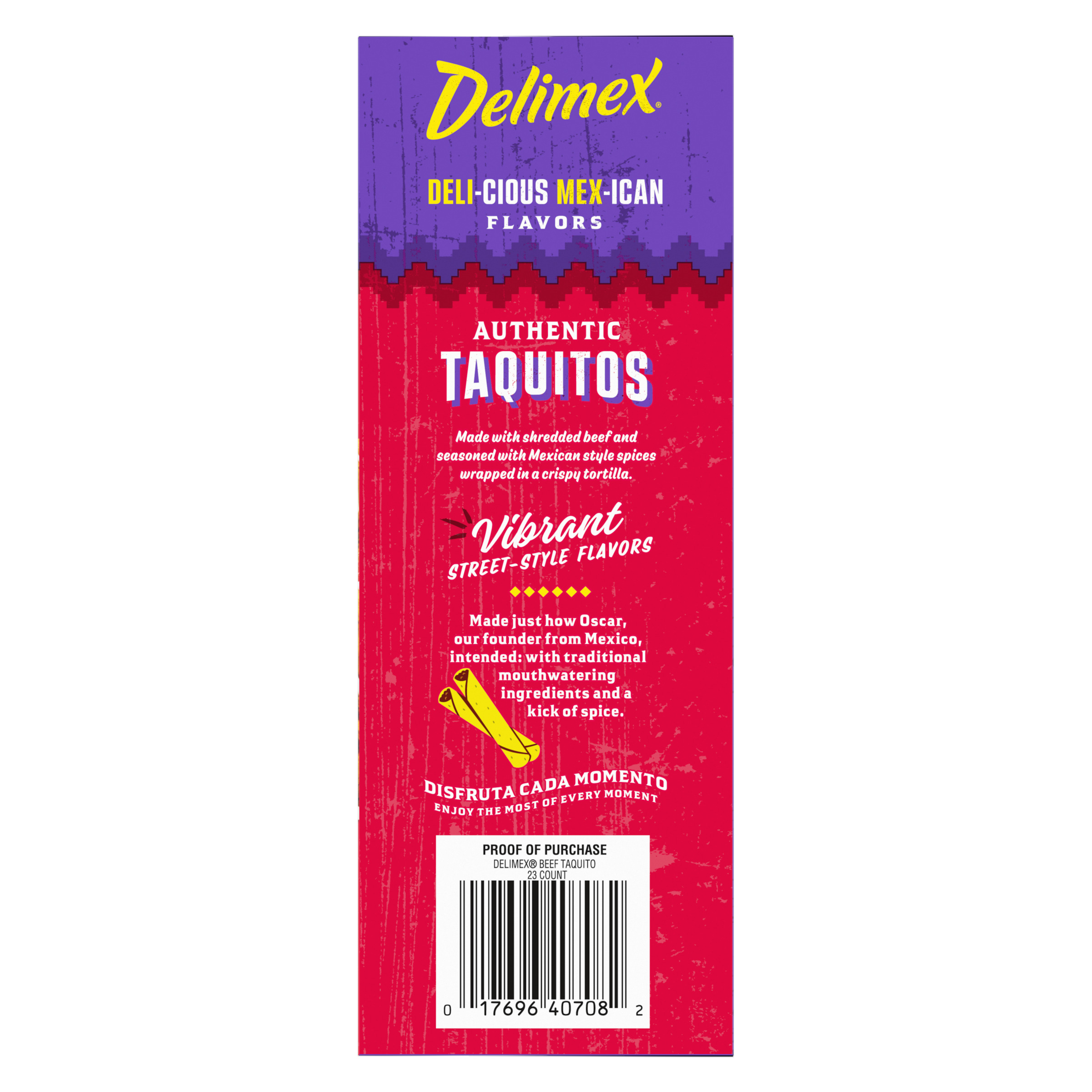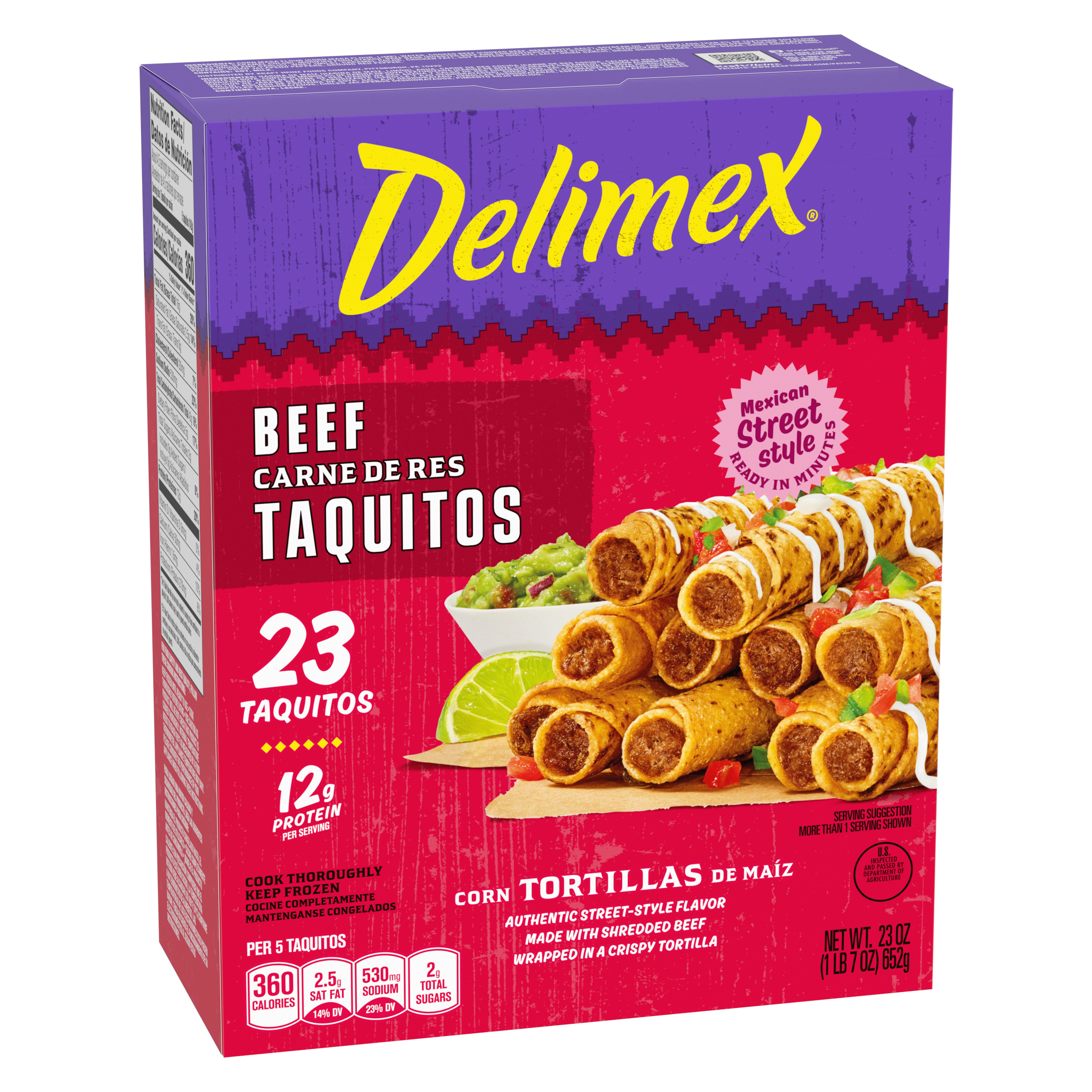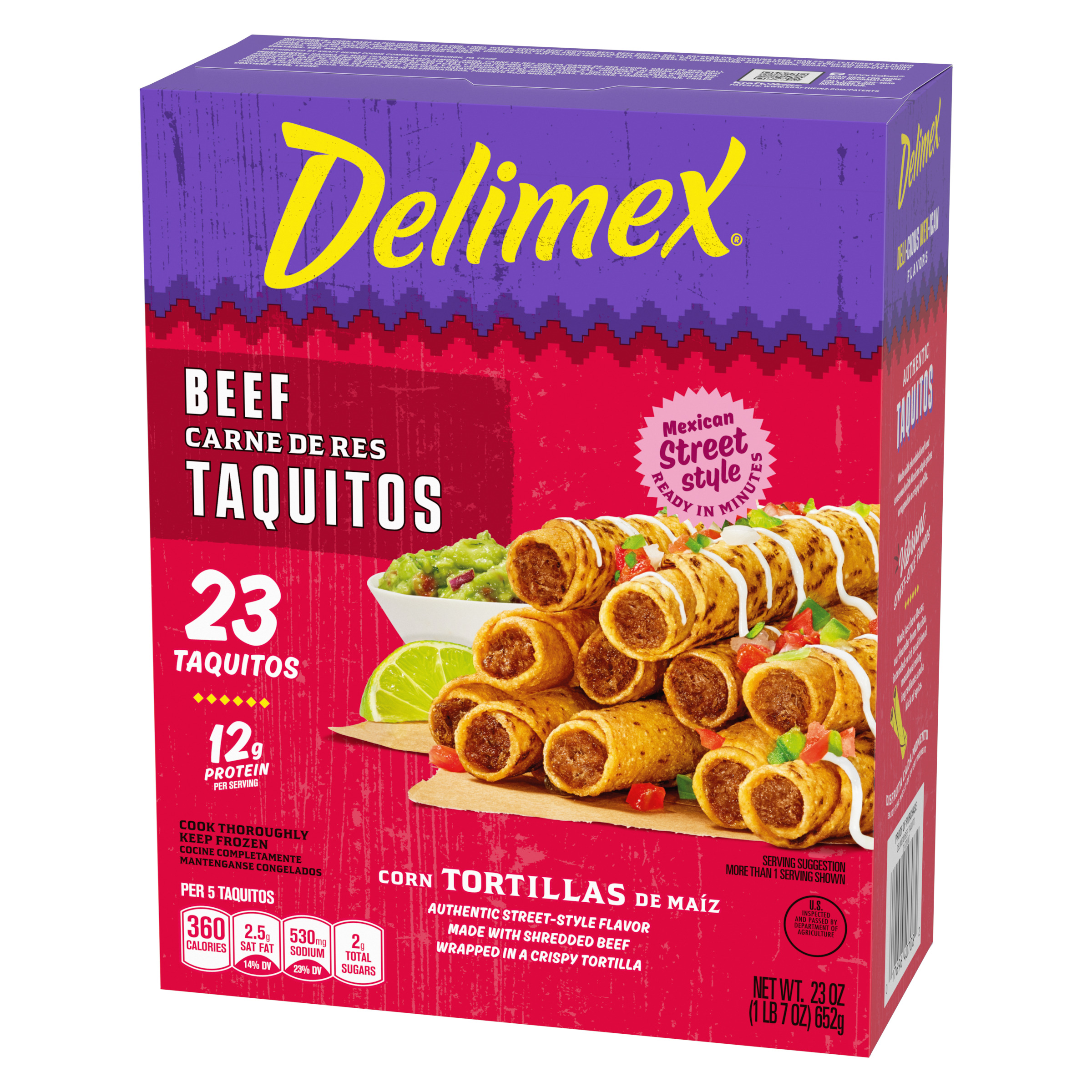 Product Description Taste the tradition of authentic, street-style Mexican flavors with Delimex Beef Taquitos. Oscar Ancira Sr. founded Delimex in 1984, using Mexican-inspired ingredients and traditional recipes to recreate the savory taste of street-style taco shops. Our frozen taquitos are made with shredded beef and seasoned with Mexican-style spices and wrapped in a crispy corn tortilla. Delimex taquitos can be prepared in the microwave, oven or air fryer, and are ready in minutes. Enjoy our taquitos as an appetizer, snack or part of your dinner, served with salsa, guacamole and sour cream. In each mouthwatering bite, you'll taste the original ingredients that you find in Mexican kitchens. Each 23-count box contains about 4.5 servings, with 12 grams of protein per serving. Store our 23-ounce box of frozen taquitos in the freezer until ready to prepare.