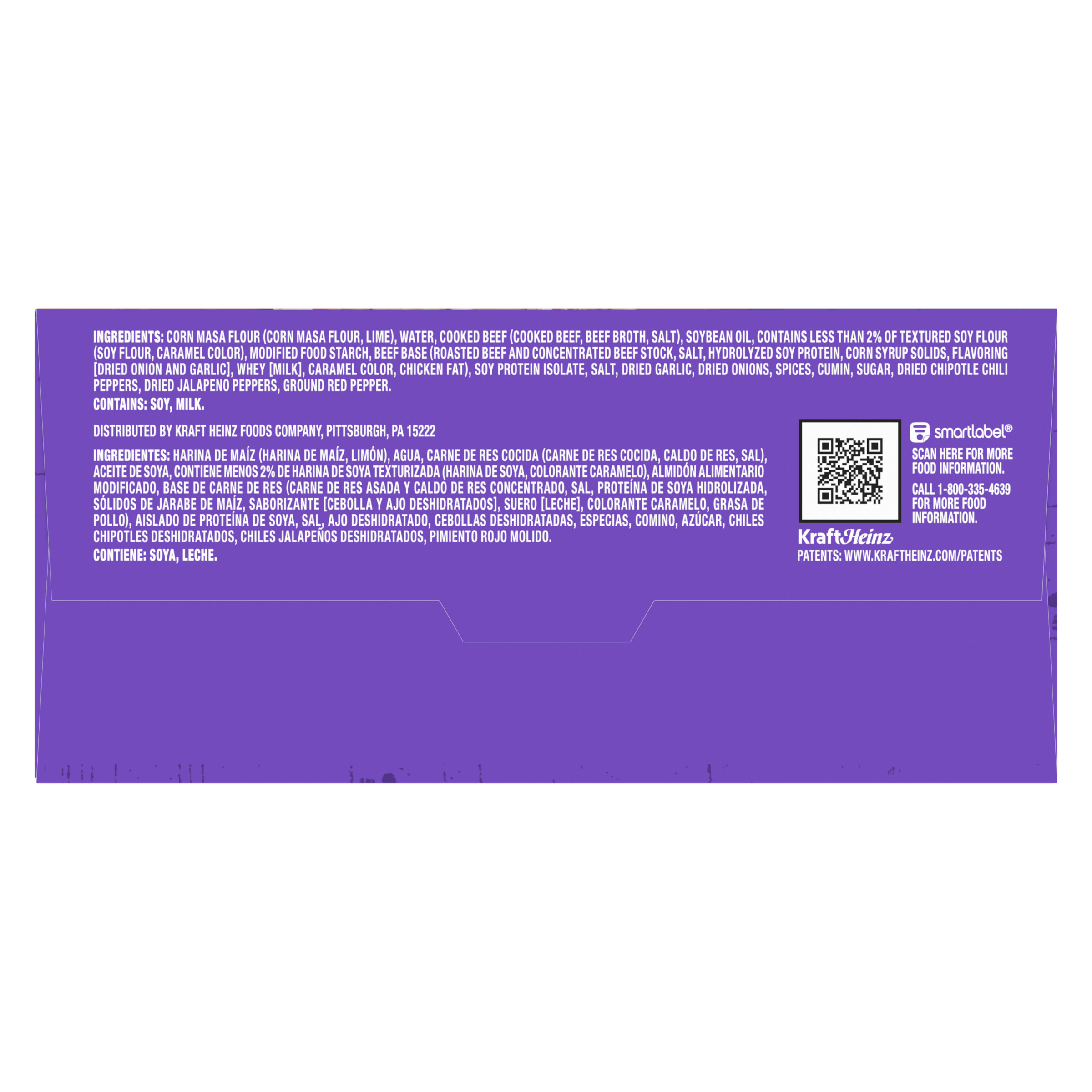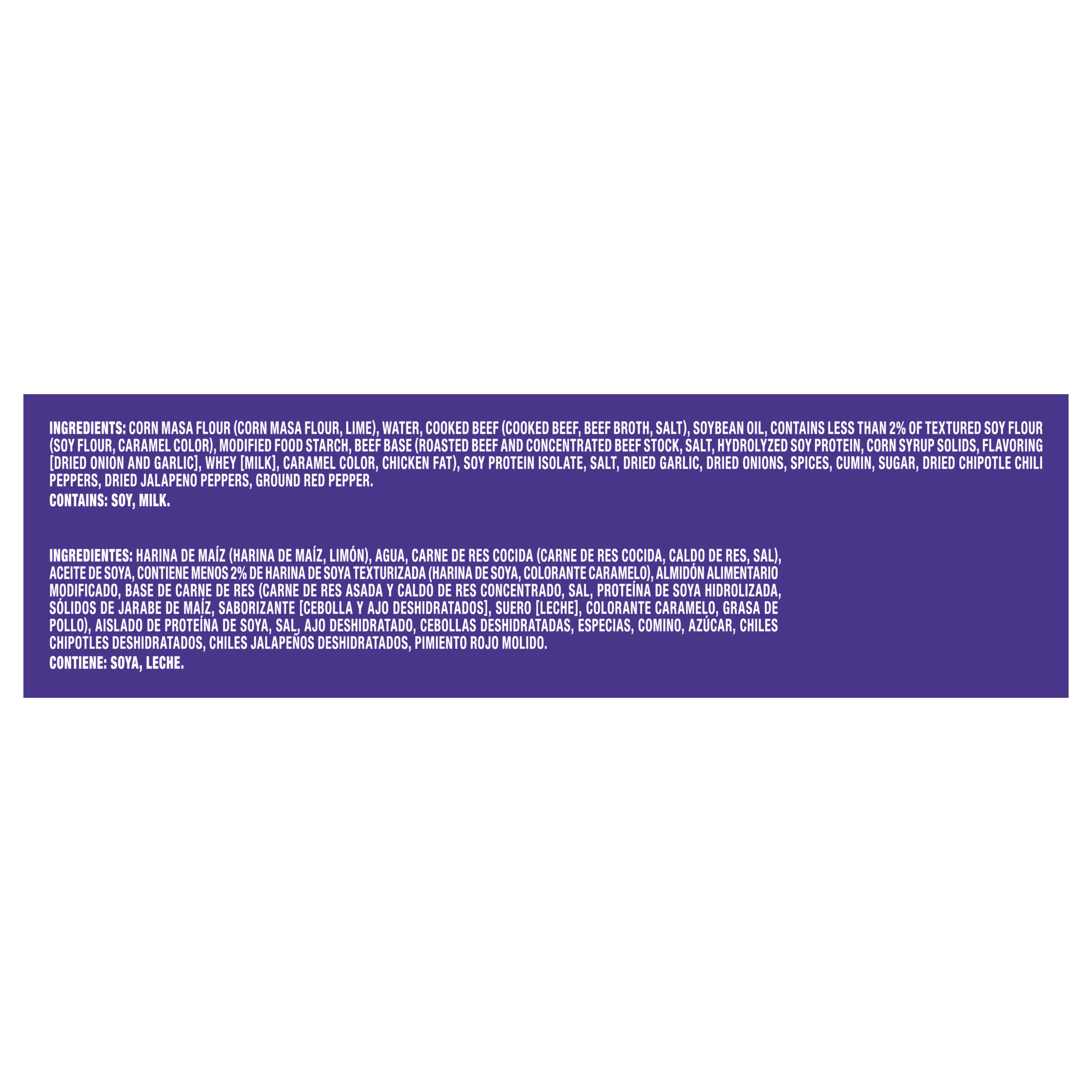 GTIN 00017696407082 Kraft Item Code (SKU) 00176964070870 Product Status Active Pack Level EACH Brand Name Delimex Business Unit Hydration Desserts & Meals Catalog Platform Easy Ready Meals Product Category Frozen Snacks Consumer Unit Size 23 Consumer Unit Size UOM OZ Packaging Type (Computed) Box Packaging Type Code BOX/CARTON Packaging Type Code Override (Manual) BOX Sub Units Per Item 1 Variant Beef Global Product Classification Sandwiches/Filled Rolls/Wraps (Frozen) Global Product Classification Code 10000254 Computed Exports - Ingredients CORN MASA FLOUR (CORN MASA FLOUR, LIME), WATER, COOKED BEEF (COOKED BEEF, BEEF BROTH, SALT), SOYBEAN OIL, CONTAINS LESS THAN 2% OF TEXTURED SOY FLOUR (SOY FLOUR, CARAMEL COLOR), MODIFIED FOOD STARCH, BEEF BASE (ROASTED BEEF AND CONCENTRATED BEEF STOCK, SALT, HYDROLYZED SOY PROTEIN, CORN SYRUP SOLIDS, FLAVORING [DRIED ONION AND GARLIC], WHEY [MILK], CARAMEL COLOR, CHICKEN FAT), SOY PROTEIN ISOLATE, SALT, DRIED GARLIC, DRIED ONIONS, SPICES, CUMIN, SUGAR, DRIED CHIPOTLE CHILI PEPPERS, DRIED JALAPENO PEPPERS, GROUND RED PEPPER.INGREDIENTES: HARINA DE MAZ (HARINA DE MAZ, LIMN), AGUA, CARNE DE RES COCIDA (CARNE DE RES COCIDA, CALDO DE RES, SAL), ACEITE DE SOYA, CONTIENE MENOS 2% DE HARINA DE SOYA TEXTURIZADA (HARINA DE SOYA, COLORANTE CARAMELO), ALMIDN ALIMENTARIO MODIFICADO, BASE DE CARNE DE RES (CARNE DE RES ASADA Y CALDO DE RES CONCENTRADO, SAL, PROTENA DE SOYA HIDROLIZADA, SLIDOS DE JARABE DE MAZ, SABORIZANTE [CEBOLLA Y AJO DESHIDRATADOS], SUERO [LECHE], COLORANTE CARAMELO, GRASA DE POLLO), AISLADO DE PROTENA DE SOYA, SAL, AJO DESHIDRATADO, CEBOLLAS DESHIDRATADAS, ESPECIAS, COMINO, AZCAR, CHILES CHIPOTLES DESHIDRATADOS, CHILES JALAPEOS DESHIDRATADOS, PIMIENTO ROJO MOLIDO.CONTIENE: SOYA, LECHE. Parent Reference 10017696407089 Storage Instructions Keep Frozen Customer Guarantee 180 Temperature Classification Frozen Storage -30 to -18 °C / -22 to 0 °F Temperature Classification Code 08 Net Weight 1.438 Gross Weight 1.55 Weight UOM LB Height (in) 7.75 Length/Depth (in) 2.844 Width (in) 6.125 Case Cube 0.078 Parent Relation CASE_10017696407089 Parent Kraft Item Code (SKU) 00176964070800 Product Title Delimex Beef Taquitos Frozen Snacks, 23 ct Box eCommerce Product Name (Generic Name) Beef Corn Taquitos Frozen Snacks Product Benefits (Includes Seasonal + Formatting) - One 23 ct box of Delimex Beef Taquitos Frozen Snacks