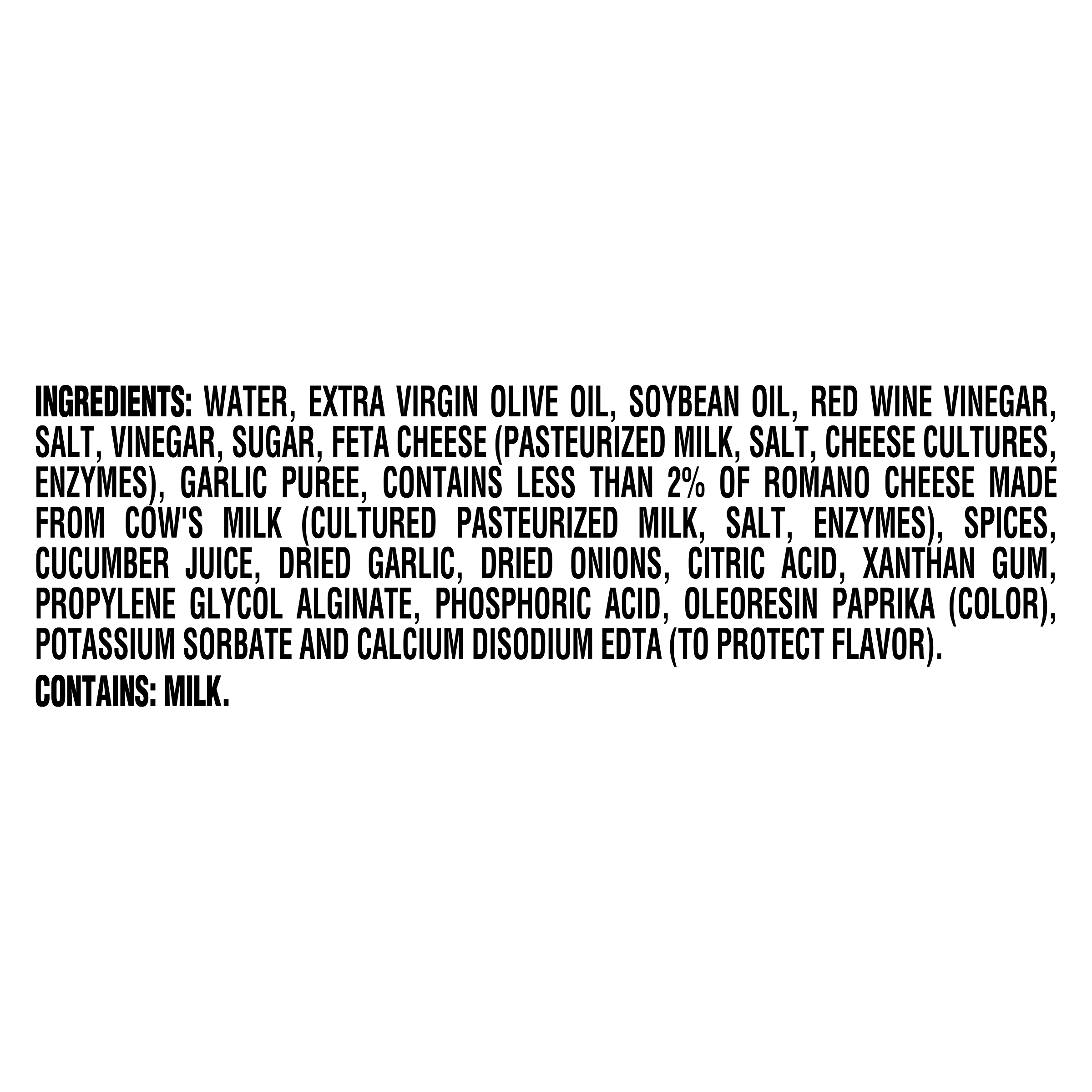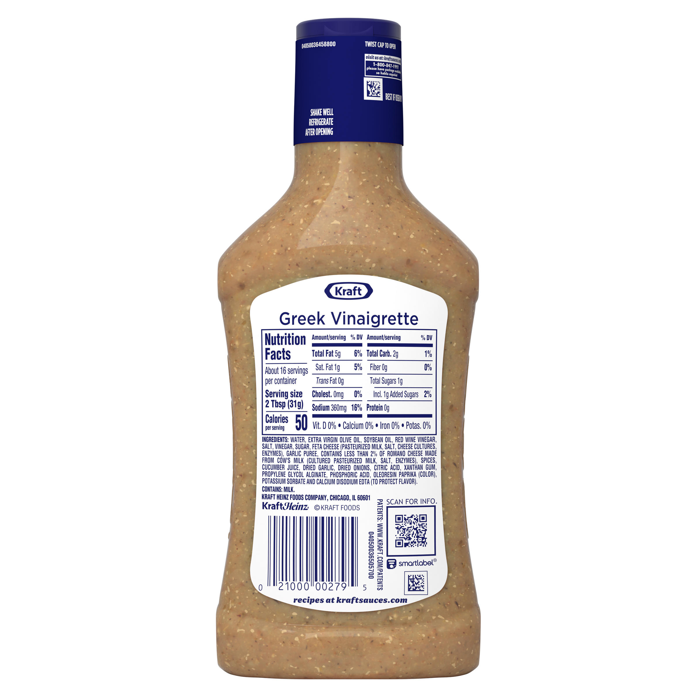 GTIN 00021000002795 Kraft Item Code (SKU) 00210000027970 Product Status Active Pack Level EACH Brand Name Kraft Business Unit Elevation Catalog Platform Taste Elevation Product Category Salad Dressings Consumer Unit Size 16 Consumer Unit Size UOM FO Packaging Type (Computed) Bottle Packaging Type Code BOTTLE Packaging Type Code Override (Manual) BOTTLE Sub Units Per Item 1 Variant Greek Vinaigrette Global Product Classification Dressings/Dips (Shelf Stable) Global Product Classification Code 10000200 Computed Exports - Ingredients WATER, EXTRA VIRGIN OLIVE OIL, SOYBEAN OIL, RED WINE VINEGAR, SALT, VINEGAR, SUGAR, FETA CHEESE (PASTEURIZED MILK, SALT, CHEESE CULTURES, ENZYMES), GARLIC PUREE, CONTAINS LESS THAN 2% OF ROMANO CHEESE MADE FROM COW'S MILK (CULTURED PASTEURIZED MILK, SALT, ENZYMES), SPICES, CUCUMBER JUICE, DRIED GARLIC, DRIED ONIONS, CITRIC ACID, XANTHAN GUM, PROPYLENE GLYCOL ALGINATE, PHOSPHORIC ACID, OLEORESIN PAPRIKA (COLOR), POTASSIUM SORBATE AND CALCIUM DISODIUM EDTA (TO PROTECT FLAVOR). Parent Reference 00021000685868 Quality Statement Shake Well | Best If Used By Storage Instructions Refrigerate After Opening Customer Guarantee 90 Temperature Classification Protected 1 to 35 °C / 34 to 95 °F Temperature Classification Code 09 Net Weight 1 Gross Weight 1.153 Weight UOM LB Height (in) 8.563 Length/Depth (in) 2 Width (in) 3.26 Case Cube 0.032 Parent Relation CASE_00021000685868 Parent Kraft Item Code (SKU) 00210006858600 Product Title Kraft Greek Vinaigrette, 16 fl oz Bottle eCommerce Product Name (Generic Name) Greek Vinaigrette Product Benefits (Includes Seasonal + Formatting) - One 16 fl oz bottle of Kraft Greek Vinaigrette