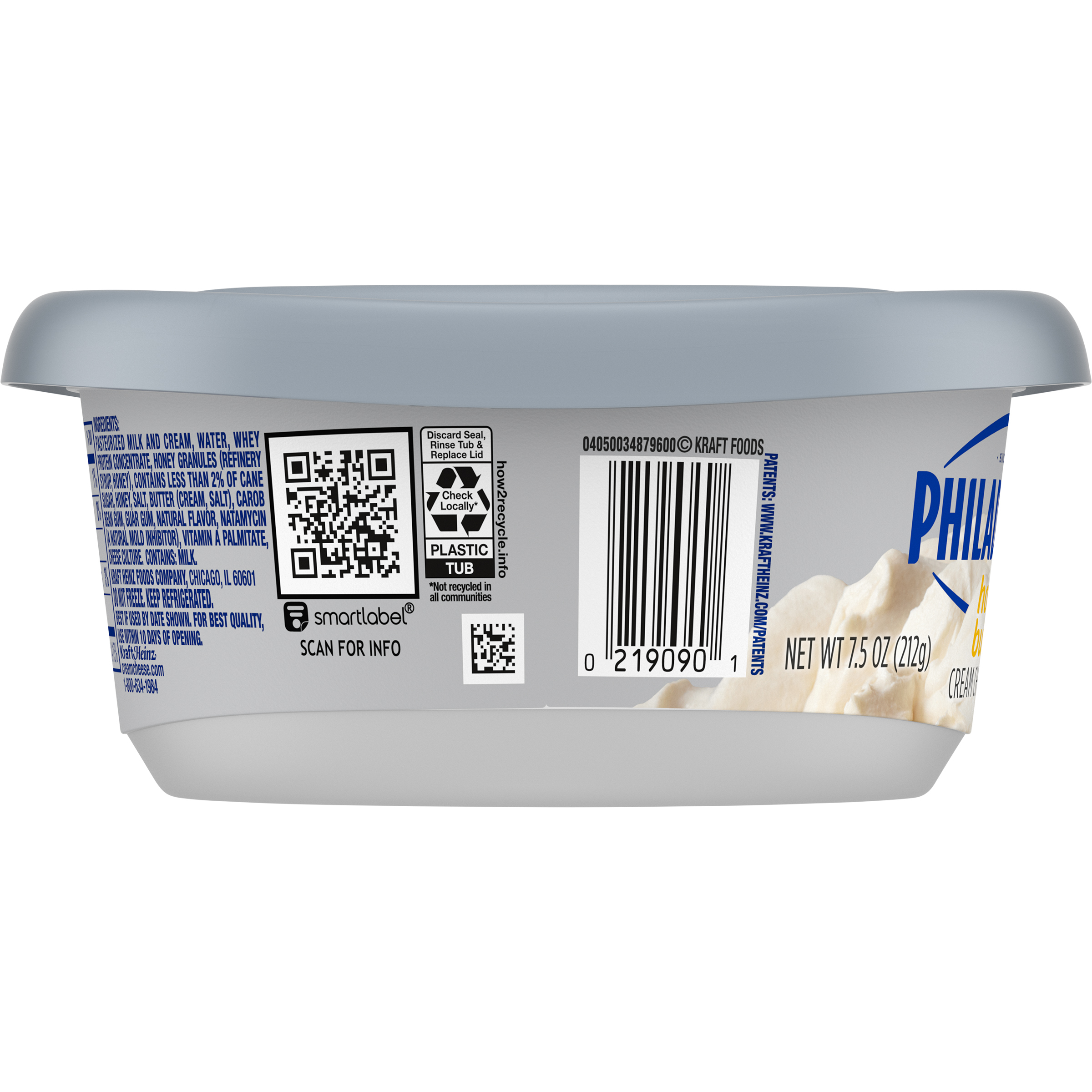 GTIN 00021000009091 Kraft Item Code (SKU) 00210000090970 Product Status Active Pack Level EACH Brand Name Philadelphia Business Unit Elevation Catalog Platform Taste Elevation Product Category Cream Cheese/Cheesecake Consumer Unit Size 7.5 Consumer Unit Size UOM OZ Packaging Type (Computed) Tub Packaging Type Code TUB Packaging Type Code Override (Manual) TUB Sub Units Per Item 1 Variant Honey Butter Global Product Classification Code 10000028 Computed Exports - Ingredients PASTEURIZED MILK AND CREAM, WATER, WHEY PROTEIN CONCENTRATE, HONEY GRANULES (REFINERY SYRUP, HONEY), CONTAINS LESS THAN 2% OF CANE SUGAR, HONEY, SALT, BUTTER (CREAM, SALT), CAROB BEAN GUM, GUAR GUM, NATURAL FLAVOR, NATAMYCIN (A NATURAL MOLD INHIBITOR), VITAMIN A PALMITATE, CHEESE CULTURE. Parent Reference 10021000009098 Quality Statement For Best Quality, Use Within 10 Days Of Opening | Best If Used By Date Shown Storage Instructions Do Not Freeze | Keep Refrigerated Customer Guarantee 60 Temperature Classification Code 04 Net Weight 0.469 Gross Weight 0.509 Weight UOM LB Height (in) 2.06 Length/Depth (in) 4.51 Width (in) 3.91 Case Cube 0.021 Parent Relation CASE_10021000009098 Parent Kraft Item Code (SKU) 00210000090900 Product Title Philadelphia Flavored Cream Cheese Spread, 1 Tub, for Smooth, Spreadable Mornings, Honey Butter Flavored with Other Natural Flavor, No Artificial Preservatives, Flavors or Dyes, 7.5 oz eCommerce Product Name (Generic Name) Honey Butter Cream Cheese Spread Product Benefits (Includes Seasonal + Formatting) - CREAM CHEESE SPREAD TUB: One 7.5 oz tub of Philadelphia Honey Butter Flavored with Other Natural Flavor Cream Cheese Spread