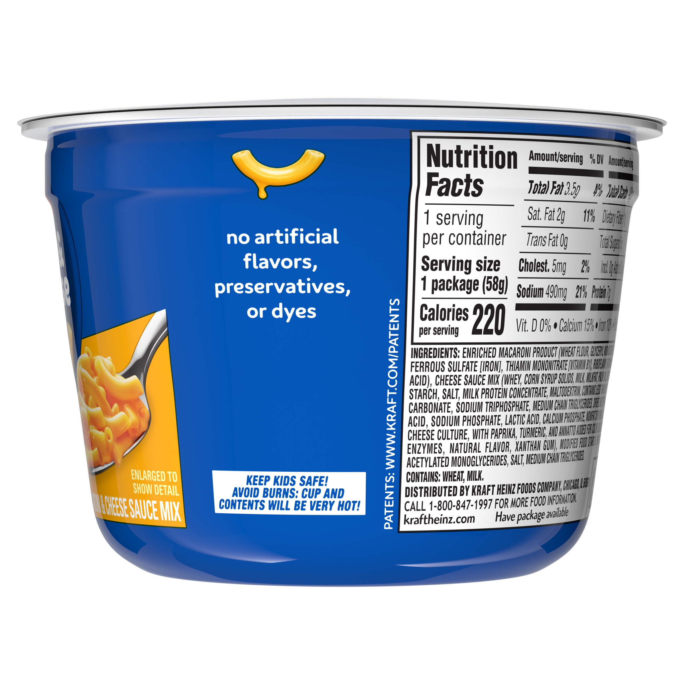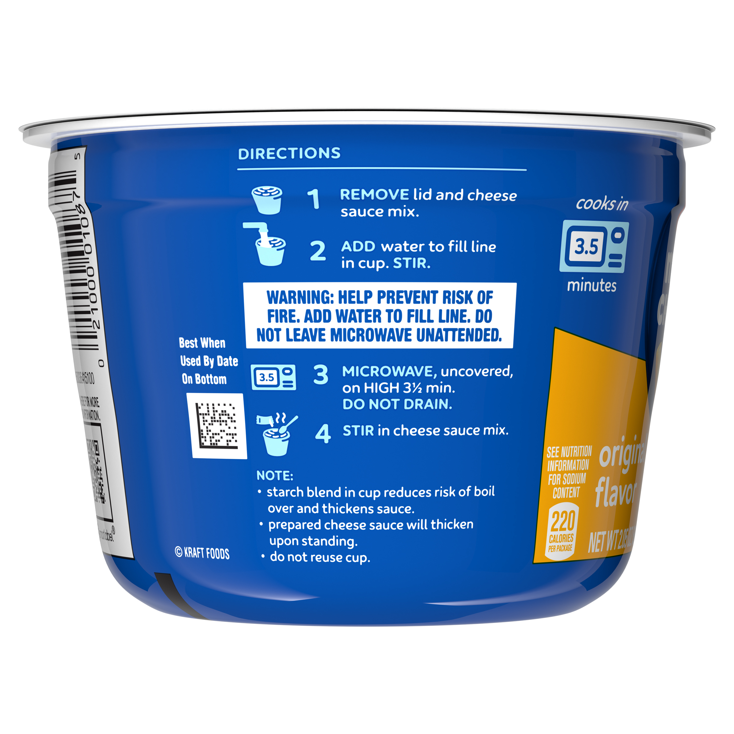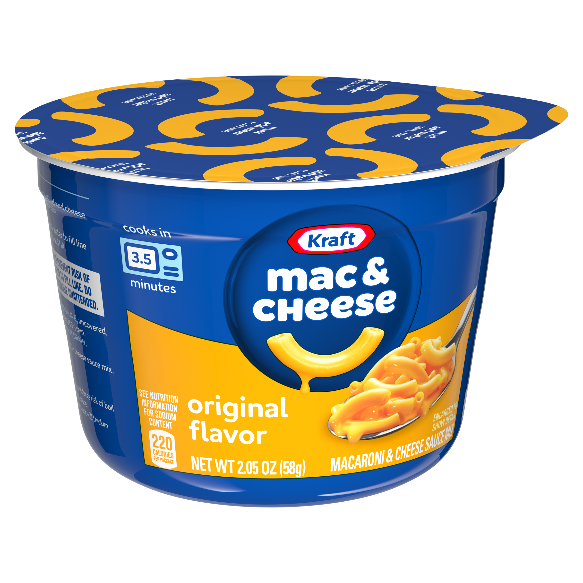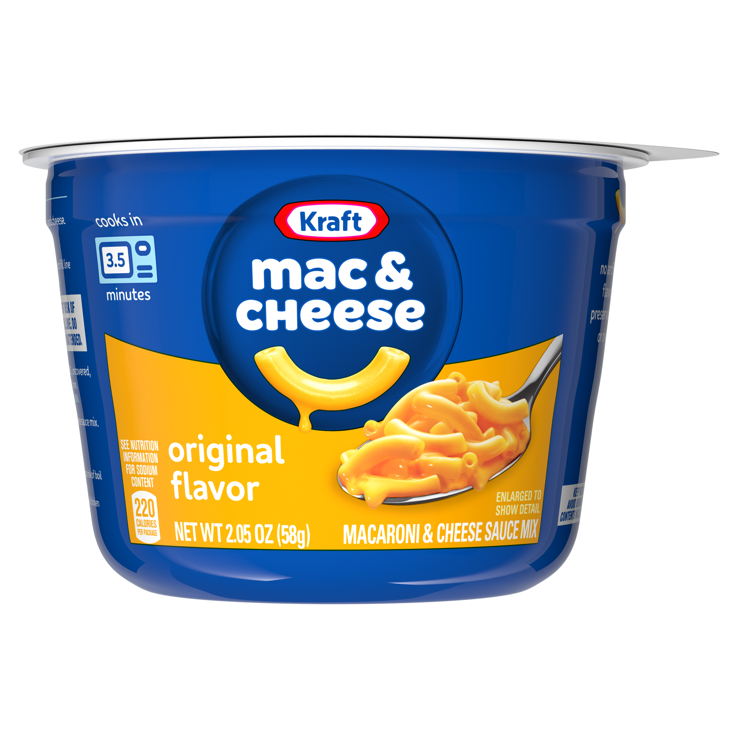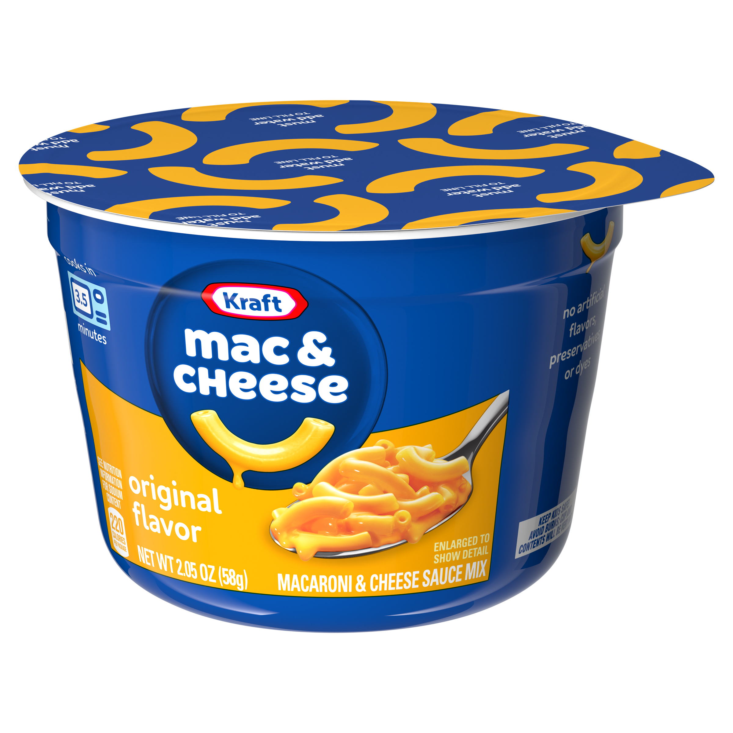 Product Description Help yourself to a cup of comfort. Kraft Original Mac and Cheese Dinner Cup is easy and ready in just minutes. Kids and adults love the rich taste and creamy texture of macaroni pasta with cheesy goodness. Easy mac cups include macaroni pasta and original flavor cheese sauce mix so you have everything you need to make delicious, quick mac and cheese by just adding water. Looking for microwave meals, kids meals or instant mac and cheese? Our macaroni cups are a great choice. With no artificial flavors, preservatives or dyes, our microwavable macaroni and cheese cups make a perfect snack or a classic meal side. Preparing our microwavable food is a breeze. Just combine the pasta with water up to the fill line in the cup, microwave for 3.5 minutes and stir in the cheese sauce mix. Each cup includes one 2.05-ounce microwavable meal. Stir up new ways to enjoy Kraft Mac n Cheese by adding protein, hot sauce, condiments, or seasonings to make it your own. A wholesome tradition, Kraft Mac & Cheese has been bringing generations together since 1937. Kraft Mac and Cheese inspires the positive power of comfort, so keep your pantry stocked with our dinner sides and enjoy cheesy goodness anytime.