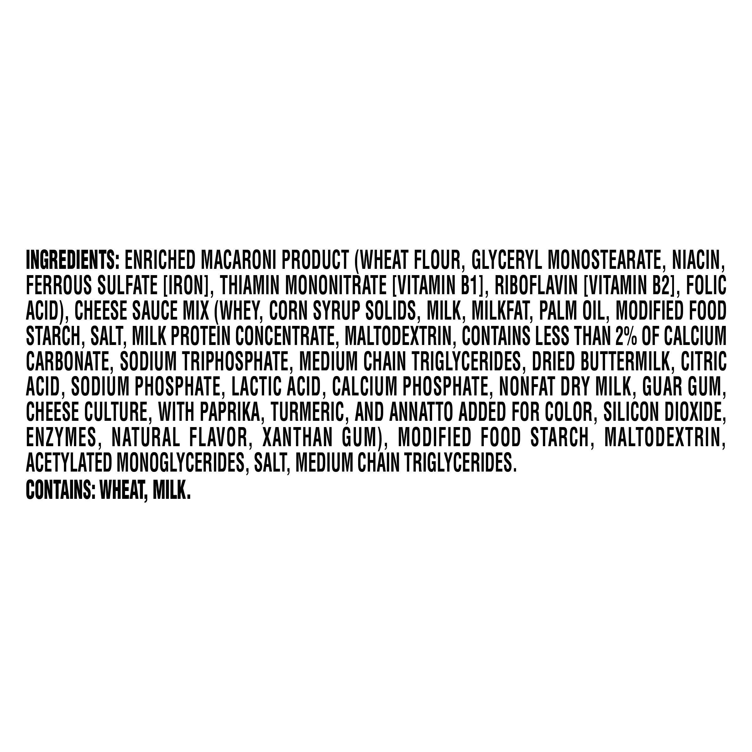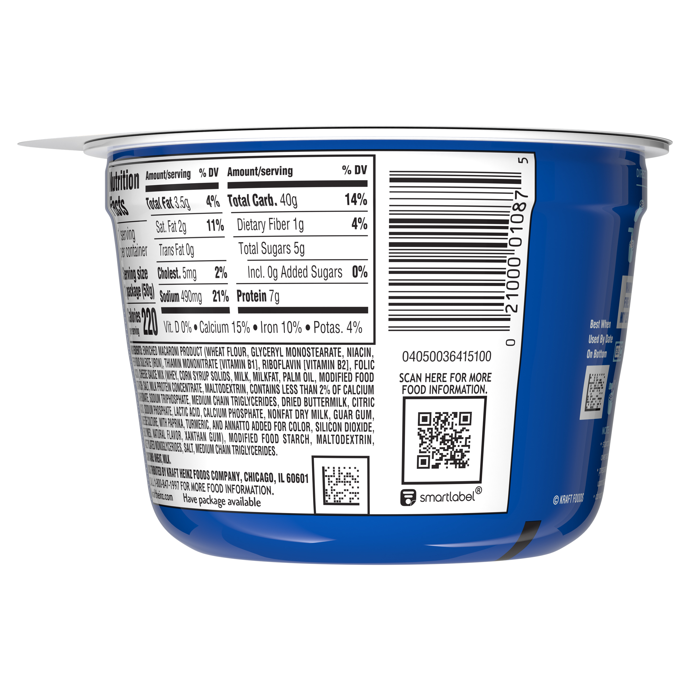 GTIN 00021000010875 Kraft Item Code (SKU) 00210000108770 Product Status Active Pack Level EACH Brand Name Kraft Business Unit Hydration Desserts & Meals Catalog Platform Easy Ready Meals Product Category Mac & Cheese Consumer Unit Size 2.05 Consumer Unit Size UOM OZ Packaging Type (Computed) Tub Packaging Type Code TUB Packaging Type Code Override (Manual) CUP Sub Units Per Item 1 Variant ORIGINAL Global Product Classification Pasta/Noodles - Not Ready to Eat (Shelf Stable) Global Product Classification Code 10000242 Computed Exports - Ingredients ENRICHED MACARONI PRODUCT (WHEAT FLOUR, GLYCERYL MONOSTEARATE, NIACIN, FERROUS SULFATE [IRON], THIAMIN MONONITRATE [VITAMIN B1], RIBOFLAVIN [VITAMIN B2], FOLIC ACID); CHEESE SAUCE MIX (WHEY, CORN SYRUP SOLIDS, MILK, MILKFAT, PALM OIL, MODIFIED FOOD STARCH, SALT, MILK PROTEIN CONCENTRATE,, MALTODEXTRIN, CONTAINS LESS THAN 2% OF CALCIUM CARBONATE, SODIUM TRIPHOSPHATE, MEDIUM CHAIN TRIGLYCERIDES, DRIED BUTTERMILK, CITRIC ACID, SODIUM PHOSPHATE, LACTIC ACID, CALCIUM PHOSPHATE, NONFAT DRY MILK, GUAR GUM, CHEESE CULTURE, WITH PAPRIKA, TURMERIC, AND ANNATTO ADDED FOR COLOR, SILICON DIOXIDE, ENZYMES, NATURAL FLAVOR, XANTHAN GUM), MODIFIED FOOD STARCH, MALTODEXTRIN, ACETYLATED MONOGLYCERIDES, SALT, MEDIUM CHAIN TRIGLYCERIDES. Parent Reference 00021000026272 Preparation Instructions To Prepare EASY MAC Cup REMOVE lid and Cheese Sauce Mix. ADD water to fill line in cup. STIR. WARNING: HELP PREVENT RISK OF FIRE. ADD WATER TO FILL LINE. DO NOT LEAVE MICROWAVE UNATTENDED. MICROWAVE, uncovered, on HIGH 3-1/2 min. DO NOT DRAIN. STIR IN cheese sauce mix. Note: - Starch blend in cup reduces risk of boil over and thickens sauce. - Prepared cheese sauce will thicken upon standing. - Do not reuse cup. KEEP KIDS SAFE! AVOID BURNS: CUP AND CONTENTS WILL BE VERY HOT. Customer Guarantee 90 Temperature Classification Ambient Prevailing Conditions Temperature Classification Code 01 Net Weight 0.128 Gross Weight 0.158 Weight UOM LB Height (in) 2.81 Length/Depth (in) 4.05 Width (in) 4.05 Case Cube 0.027 Parent Relation CASE_00021000026272 Parent Kraft Item Code (SKU) 00210000262700 Product Title Kraft Mac and Cheese, 1 Cup, for Easy Dinner or Dinner Sides, Original Flavor, No Artificial Flavors, Preservatives or Dyes, 2.05 oz eCommerce Product Name (Generic Name) Original Mac & Cheese Macaroni and Cheese Dinner Product Benefits (Includes Seasonal + Formatting) - KRAFT MAC AND CHEESE CUPS: One 2.05 oz cup of Kraft Original Mac & Cheese Macaroni and Cheese Dinner