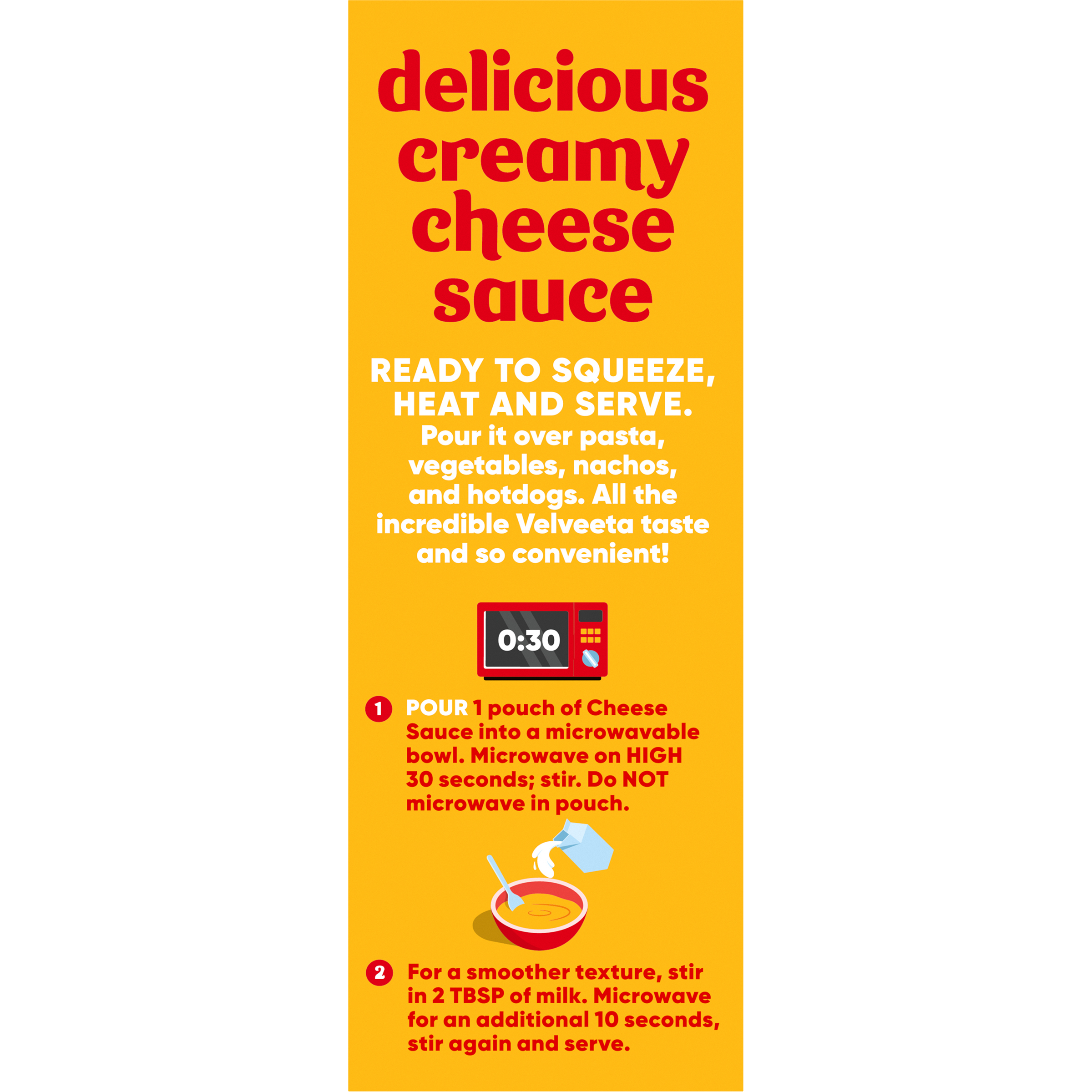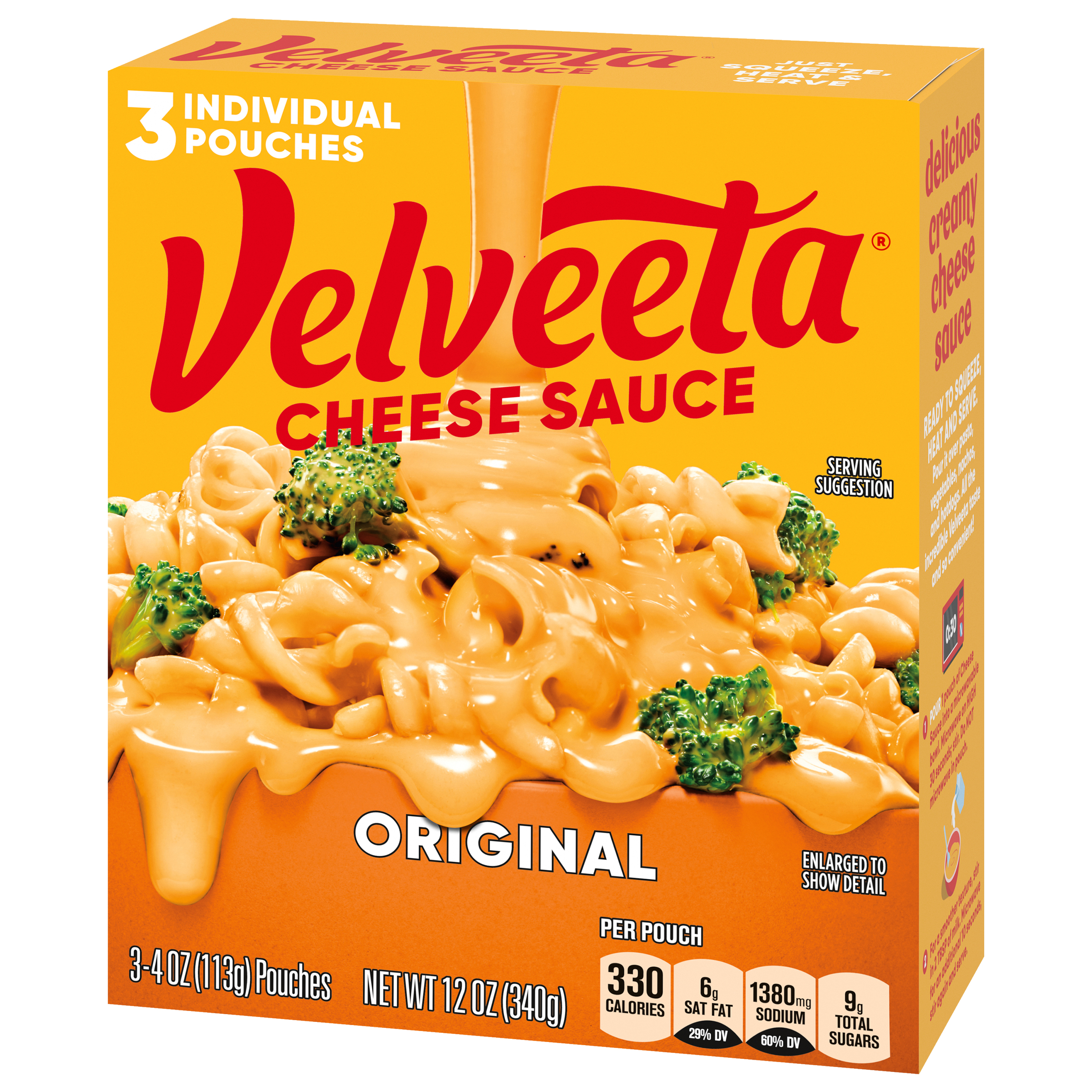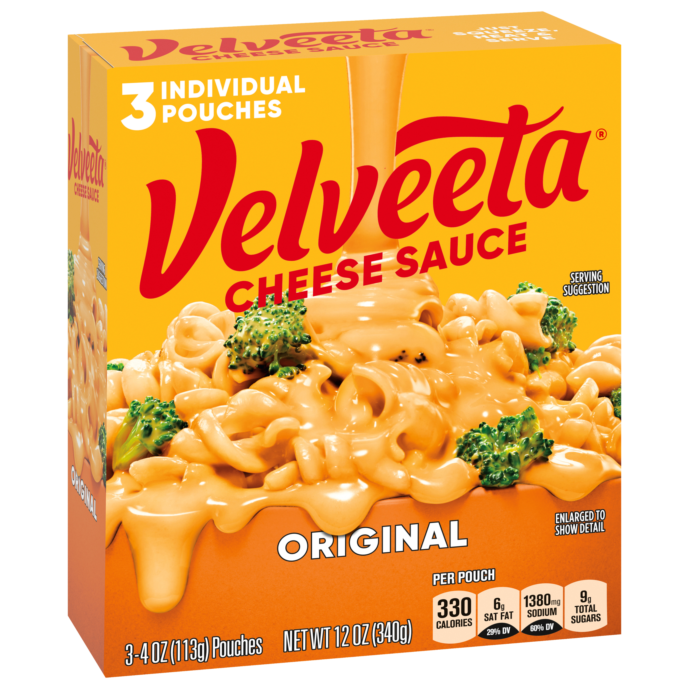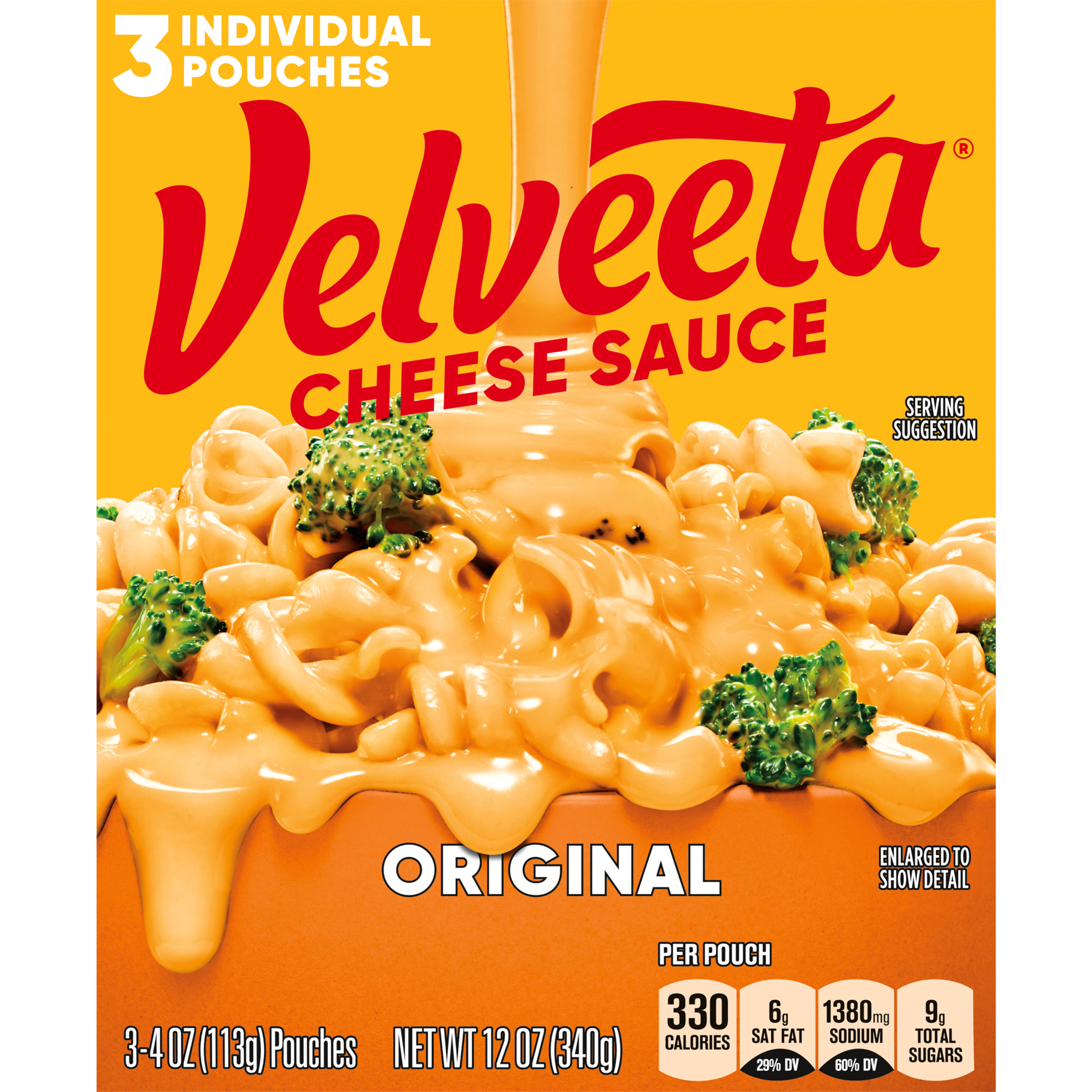 Product Description Viva la cheese! Live life to the creamiest with Velveeta Original Cheese Sauce Pouch. Craveable and flavorful, our cheese sauce contains real milk. When your drip is as smooth as ours, you don’t waste time when it comes to delicious, melty indulgence. For instant cheesy gratification, make your most enviable cheese dip or macaroni and cheese recipe, start a perfectly cheesy soup base, indulge in creamy pasta sauce, drizzle over nachos or add Velveeta to any side dish, entree or snack worth elevating to icon status. Velveeta’s supremely creamy texture, epic meltability and rich, savory taste satisfy your cravings any day of the week. Sometimes unnecessary is necessary, so kick back, relax and embrace the flavor, unapologetically. Each 12 oz box contains three 4 oz pouches. Refrigerate our cheese sauce after opening to maintain freshness. That’s La Dolce Velveeta!