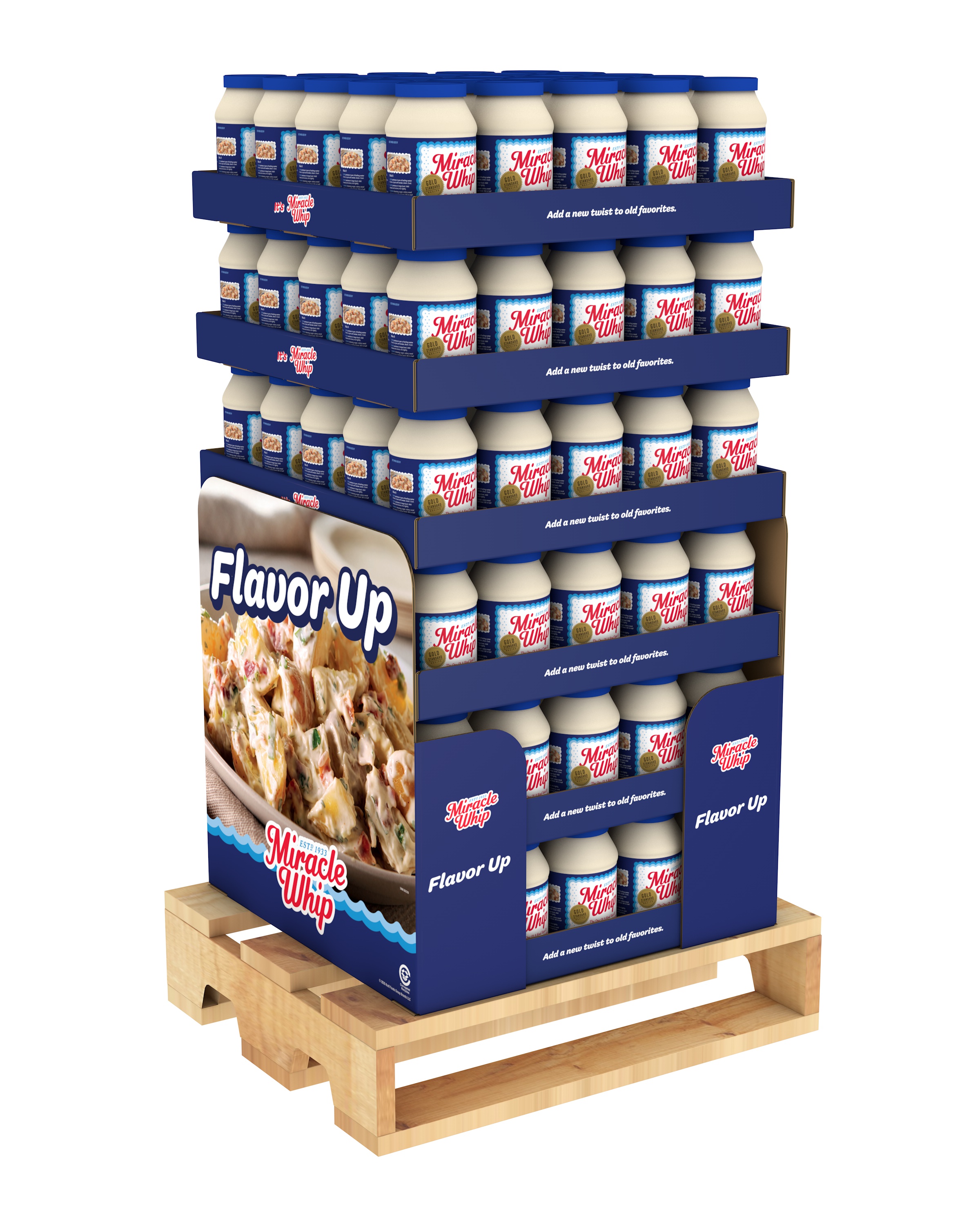 GTIN 00021000051373 Kraft Item Code (SKU) 00210000513700 Product Status Active Pack Level DISPLAY/SHIPPER Brand Name Kraft Business Unit Elevation Catalog Platform Taste Elevation Product Category Miracle Whip Consumer Unit Size 30 Consumer Unit Size UOM FO Packaging Type (Computed) Pack Packaging Type Code TRAY Sub Units Per Item 150 Global Product Classification Dressings/Dips (Shelf Stable) Global Product Classification Code 10000200 Computed Exports - Ingredients WATER, SOYBEAN OIL, HIGH FRUCTOSE CORN SYRUP, VINEGAR, MODIFIED CORNSTARCH, EGGS, SALT, NATURAL FLAVOR, MUSTARD FLOUR, POTASSIUM SORBATE AS A PRESERVATIVE, SPICES, PAPRIKA, DRIED GARLIC. Parent Reference 20021000051377 Child Reference 00021000026494 Customer Guarantee 90 Temperature Classification Protected 1 to 35 °C / 34 to 95 °F Temperature Classification Code 09 Net Weight 281.25 Gross Weight 328.2 Weight UOM LB Height (in) 43.875 Length/Depth (in) 24 Width (in) 20 Case Cube 12.188 Child Relation EACH_00021000026494 Parent Relation PALLET_20021000051377 Cases per Tier 4 Tiers per Pallet 1 Cases per Pallet 4 Pallet Stack Limit 1 Product Title SHP 30Z KR MW 150 eCommerce Product Name (Generic Name) Mayo-like Dressing, for a Keto and Low Carb Lifestyle Product Benefits (Includes Seasonal + Formatting) - One 30 fl. oz. jar of Miracle Whip Original Mayo-like Dressing
