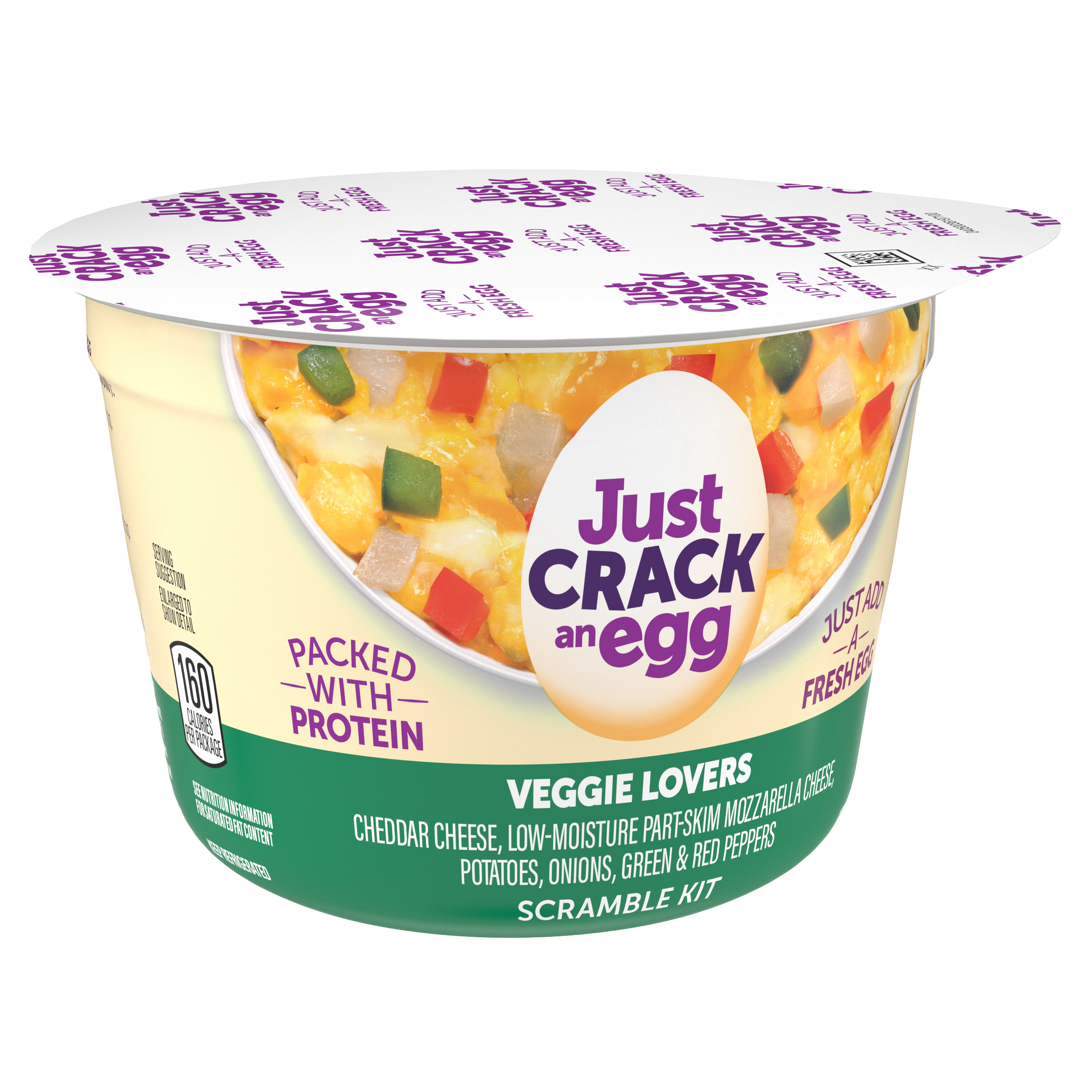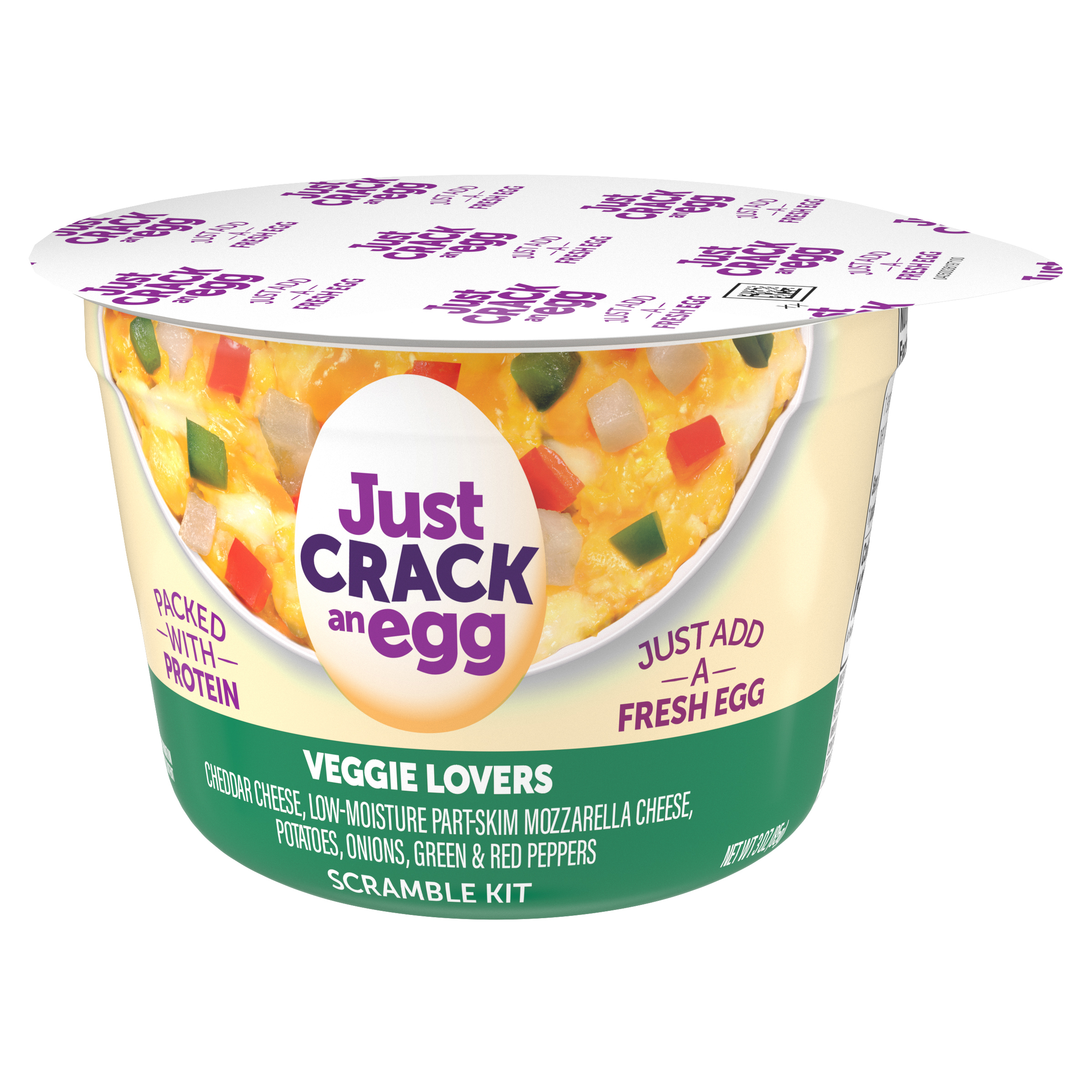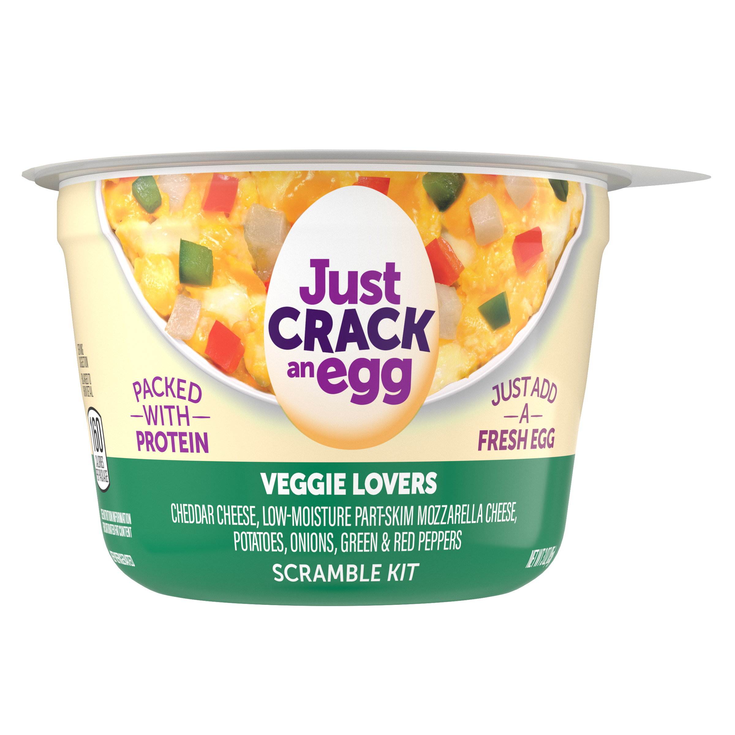 Product Description Kickstart your morning. Our Just Crack an Egg Scramble Kit lets you fuel up with protein and calcium. Just Crack an Egg Veggie Lovers Scramble Kit contains cheddar cheese, low-moisture part-skim mozzarella cheese, potatoes, onions, green and red peppers. Cooks in two minutes, simply crack a fresh egg into the cup, add the contents of the pouches to the cup, stir until blended and microwave according to the instructions. Packed with protein, each scramble kit contains 10 grams per serving. Ideal for those who follow a low-carb lifestyle, you can customize your scramble by making yours with two eggs or egg whites. Keep our scramble kits refrigerated until you're ready to prepare your quick and easy breakfast to enjoy at home or on the go. Make it yours and rediscover the joy of breakfast!