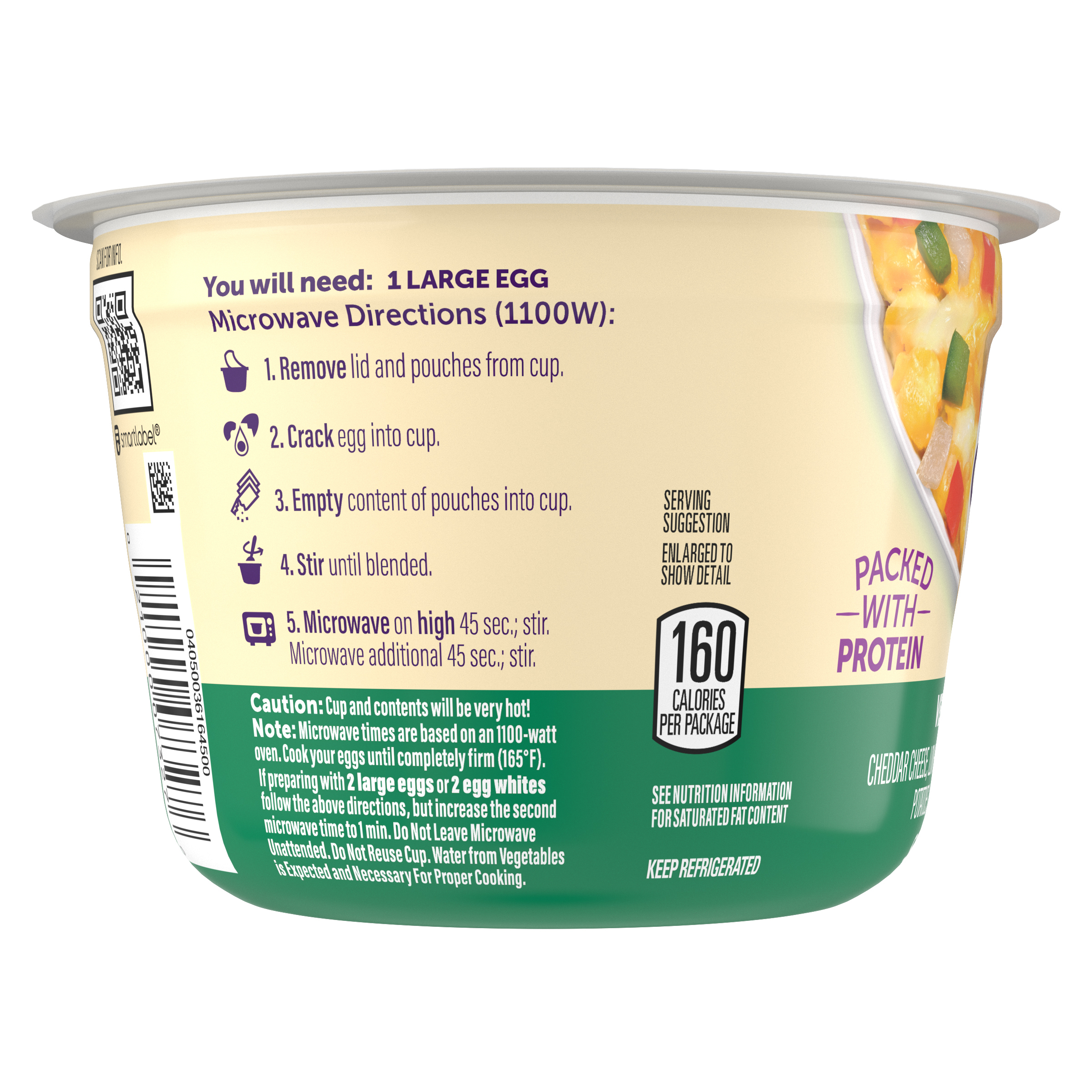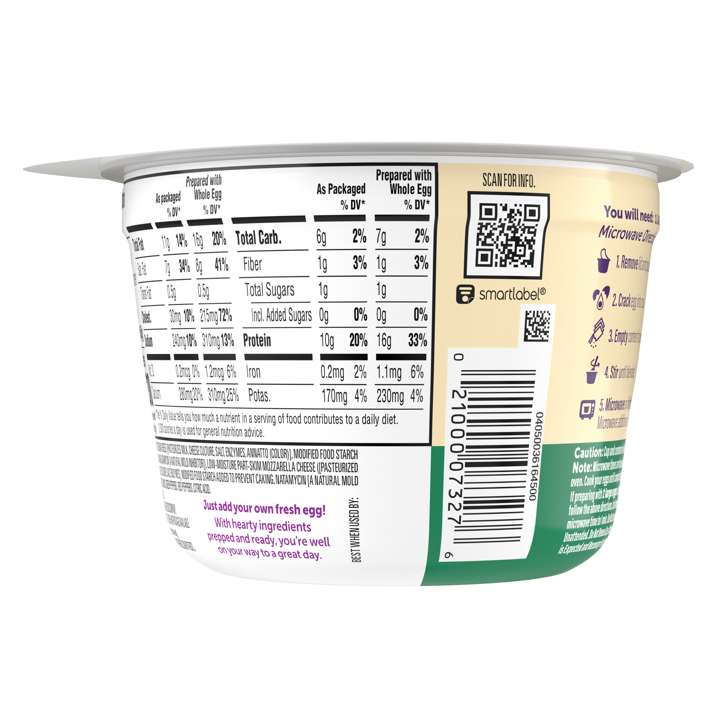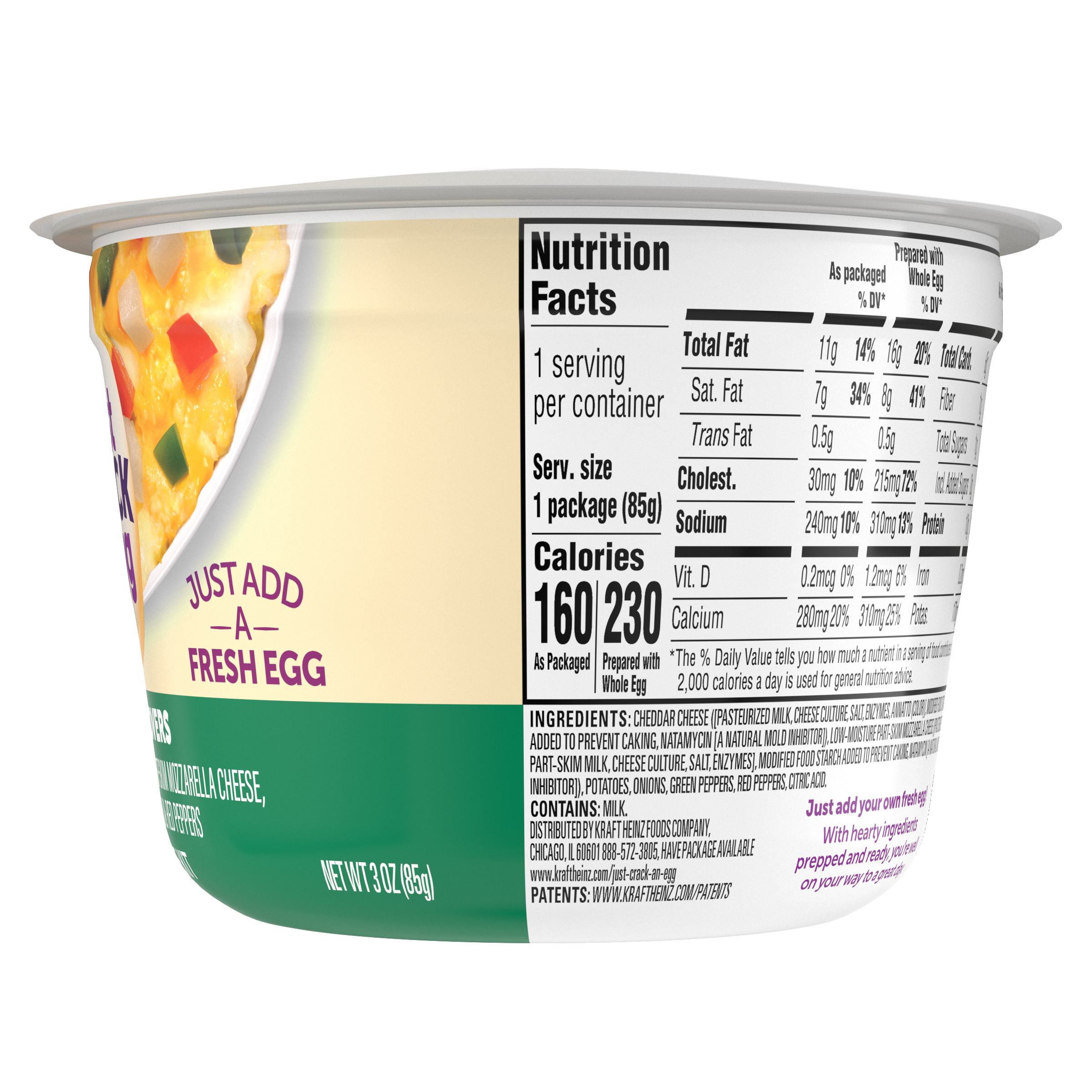 Product Description Kickstart your morning. Our Just Crack an Egg Scramble Kit lets you fuel up with protein and calcium. Just Crack an Egg Veggie Lovers Scramble Kit contains cheddar cheese, low-moisture part-skim mozzarella cheese, potatoes, onions, green and red peppers. Cooks in two minutes, simply crack a fresh egg into the cup, add the contents of the pouches to the cup, stir until blended and microwave according to the instructions. Packed with protein, each scramble kit contains 10 grams per serving. Ideal for those who follow a low-carb lifestyle, you can customize your scramble by making yours with two eggs or egg whites. Keep our scramble kits refrigerated until you're ready to prepare your quick and easy breakfast to enjoy at home or on the go. Make it yours and rediscover the joy of breakfast!