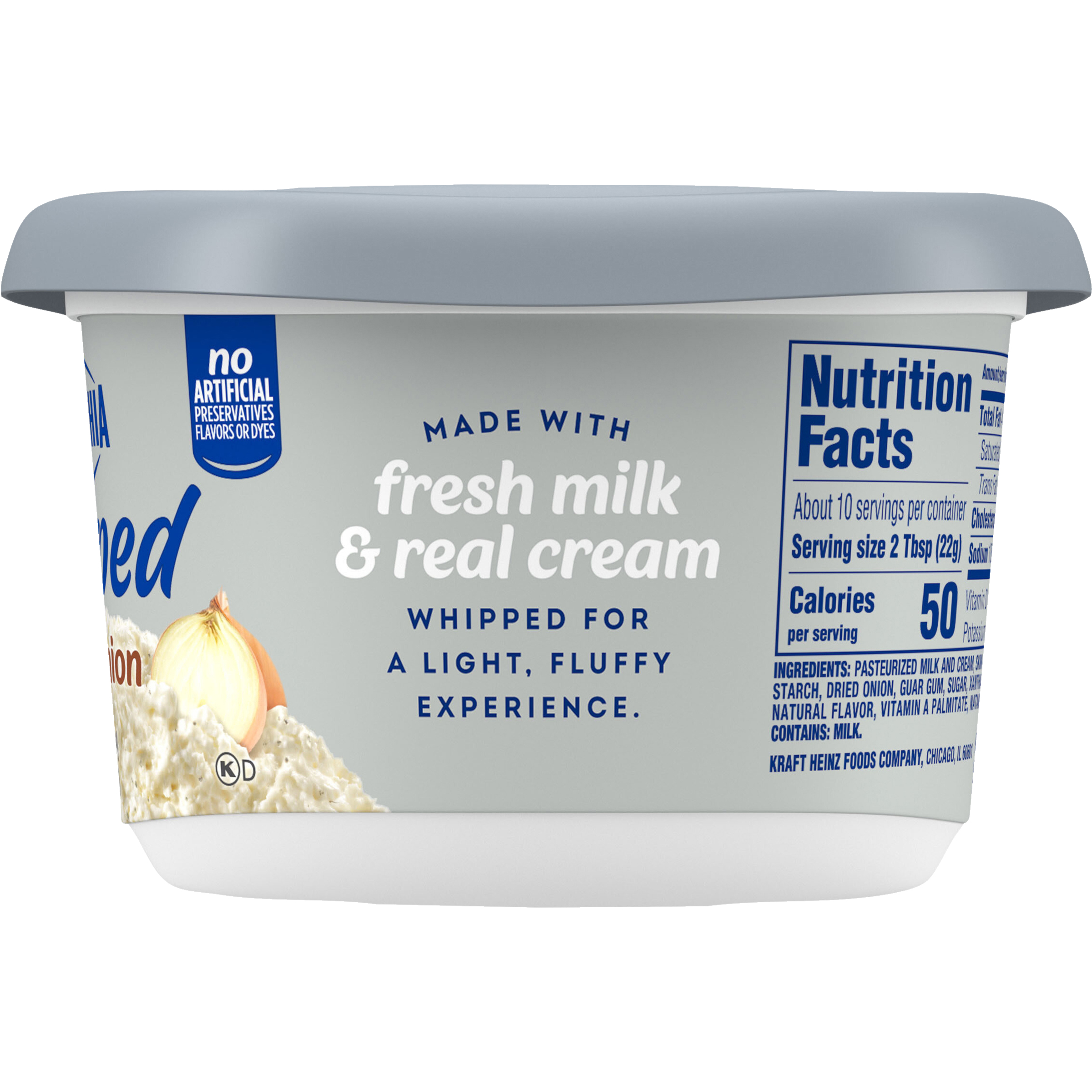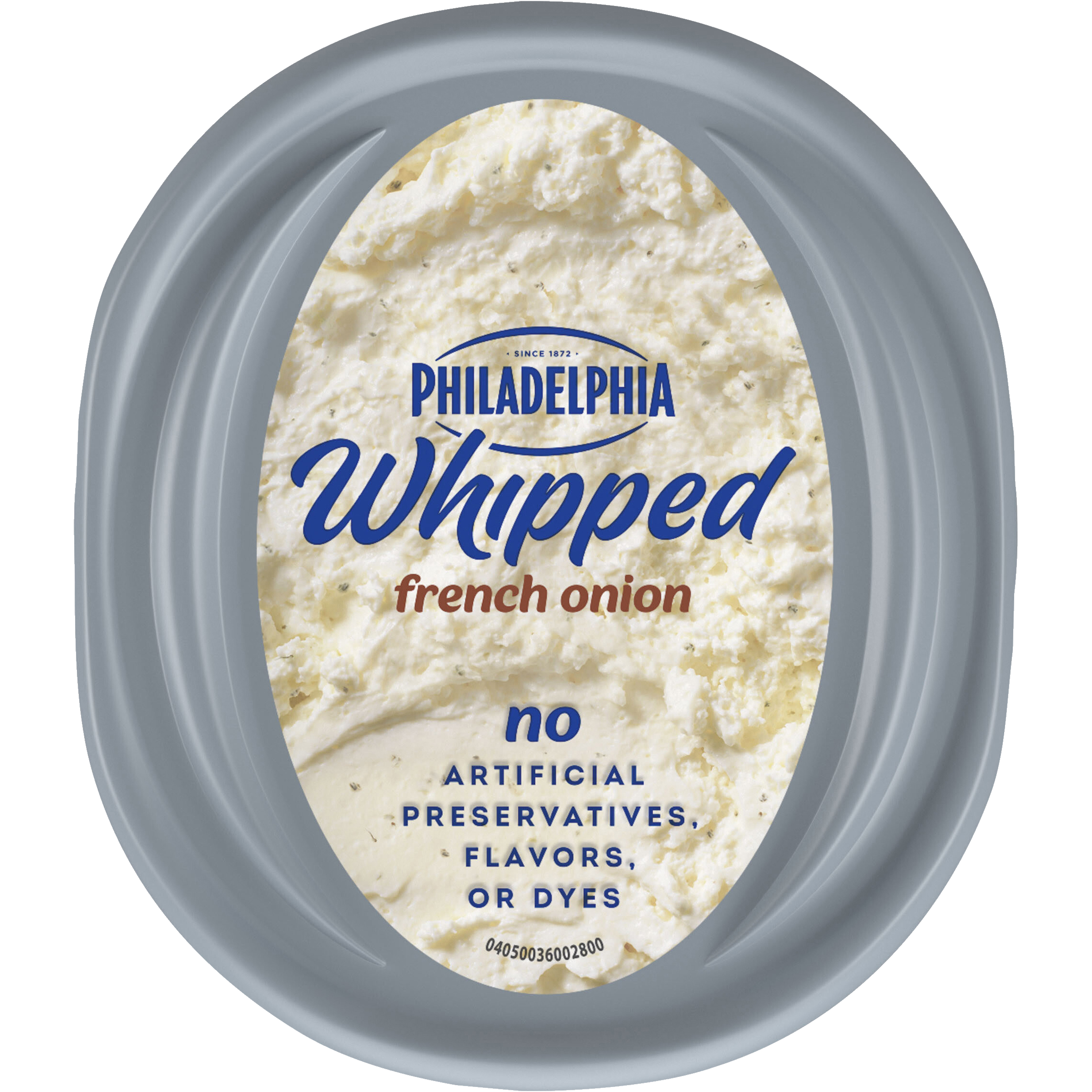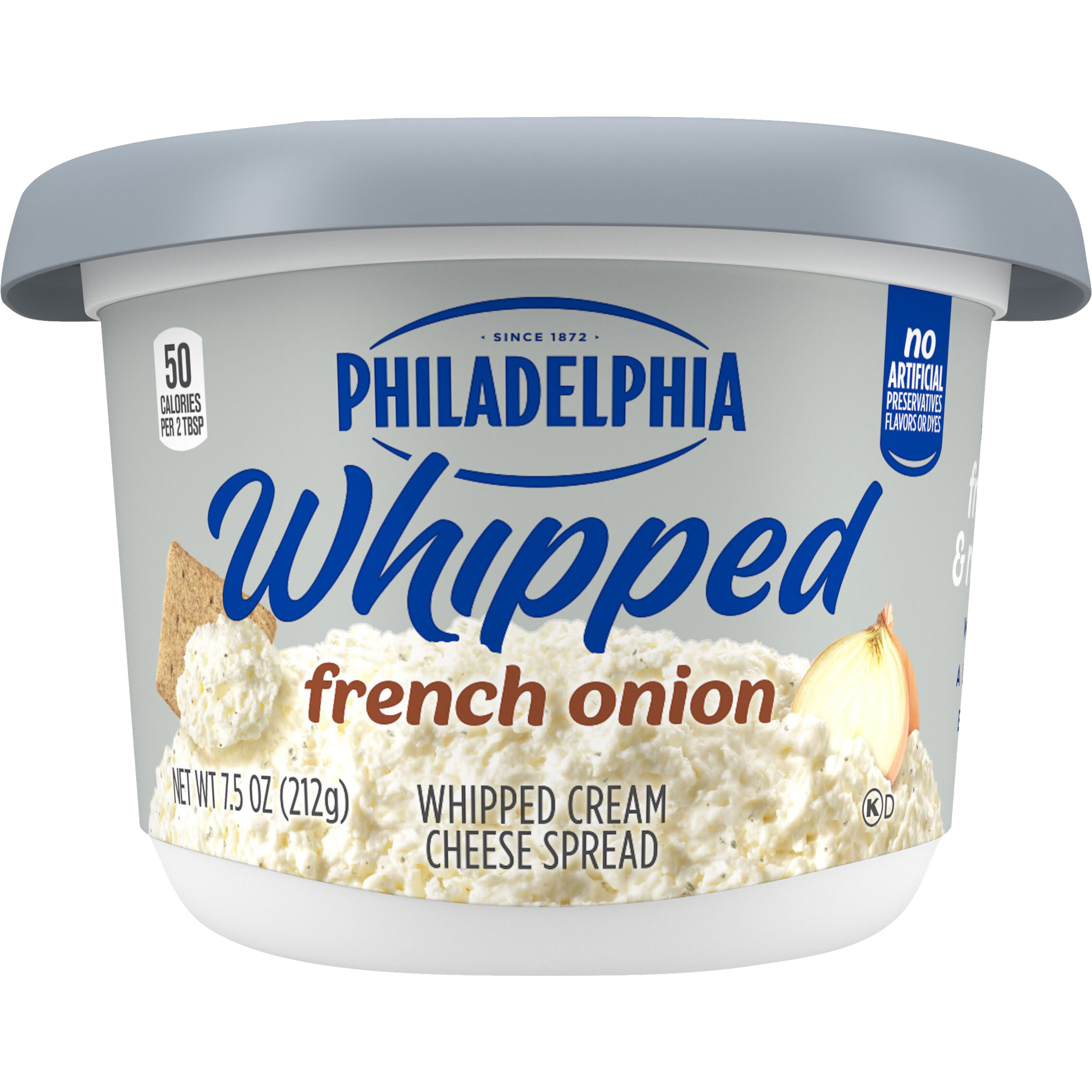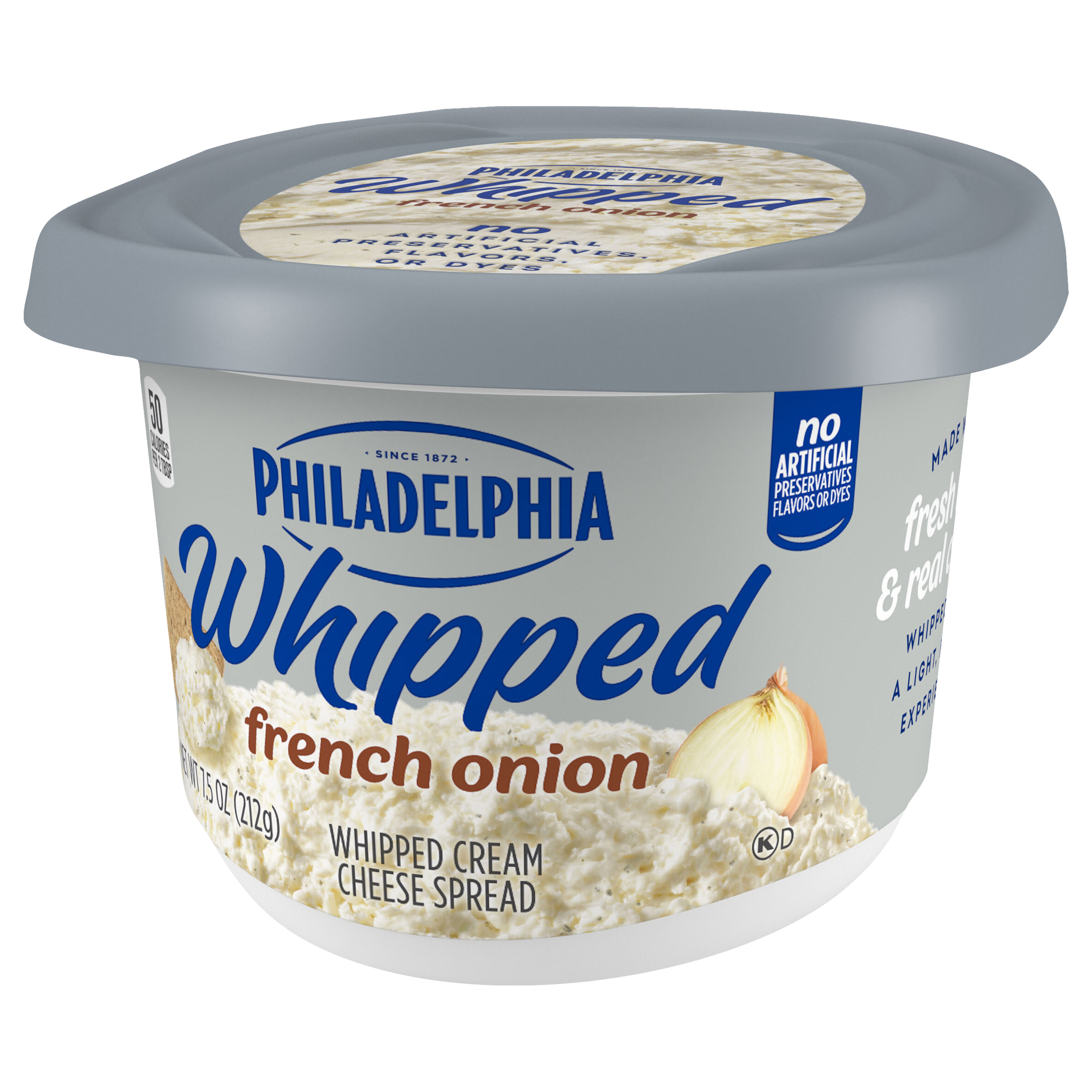 Product Description It's really Philly good. Philadelphia French Onion Whipped Cream Cheese Spread brings deliciously creamy texture and full flavor to your breakfast, snacks and recipes. Our creamy classic meets the comforting French onion flavor you love to create a tasty whipped spread. Light and fluffy French onion whipped cream cheese spread is the perfect choice for adding to your morning bagel or dipping veggies, pita chips and crackers. Looking for more ways to enjoy our cream cheese? The possibilities are endless. Philly your potatoes, pasta and eggs. Whether you're adding French onion whipped cream cheese spread to your favorite bagel, using it to bind flavorful wraps or swirling it into sauces for added creaminess, our soft whipped cream cheese spread does more than deliver — it elevates. Free from artificial preservatives, flavors and dyes, Philadelphia upholds a commitment to quality ingredients while giving you the consistency you expect. Packaged in a 7.5 oz tub, it's perfect for everyday use. Always have a tub on hand in the fridge so you're ready to whip up creamy creations. Keep refrigerated and do not freeze. For best quality, use within 10 days of opening. From classic spreads to creative twists, a tub of Philadelphia French Onion Whipped Cream Cheese Spread is a versatile staple. Add a creamy touch of magic with Philadelphia Whipped Cream Cheese.