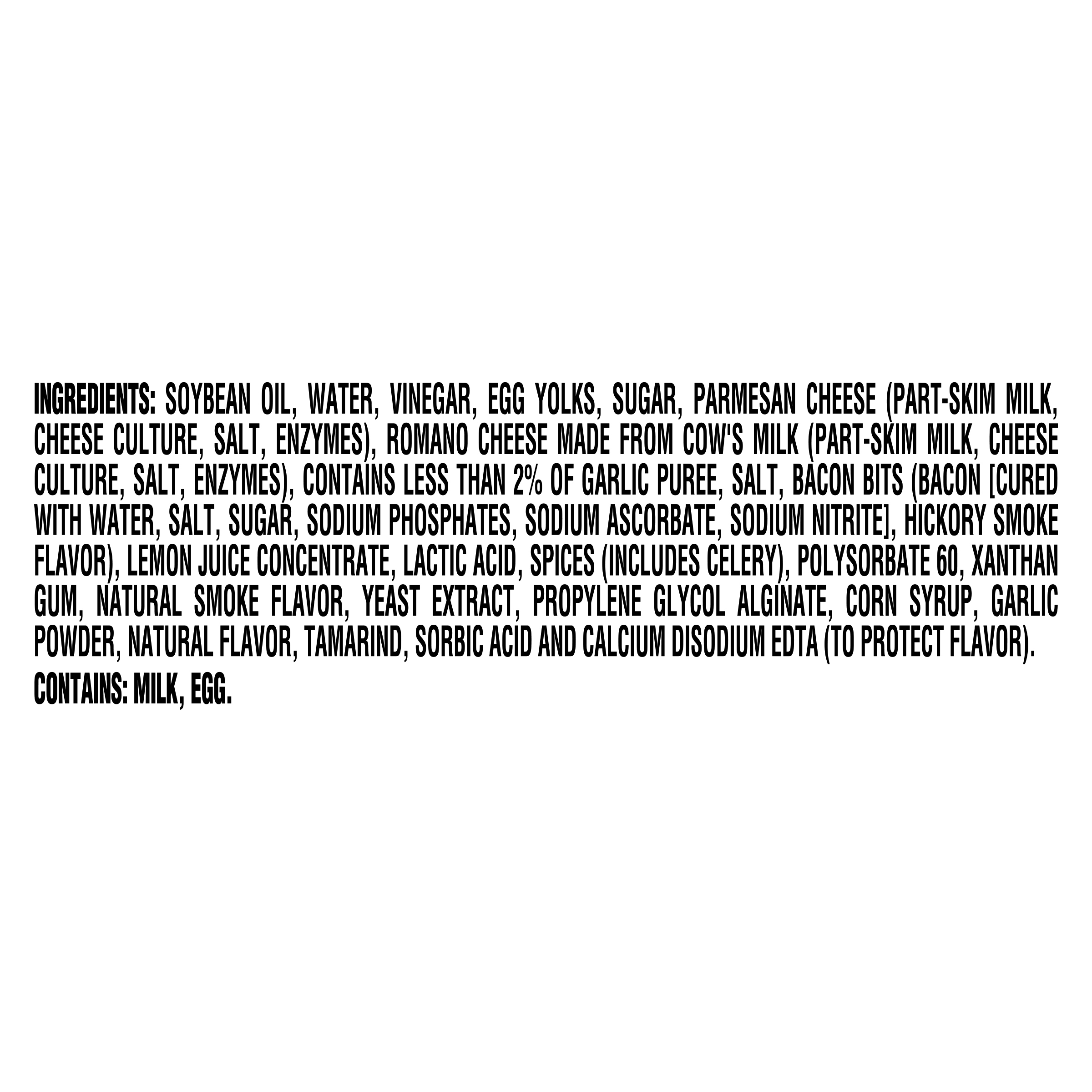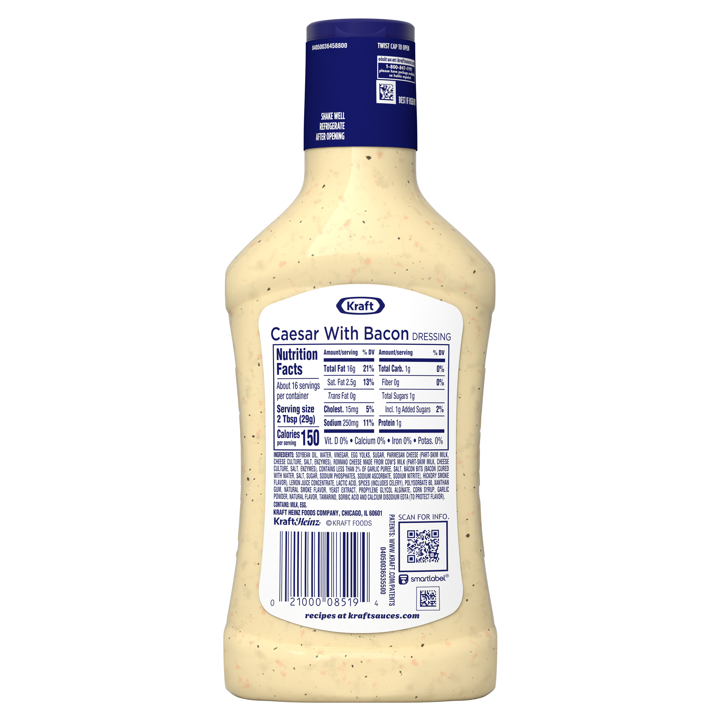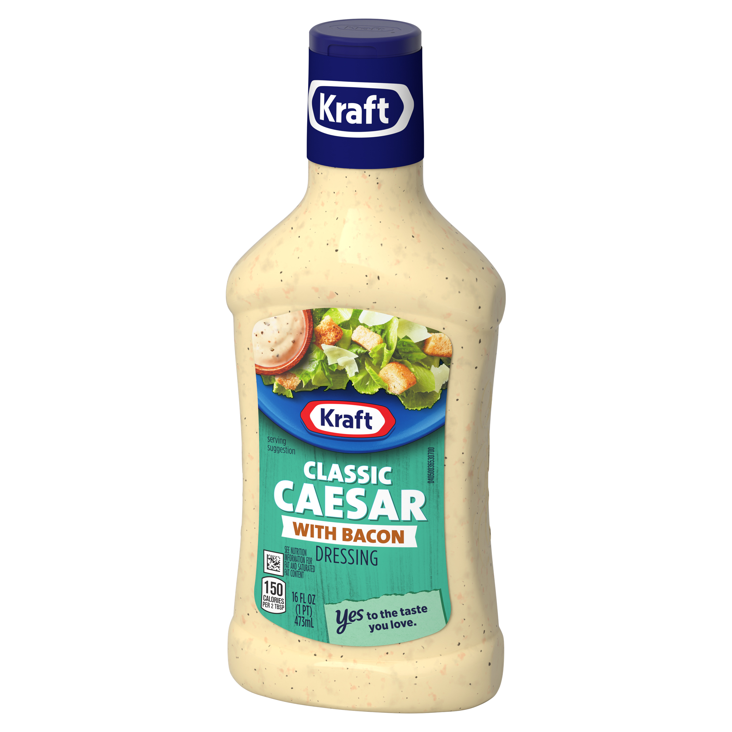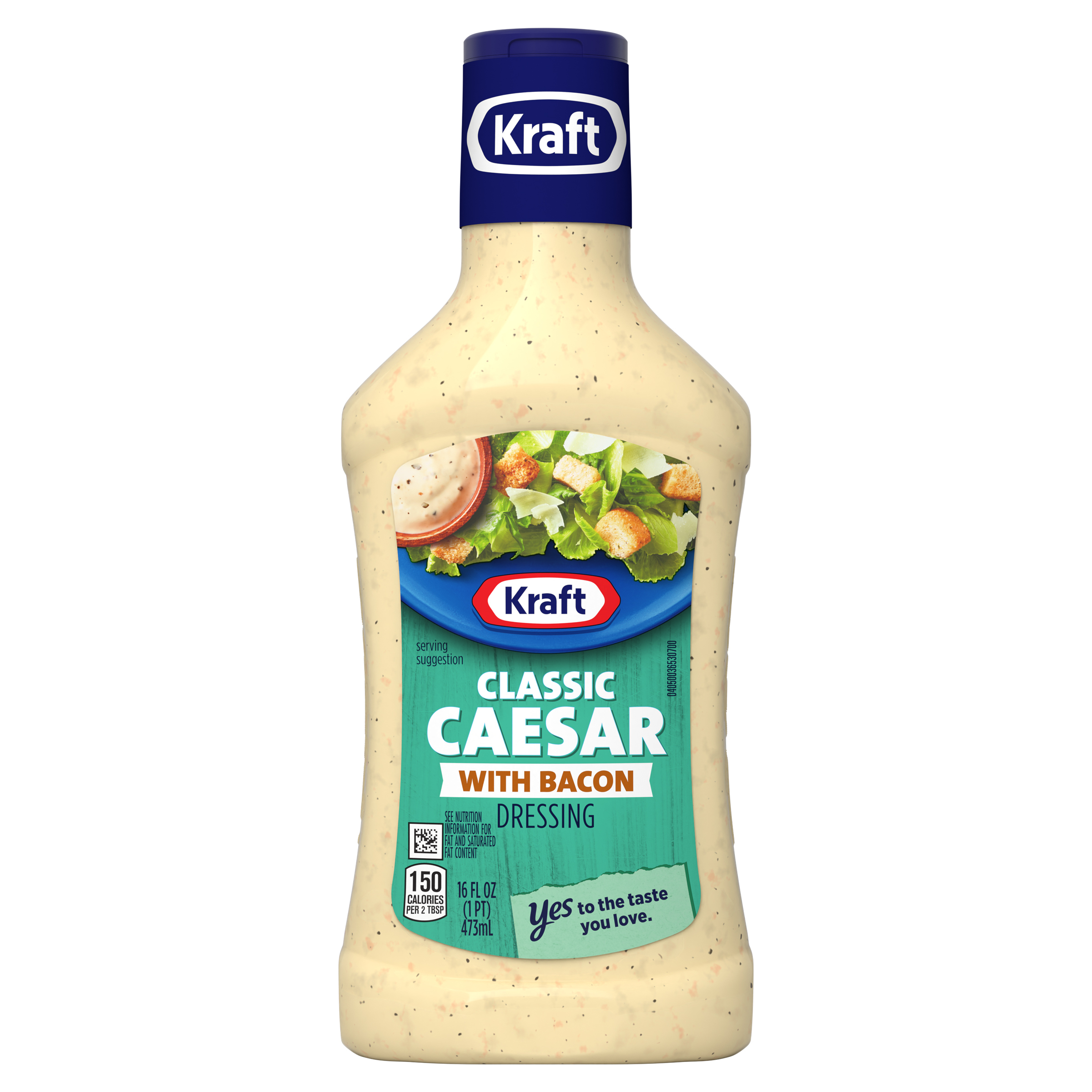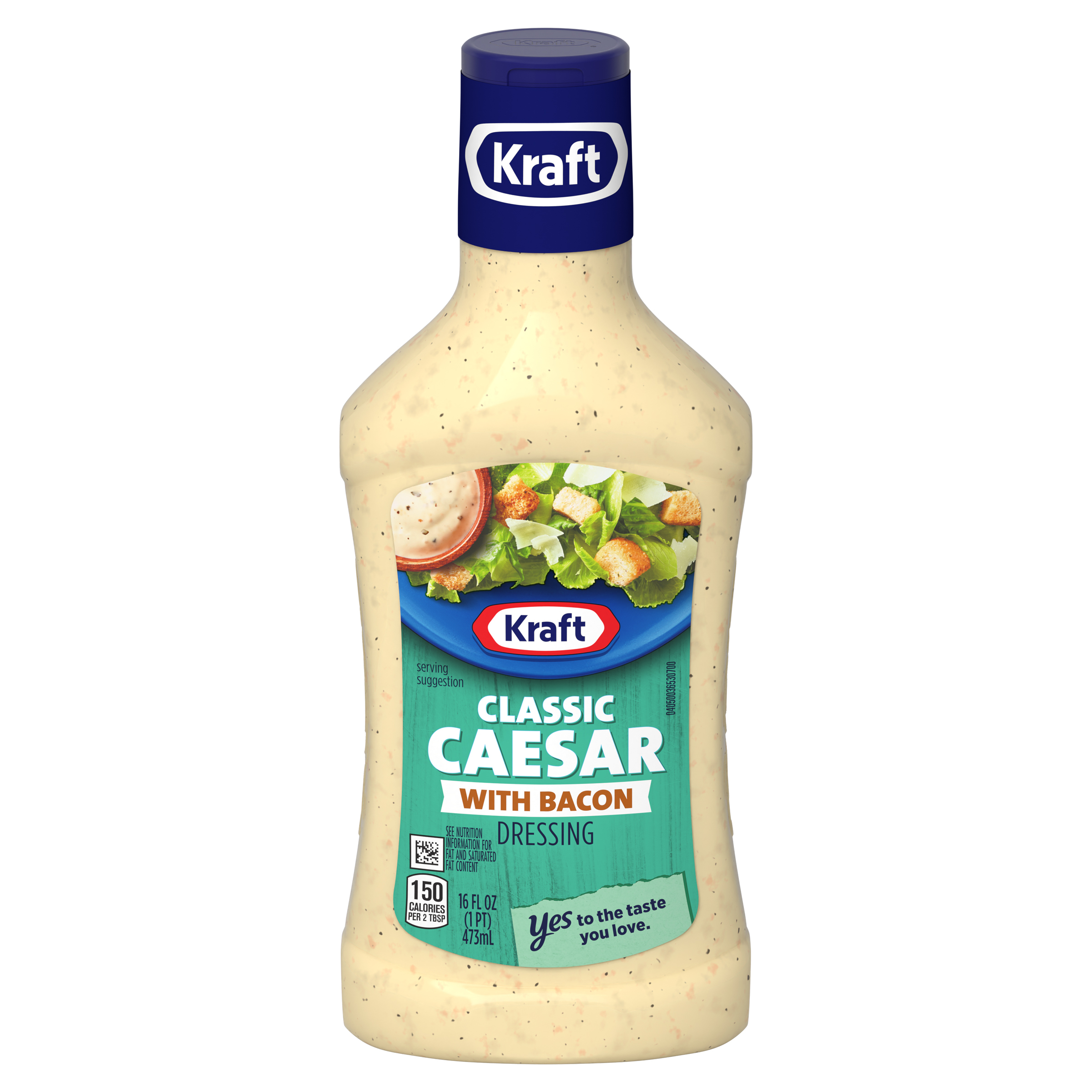 Product Description Meet the creamy classic that goes with everything. Caesar dressing — but make it bacon. Kraft Caesar with Bacon Dressing is made from Parmesan and Romano cheese and infused with the goodness of bacon. Add our bacon Caesar dressing to salads, sandwiches and wraps for the savory flavor your family trusts and loves. Our Caesar dressing makes a delicious dip for vegetables, chicken nuggets, fries or pizza. Each 16-ounce bottle contains about 16 servings. Shake well before use and refrigerate after opening.