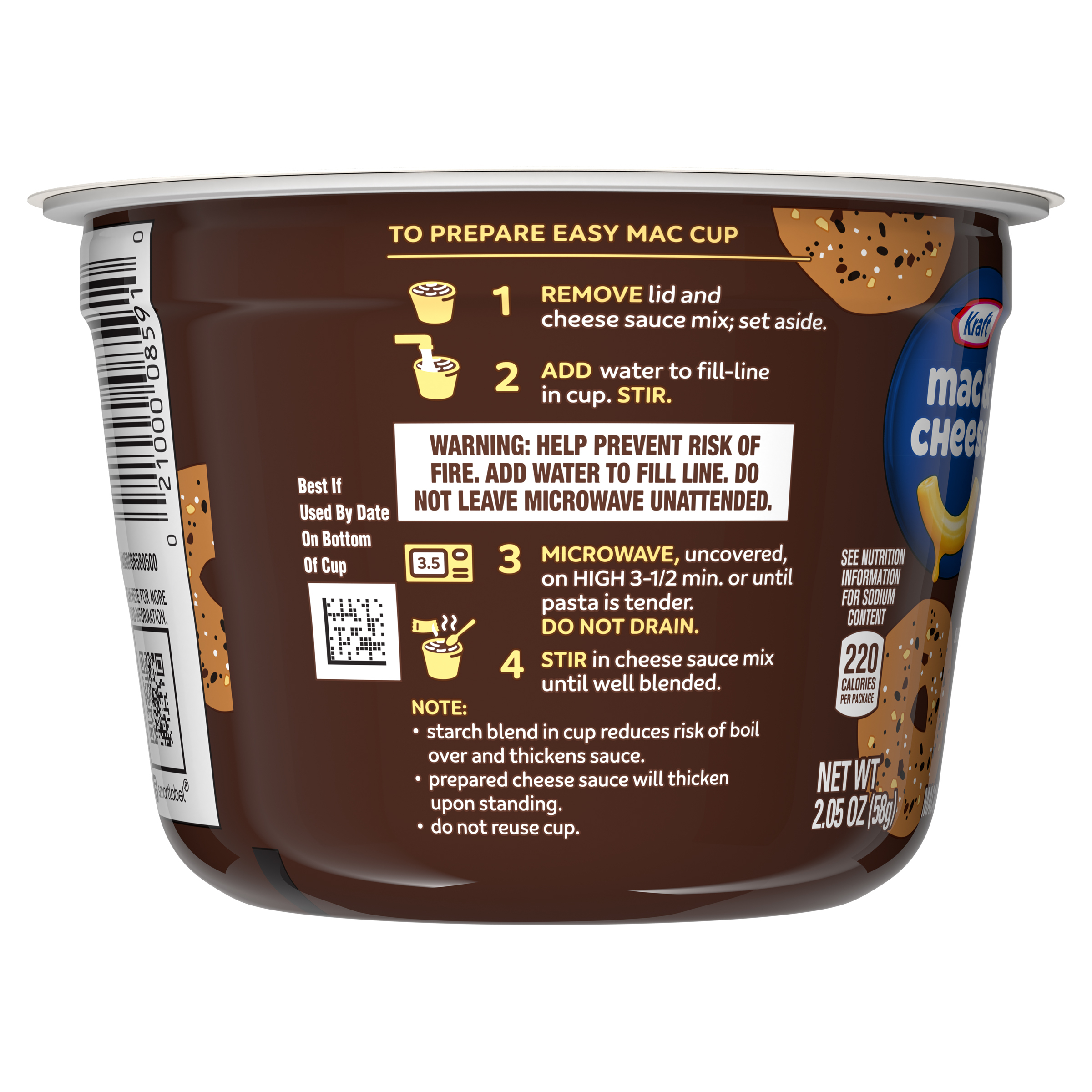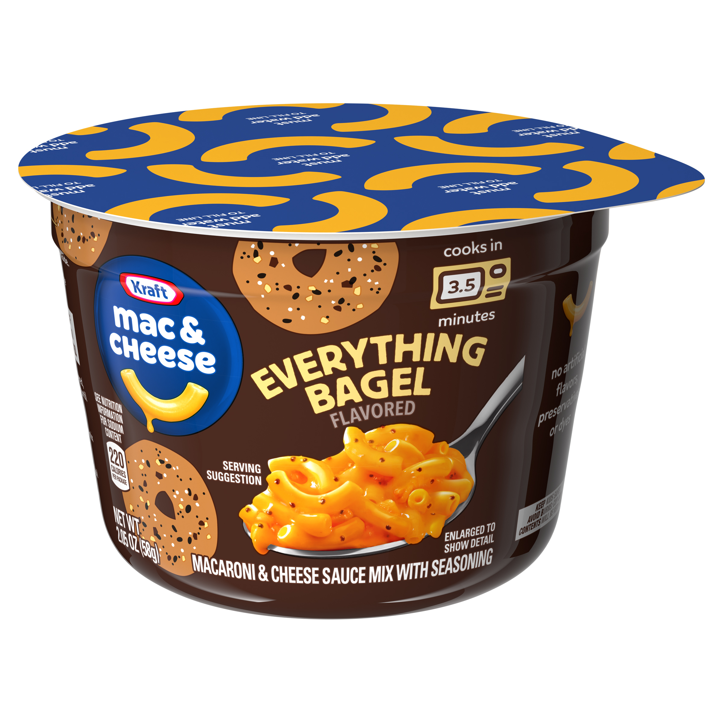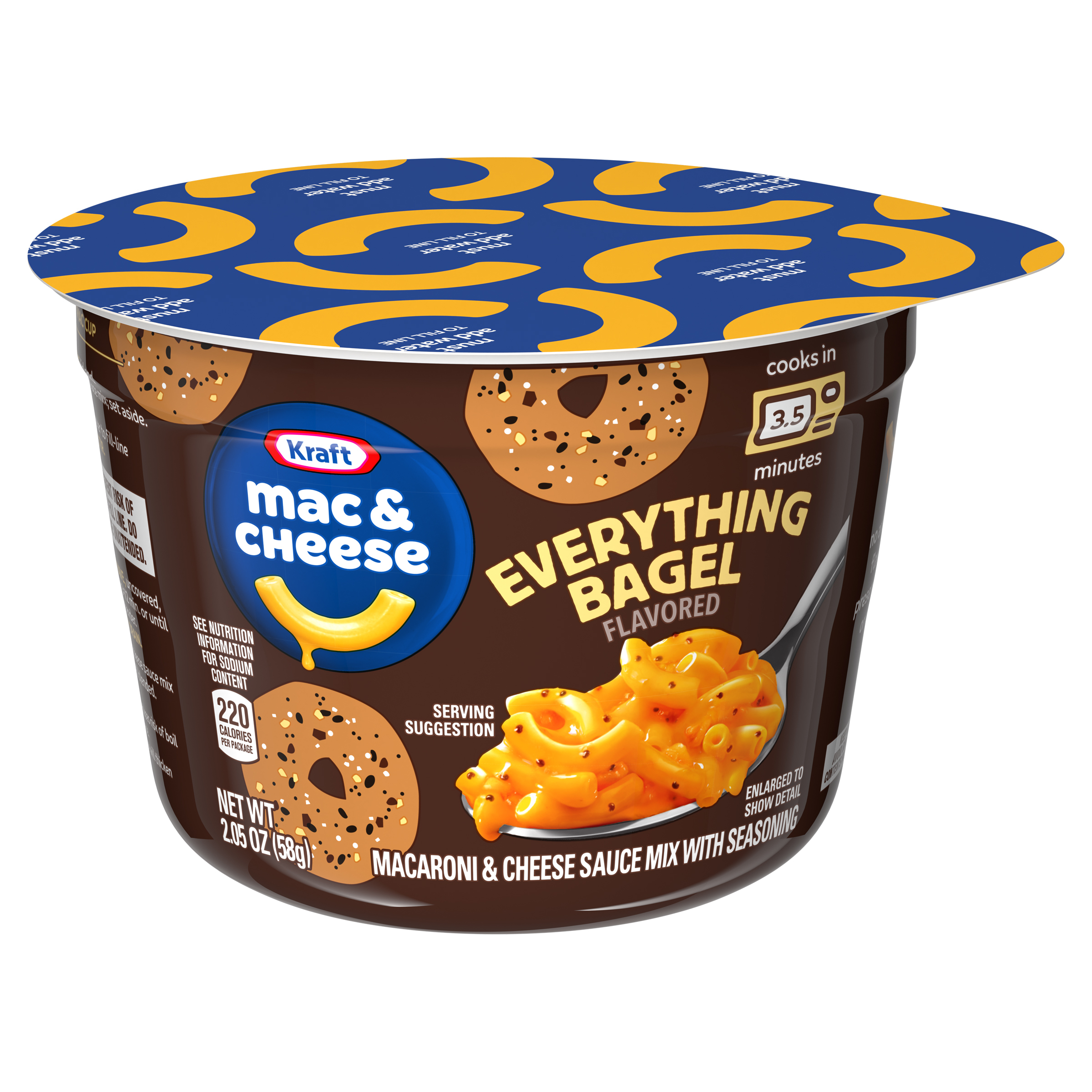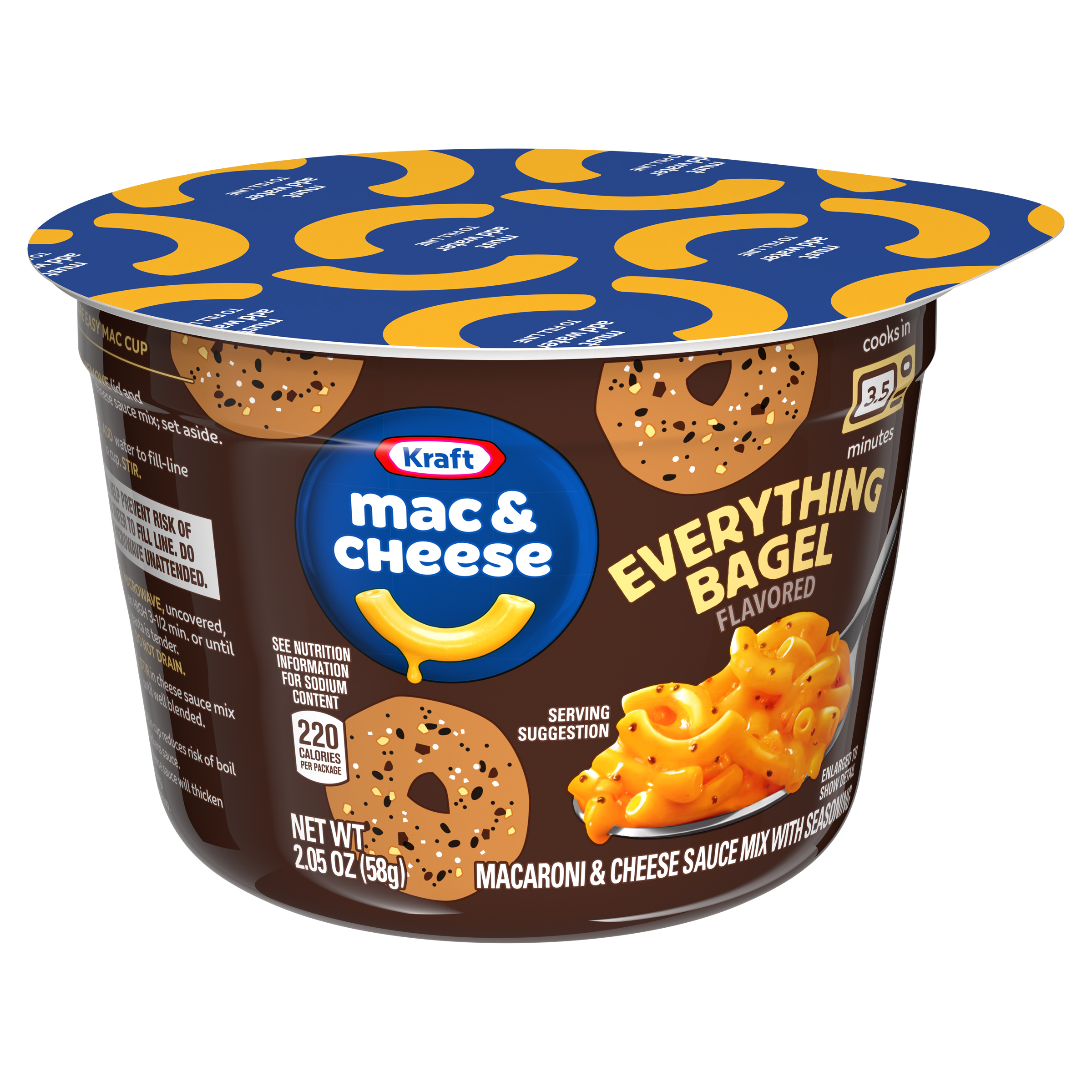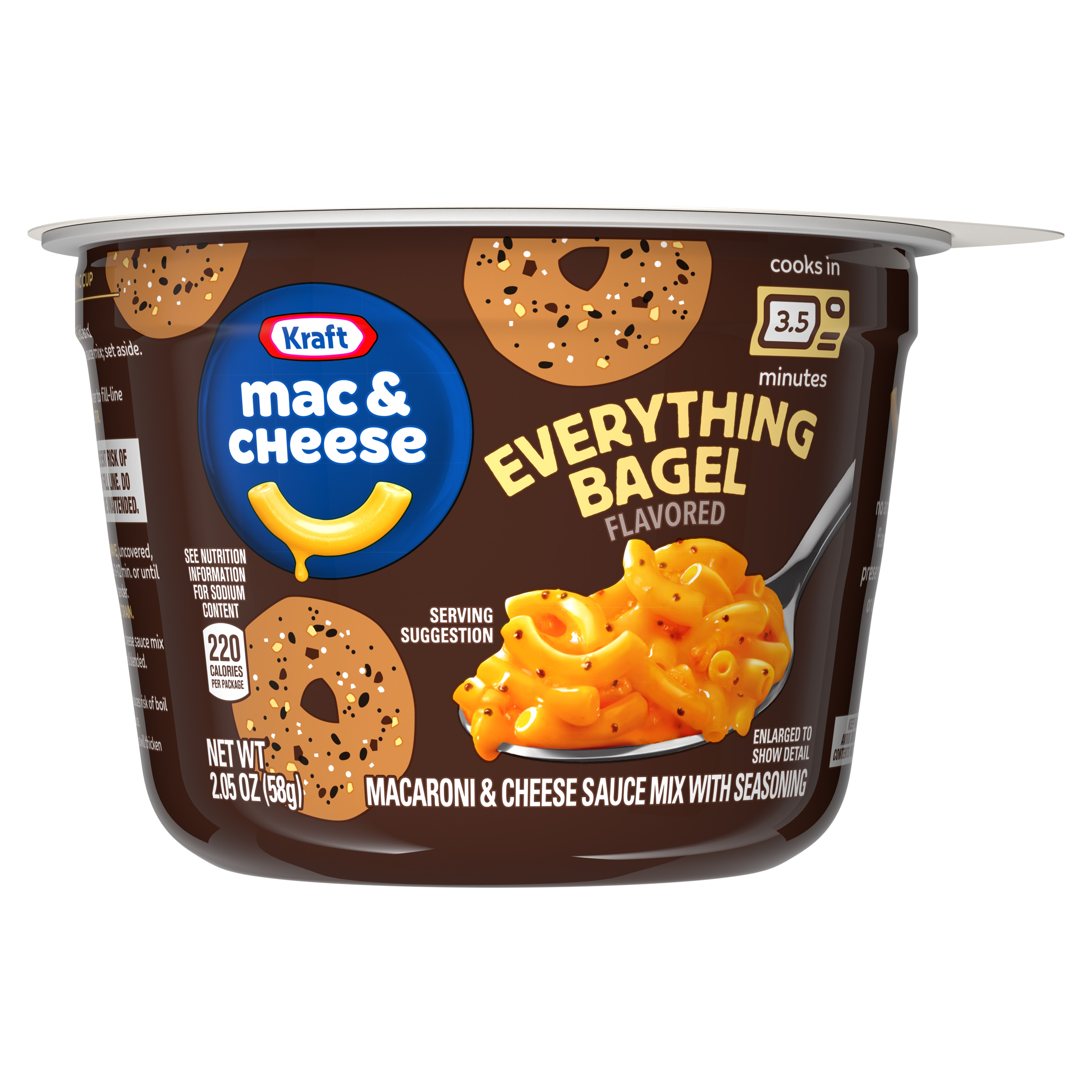 Product Description There’s nothing quite like a warm, cheesy cup of deliciousness to put a smile on your face. Help yourself to the comforting taste you love, now with the flavors of your favorite bagel. Kraft Everything Bagel Flavored Mac & Cheese Cup includes macaroni and cheese powder mixed with everything bagel flavor. Our everything bagel seasoning blend contains dried garlic, dried onion, poppy seeds and salt, but it does not contain sesame seeds. Kraft Mac & Cheese contains no artificial flavors, preservatives or dyes. To prepare, remove the lid and cheese sauce mix; set aside. Add water to the fill line in the cup and stir. Microwave for 3-1/2 minutes and stir in cheese sauce mix until well blended. Each 2.05-ounce cup makes a single serving that's perfect as a snack, side or addition to a meal. Everything bagel meets everything cheesy. It's a taste experience that is just...well, everything. Kraft Everything Bagel Flavored Mac & Cheese single cups are available only for a limited time, so savor every bite of this legendary mash-up. Every bite is packed with flavor that leaves you smiling.