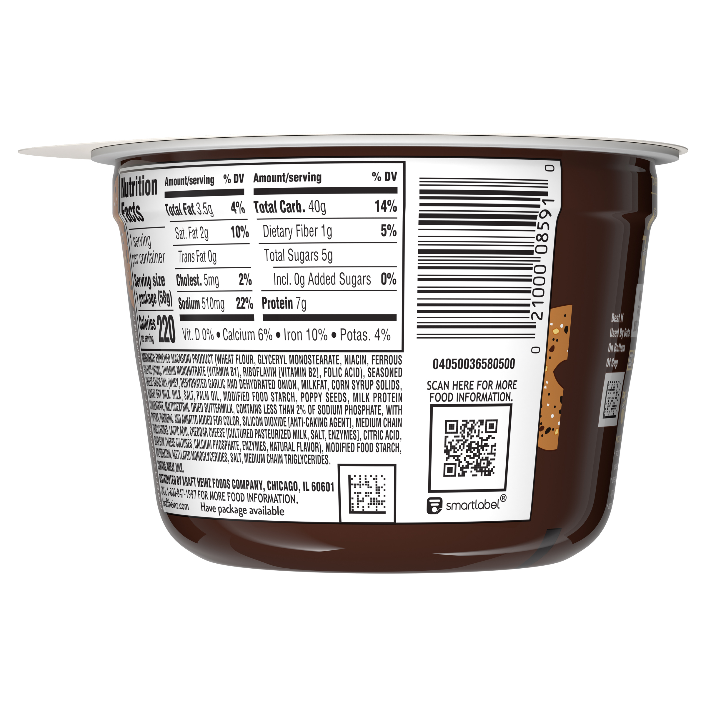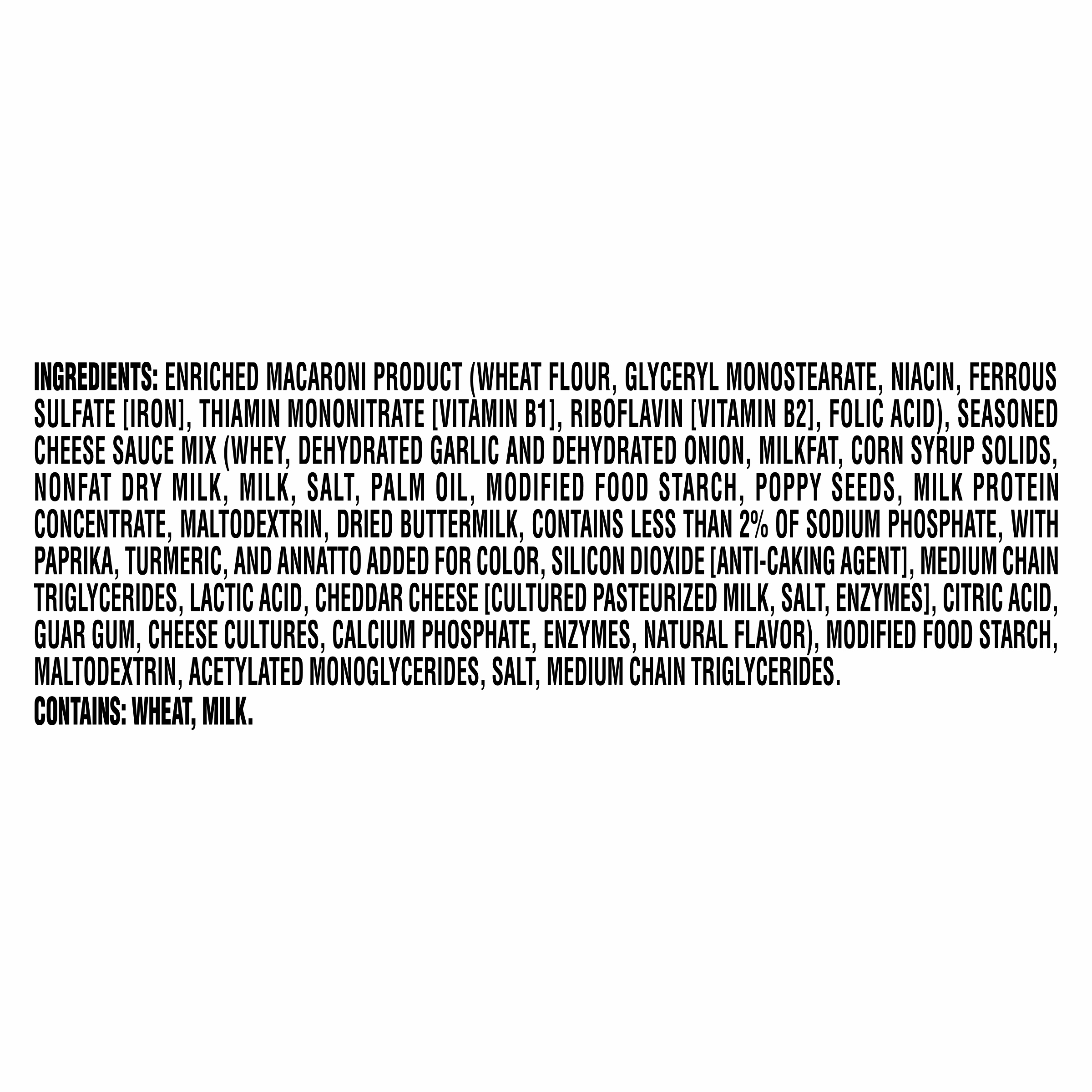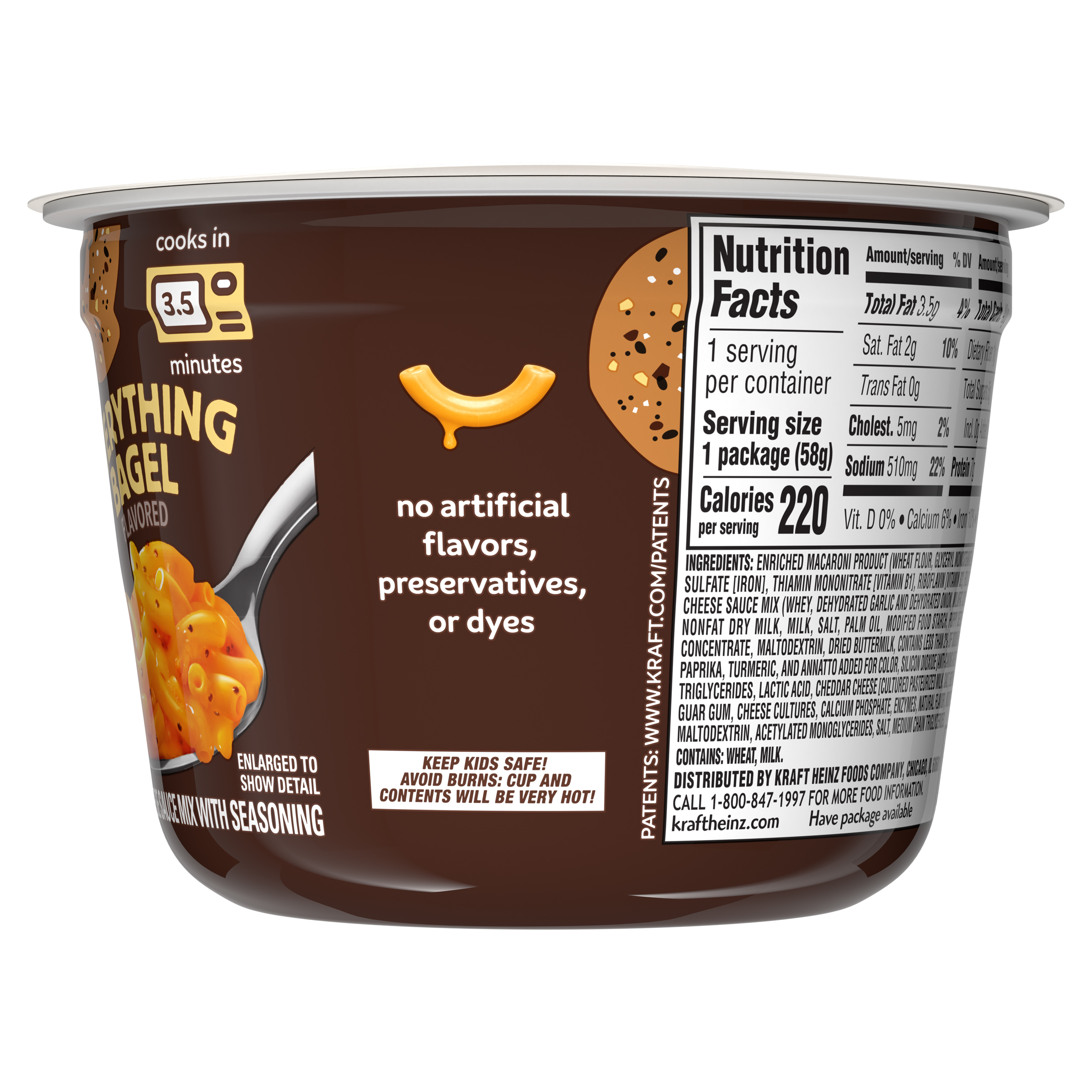 GTIN 00021000085910 Kraft Item Code (SKU) 00210000859170 Product Status Active Pack Level EACH Brand Name Kraft Business Unit Hydration Desserts & Meals Catalog Platform Easy Ready Meals Product Category Mac & Cheese Consumer Unit Size 2.05 Consumer Unit Size UOM OZ Packaging Type (Computed) Cup Packaging Type Code CUP Packaging Type Code Override (Manual) CUP Sub Units Per Item 1 Variant Everything Global Product Classification Code 10000242 Computed Exports - Ingredients ENRICHED MACARONI PRODUCT (WHEAT FLOUR, GLYCERYL MONOSTEARATE, NIACIN, FERROUS SULFATE [IRON], THIAMIN MONONITRATE [VITAMIN B1], RIBOFLAVIN [VITAMIN B2], FOLIC ACID), SEASONED CHEESE SAUCE MIX (WHEY, DEHYDRATED GARLIC AND DEHYDRATED ONION, MILKFAT, CORN SYRUP SOLIDS, NONFAT DRY MILK, MILK, SALT, PALM OIL, MODIFIED FOOD STARCH, POPPY SEEDS, MILK PROTEIN CONCENTRATE, MALTODEXTRIN, DRIED BUTTERMILK, CONTAINS LESS THAN 2% OF SODIUM PHOSPHATE, WITH PAPRIKA, TURMERIC, AND ANNATTO ADDED FOR COLOR, SILICON DIOXIDE [ANTI-CAKING AGENT], MEDIUM CHAIN TRIGLYCERIDES, LACTIC ACID, CHEDDAR CHEESE [CULTURED PASTEURIZED MILK, SALT, ENZYMES], CITRIC ACID, GUAR GUM, CHEESE CULTURES, CALCIUM PHOSPHATE, ENZYMES, NATURAL FLAVOR), MODIFIED FOOD STARCH, MALTODEXTRIN, ACETYLATED MONOGLYCERIDES, SALT, MEDIUM CHAIN TRIGLYCERIDES. Parent Reference 10021000085917 Quality Statement Best if Used By Date On Bottom Of Cup Customer Guarantee 90 Temperature Classification Code 01 Net Weight 0.128 Gross Weight 0.154 Weight UOM LB Height (in) 2.81 Length/Depth (in) 4.05 Width (in) 4.05 Case Cube 0.027 Parent Relation CASE_10021000085917 Parent Kraft Item Code (SKU) 00210000859100 Product Title Kraft Everything Bagel Flavored Mac & Cheese Macaroni and Cheese, 2.05 oz Cup eCommerce Product Name (Generic Name) Everything Bagel Flavored Mac & Cheese Macaroni and Cheese Product Benefits (Includes Seasonal + Formatting) - One 2.05 oz cup of Kraft Everything Bagel Flavored Mac & Cheese Macaroni and Cheese