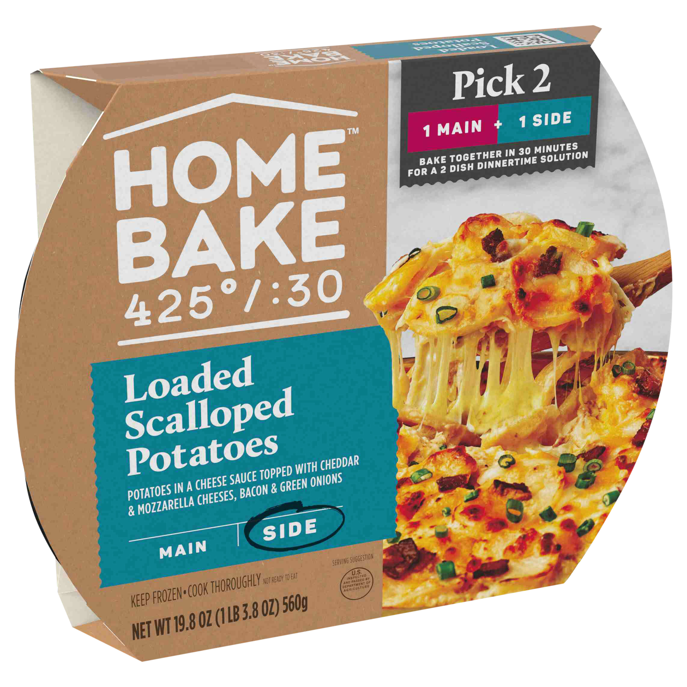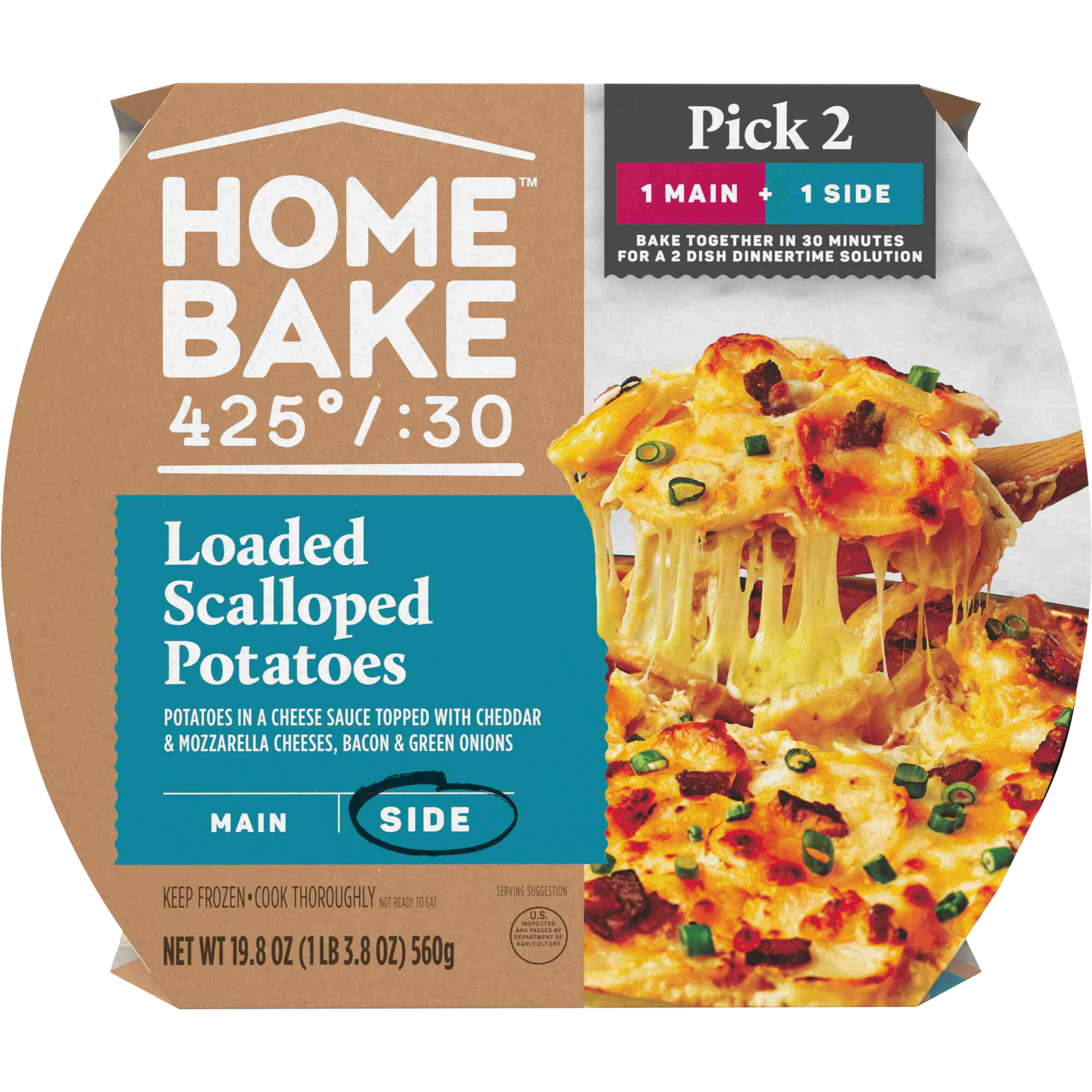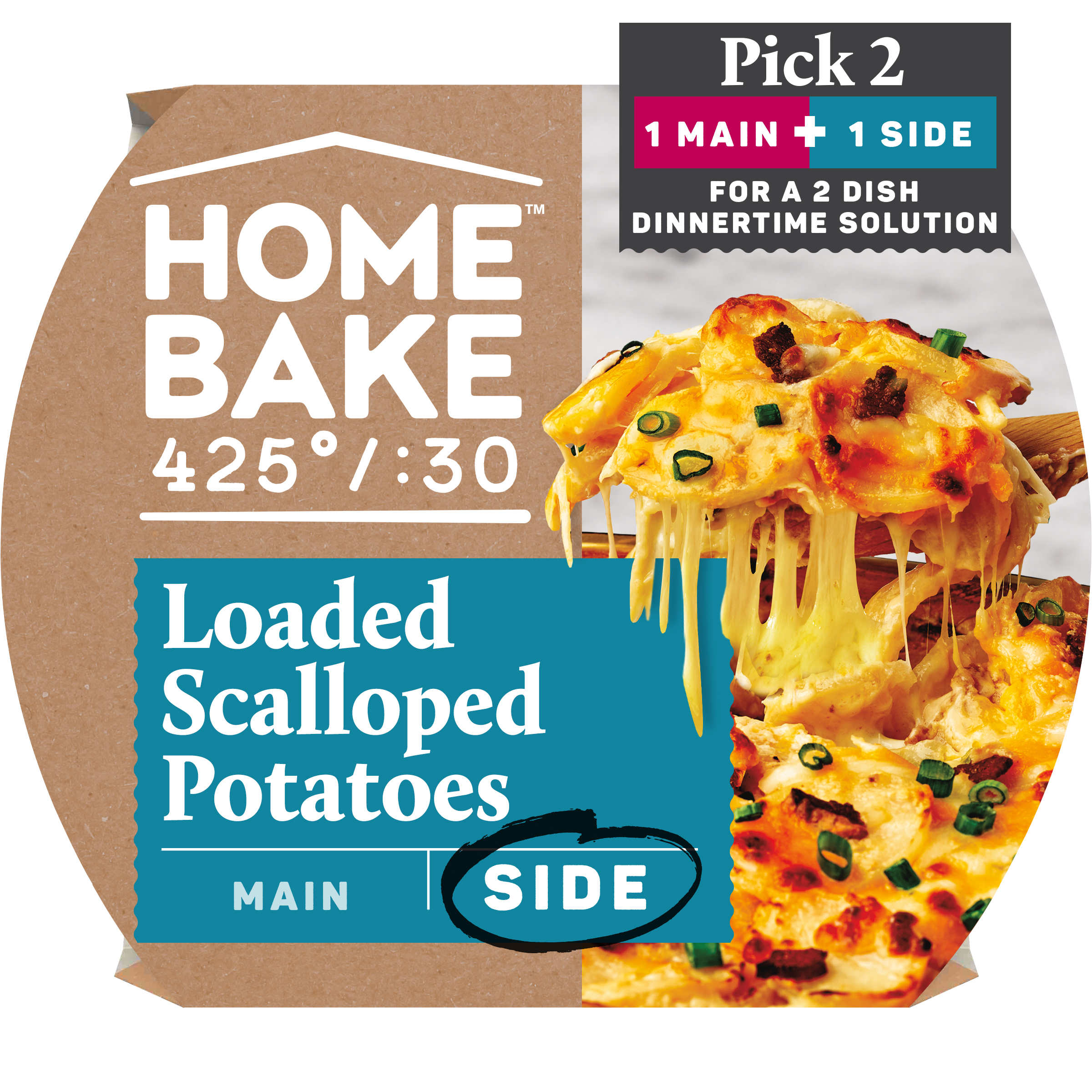 Product Description Spend more time with the ones you love and less time cooking with HomeBake 425°/:30. We’ve got you covered with frozen mains and sides you can mix and match to create a dinnertime solution everyone will love. Our HomeBake 425°/:30 Loaded Scalloped Potatoes feature thin sliced potatoes in a gooey cheese sauce, topped with crispy applewood smoked bacon, cheddar cheese, mozzarella cheese and green onions. Add a main, like our Pulled Pork with BBQ Sauce, and enjoy a family dinnertime solution that looks and tastes like homemade any night of the week. With HomeBake 425°/:30, all dishes cook together at 425 degrees Fahrenheit for 30 minutes. Using the same oven, same temperature and same cook time means less prep and cleanup, and more time spent with friends and family. HomeBake 425°/:30 is food that makes family happen.