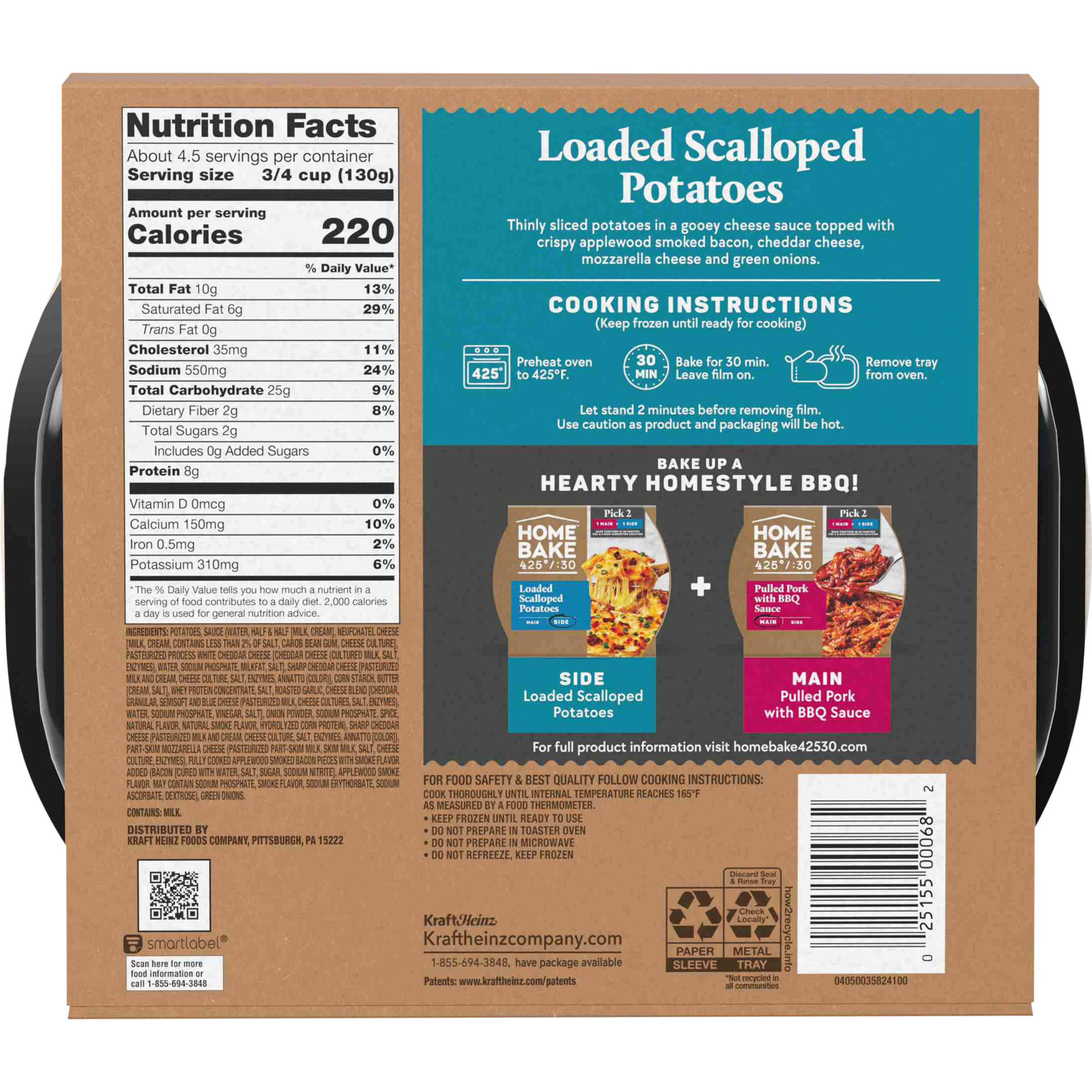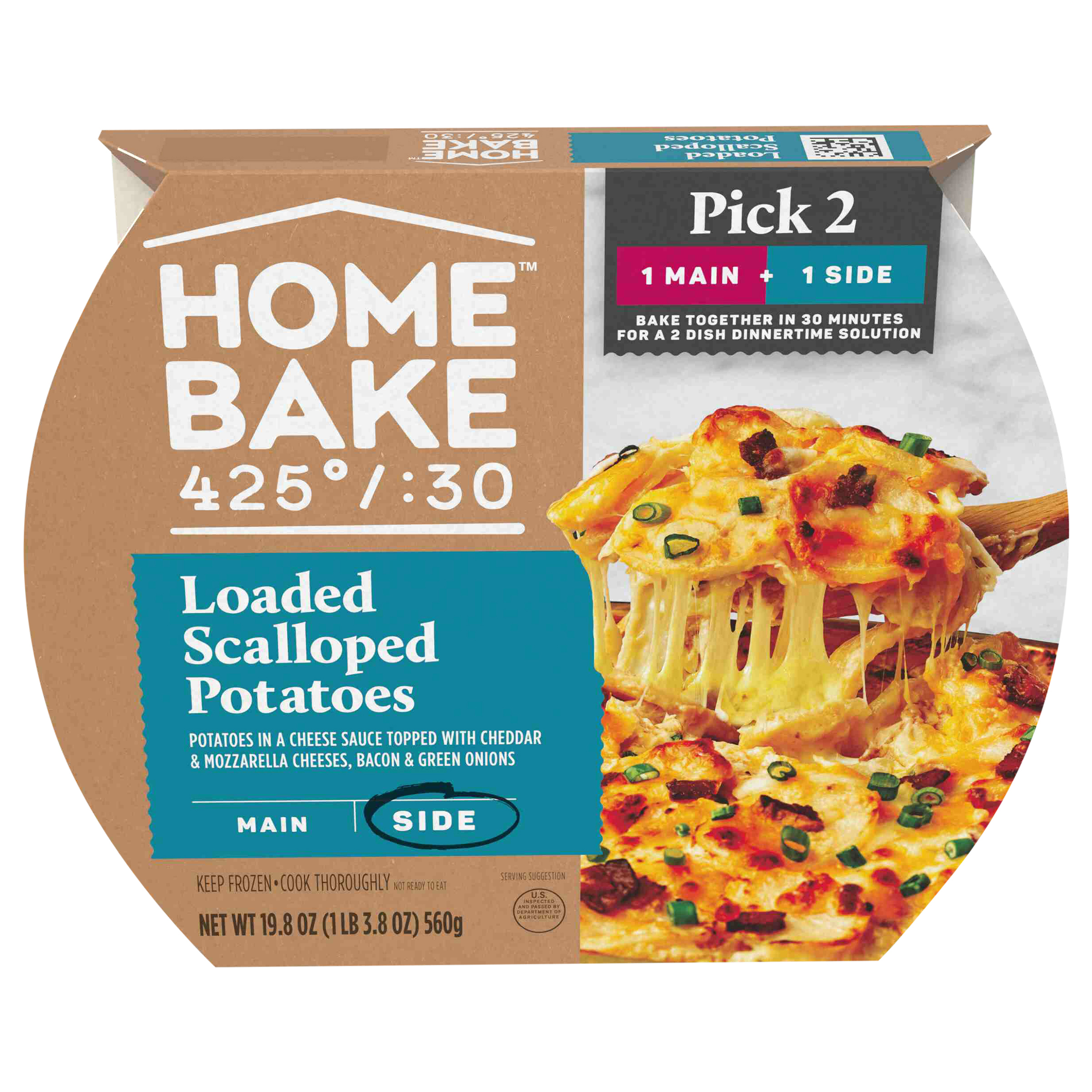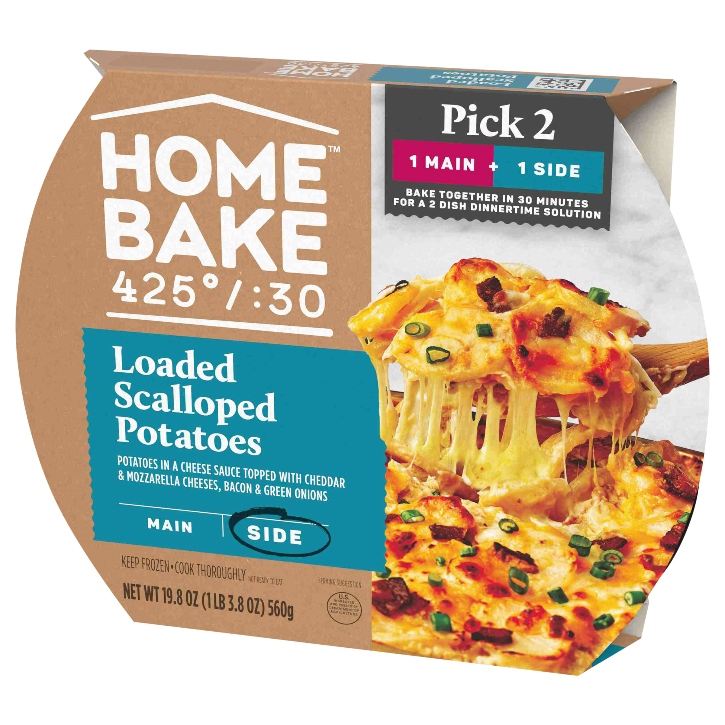 Product Description Spend more time with the ones you love and less time cooking with HomeBake 425°/:30. We’ve got you covered with frozen mains and sides you can mix and match to create a dinnertime solution everyone will love. Our HomeBake 425°/:30 Loaded Scalloped Potatoes feature thin sliced potatoes in a gooey cheese sauce, topped with crispy applewood smoked bacon, cheddar cheese, mozzarella cheese and green onions. Add a main, like our Pulled Pork with BBQ Sauce, and enjoy a family dinnertime solution that looks and tastes like homemade any night of the week. With HomeBake 425°/:30, all dishes cook together at 425 degrees Fahrenheit for 30 minutes. Using the same oven, same temperature and same cook time means less prep and cleanup, and more time spent with friends and family. HomeBake 425°/:30 is food that makes family happen.