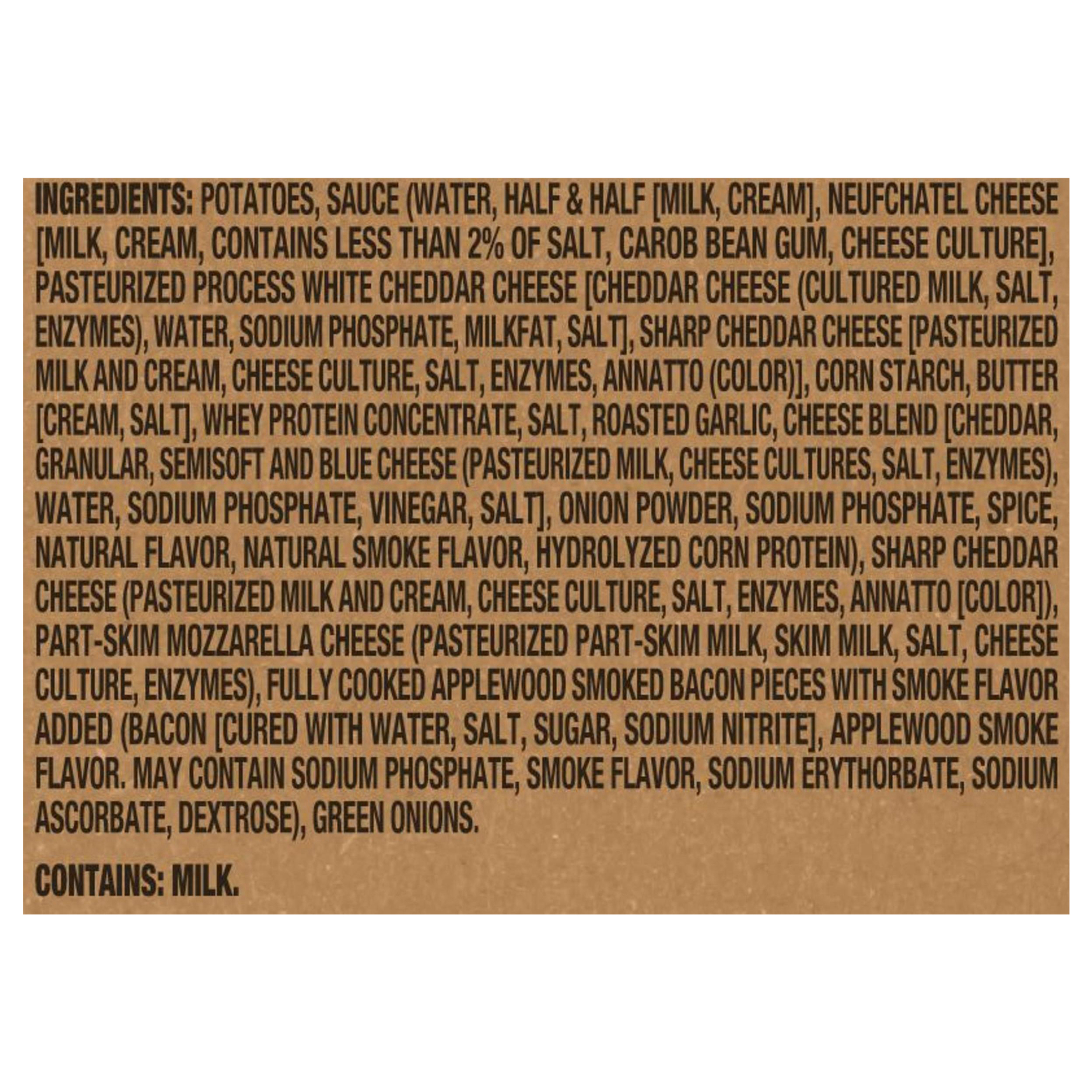 - Potatoes in a cheese sauce topped with cheddar and mozzarella cheeses, applewood smoked bacon and green onions