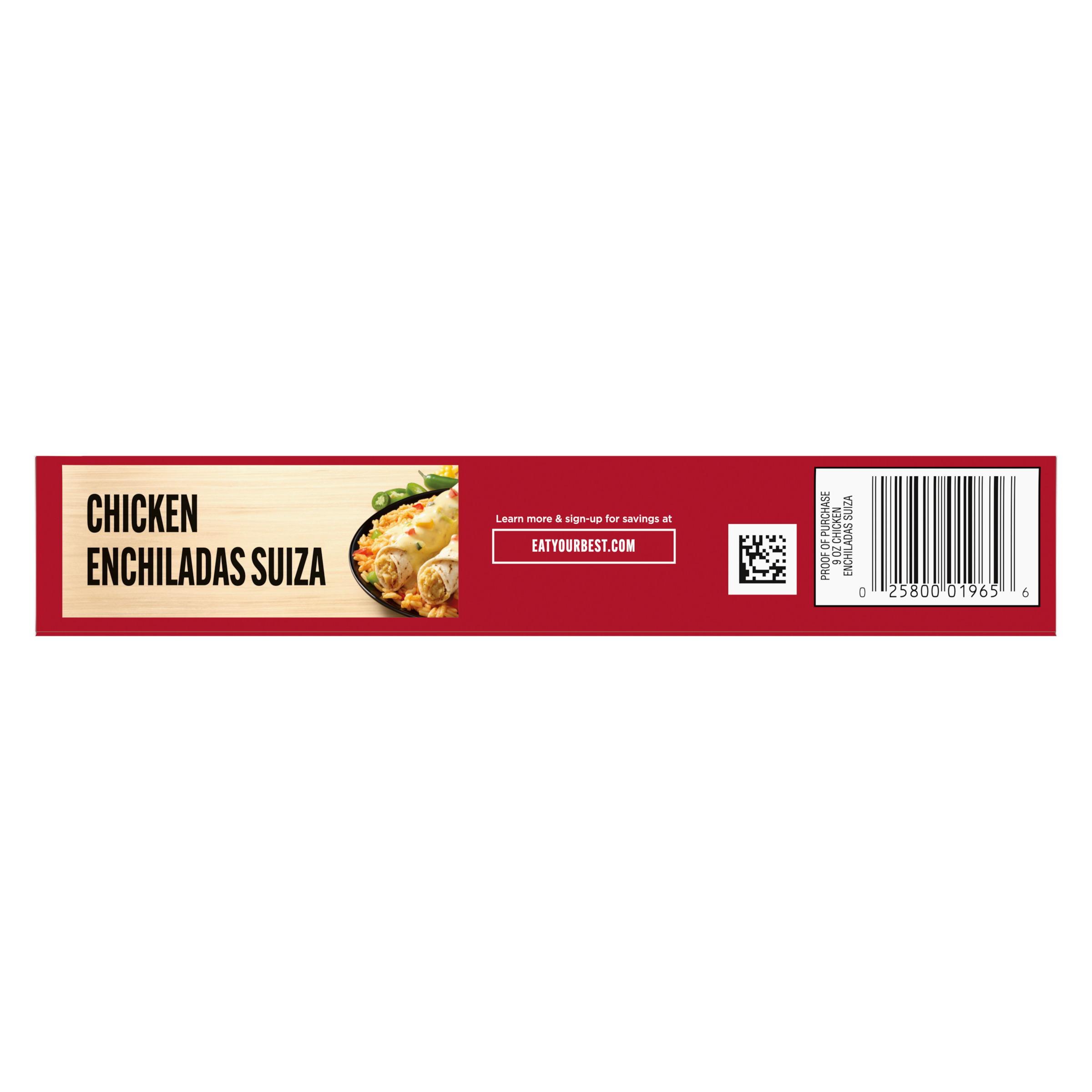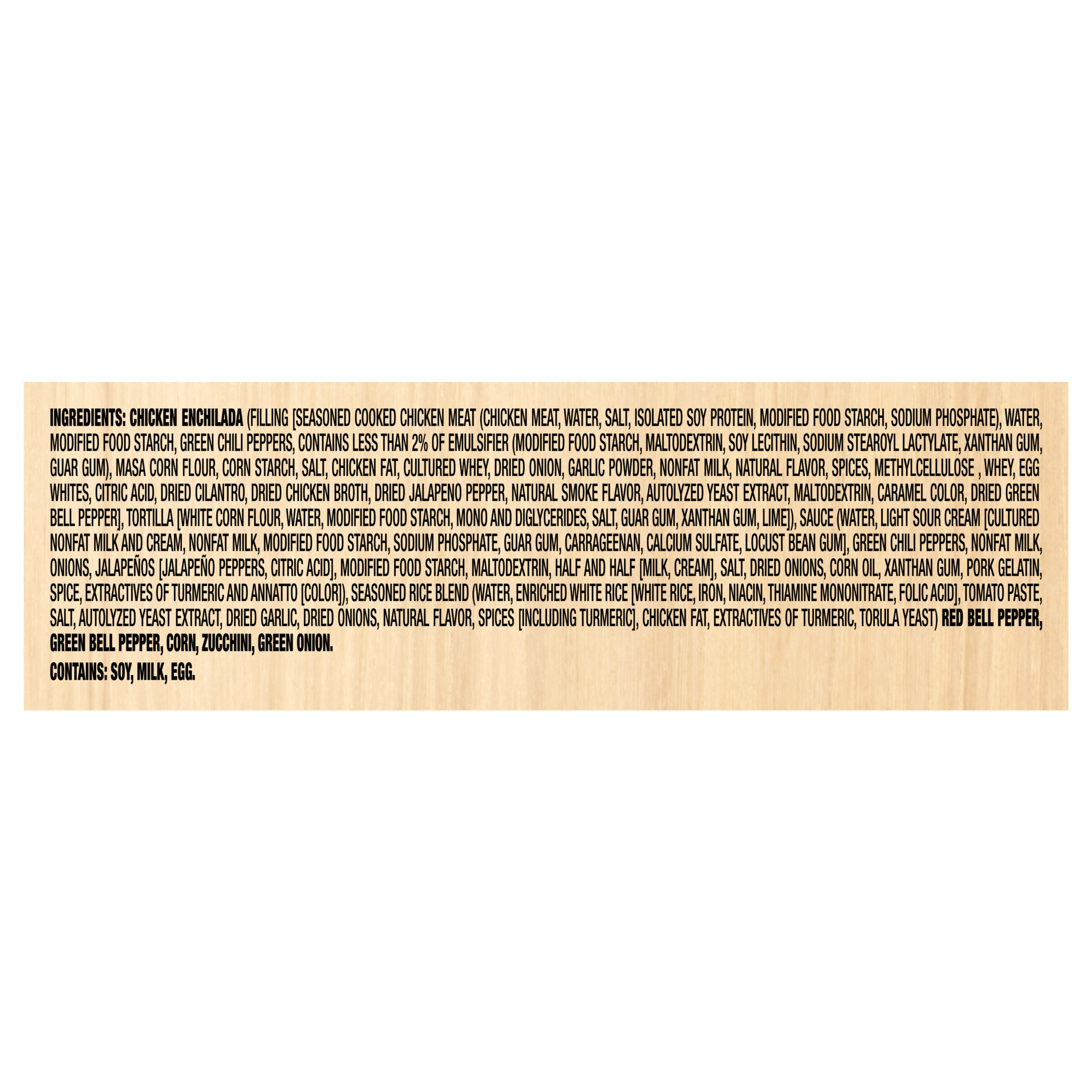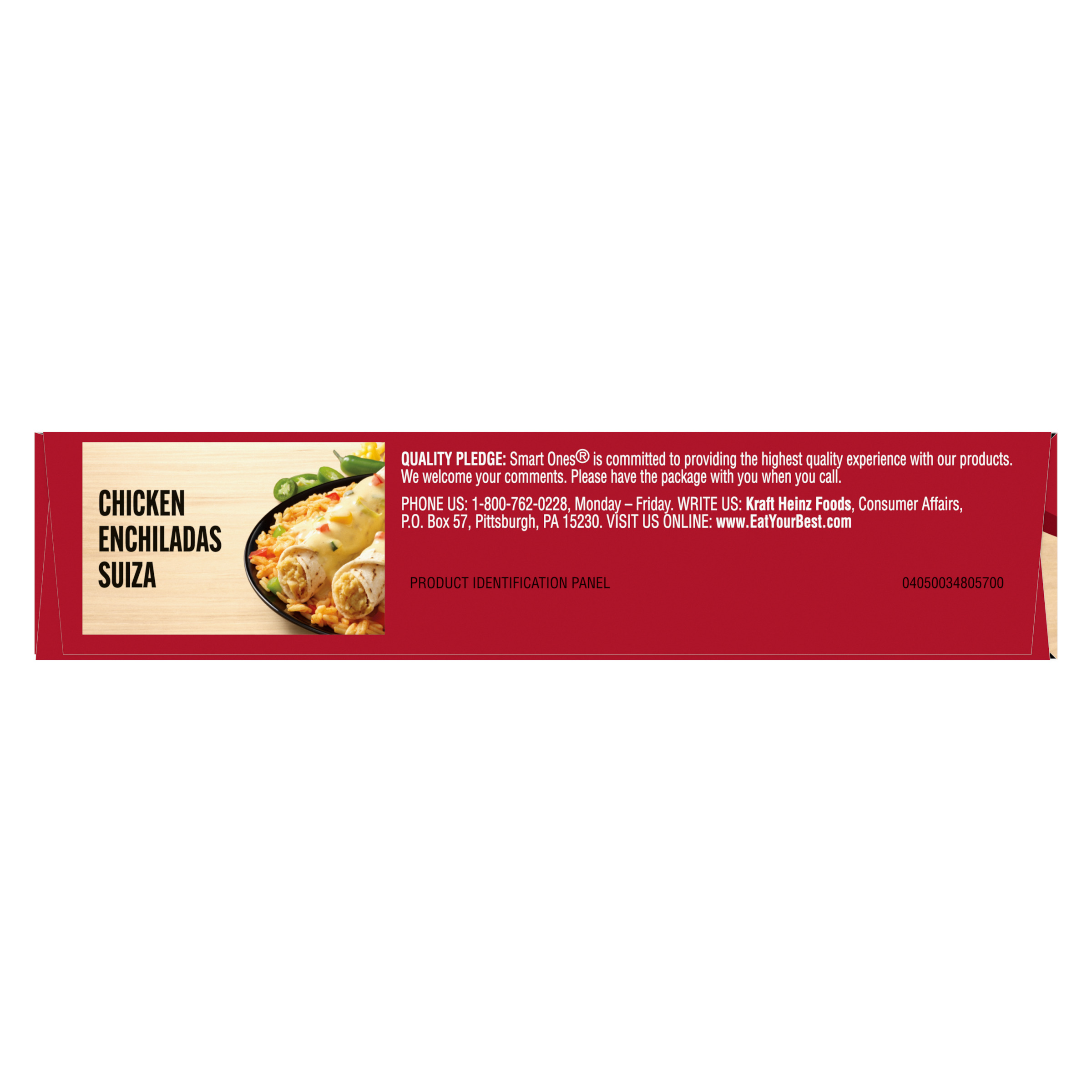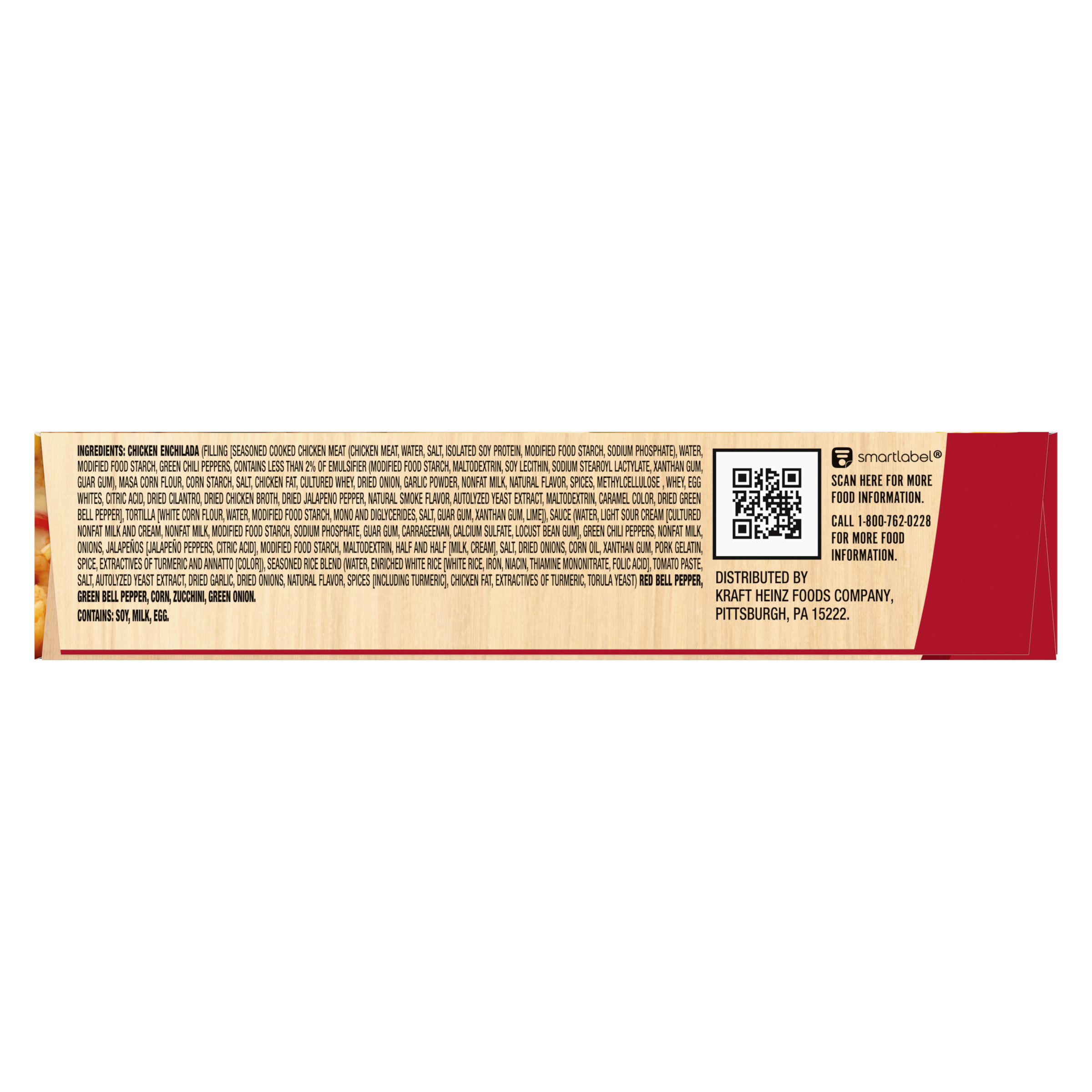 GTIN 00025800019656 Kraft Item Code (SKU) 00258000196570 Product Status Active Pack Level EACH Brand Name Smart Ones Business Unit Hydration Desserts & Meals Catalog Platform Easy Ready Meals Product Category Frozen Meals - Wellness Consumer Unit Size 9 Consumer Unit Size UOM OZ Packaging Type (Computed) Box Packaging Type Code BOX/CARTON Packaging Type Code Override (Manual) BOX Sub Units Per Item 1 Variant Chicken Enchiladas Suiza Global Product Classification Sandwiches/Filled Rolls/Wraps (Frozen) Global Product Classification Code 10000291 Computed Exports - Ingredients CHICKEN ENCHILADA (FILLING [SEASONED COOKED CHICKEN MEAT (CHICKEN MEAT, WATER, SALT, ISOLATED SOY PROTEIN, MODIFIED FOOD STARCH, SODIUM PHOSPHATE), WATER, MODIFIED FOOD STARCH, GREEN CHILI PEPPERS, CONTAINS LESS THAN 2% OF EMULSIFIER (MODIFIED FOOD STARCH, MALTODEXTRIN, SOY LECITHIN, SODIUM STEAROYL LACTYLATE, XANTHAN GUM, GUAR GUM), MASA CORN FLOUR , CORN STARCH, SALT, CHICKEN FAT, CULTURED WHEY, DRIED ONION, GARLIC POWDER, NONFAT MILK, NATURAL FLAVOR, SPICES, METHYLCELLULOSE , WHEY, EGG WHITES, CITRIC ACID, DRIED CILANTRO, DRIED CHICKEN BROTH, DRIED JALAPENO PEPPER, NATURAL SMOKE FLAVOR, AUTOLYZED YEAST EXTRACT, MALTODEXTRIN, CARAMEL COLOR, DRIED GREEN BELL PEPPER], TORTILLA [WHITE CORN FLOUR, WATER, MODIFIED FOOD STARCH, MONO AND DIGLYCERIDES, SALT, GUAR GUM, XANTHAN GUM, LIME]), SAUCE (WATER, LIGHT SOUR CREAM [CULTURED NONFAT MILK AND CREAM, NONFAT MILK, MODIFIED FOOD STARCH, SODIUM PHOSPHATE, GUAR GUM, CARRAGEENAN, CALCIUM SULFATE, LOCUST BEAN GUM], GREEN CHILI PEPPERS, NONFAT MILK, ONIONS, JALAPEOS [JALAPEO PEPPERS, CITRIC ACID], MODIFIED FOOD STARCH, MALTODEXTRIN, HALF AND HALF [MILK, CREAM], SALT, DRIED ONIONS, CORN OIL, XANTHAN GUM, PORK GELATIN, SPICE, EXTRACTIVES OF TURMERIC AND ANNATTO [COLOR]), SEASONED RICE BLEND (WATER, ENRICHED WHITE RICE [WHITE RICE, IRON, NIACIN, THIAMINE MONONITRATE, FOLIC ACID], TOMATO PASTE, SALT, AUTOLYZED YEAST EXTRACT, DRIED GARLIC, DRIED ONIONS, NATURAL FLAVOR, SPICES [INCLUDING TURMERIC], CHICKEN FAT, EXTRACTIVES OF TURMERIC, TORULA YEAST) RED BELL PEPPER, GREEN BELL PEPPER, CORN, ZUCCHINI, GREEN ONION. Parent Reference 10025800019653 Quality Statement Best When Used By Storage Instructions Keep Frozen Customer Guarantee 180 Temperature Classification Frozen Storage -30 to -18 °C / -22 to 0 °F Temperature Classification Code 08 Net Weight 0.562 Gross Weight 0.648 Weight UOM LB Height (in) 5.917 Length/Depth (in) 1.34 Width (in) 7.493 Case Cube 0.034 Parent Relation CASE_10025800019653 Parent Kraft Item Code (SKU) 00258000196500 Product Title Smart Ones Chicken Enchiladas Suiza Frozen Meal, 9 oz Box eCommerce Product Name (Generic Name) Chicken Enchiladas Suiza with Zesty Light Sour Cream, Green Chile Sauce & Spanish Rice Frozen Meal Product Benefits (Includes Seasonal + Formatting) - One 9 oz box of Smart Ones Chicken Enchiladas Suiza Frozen Meal