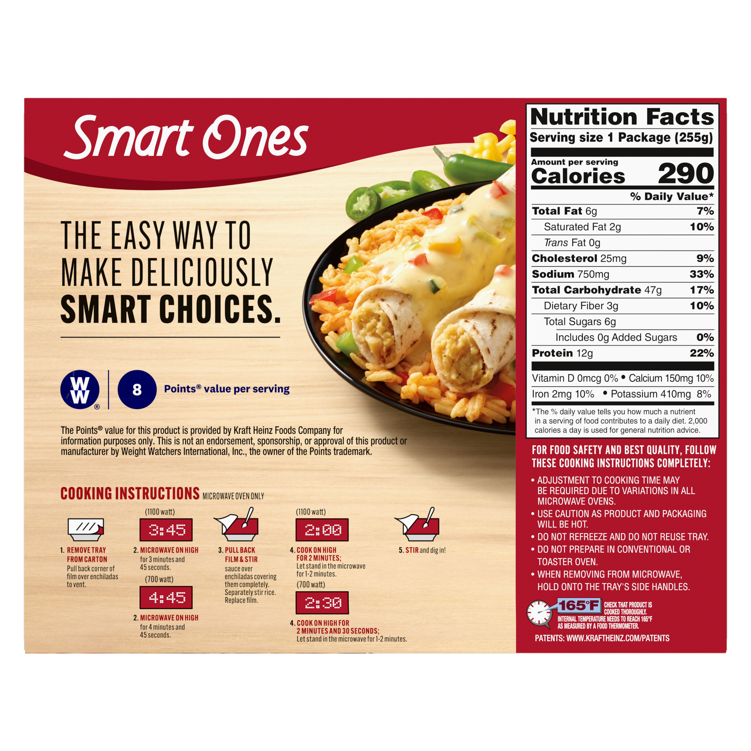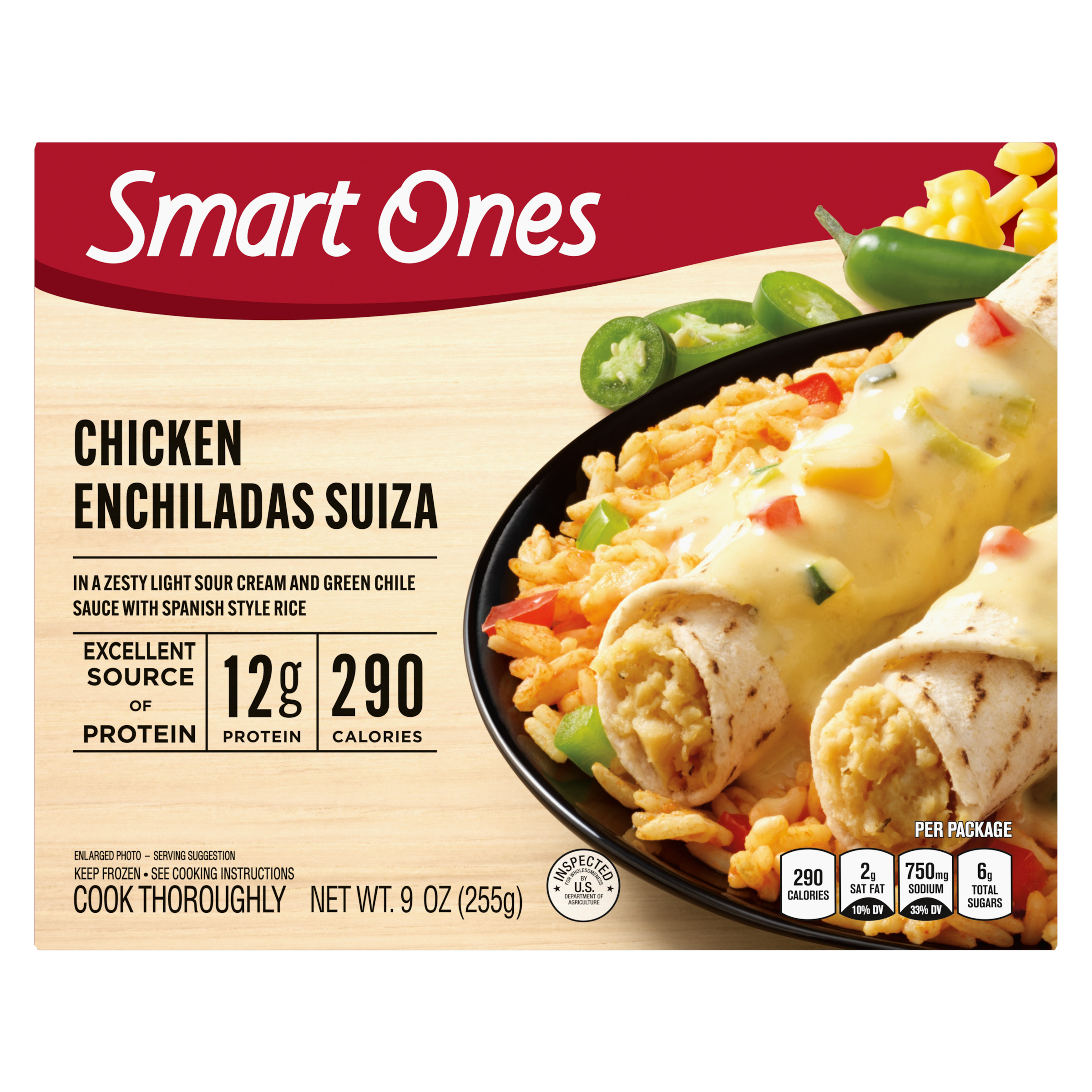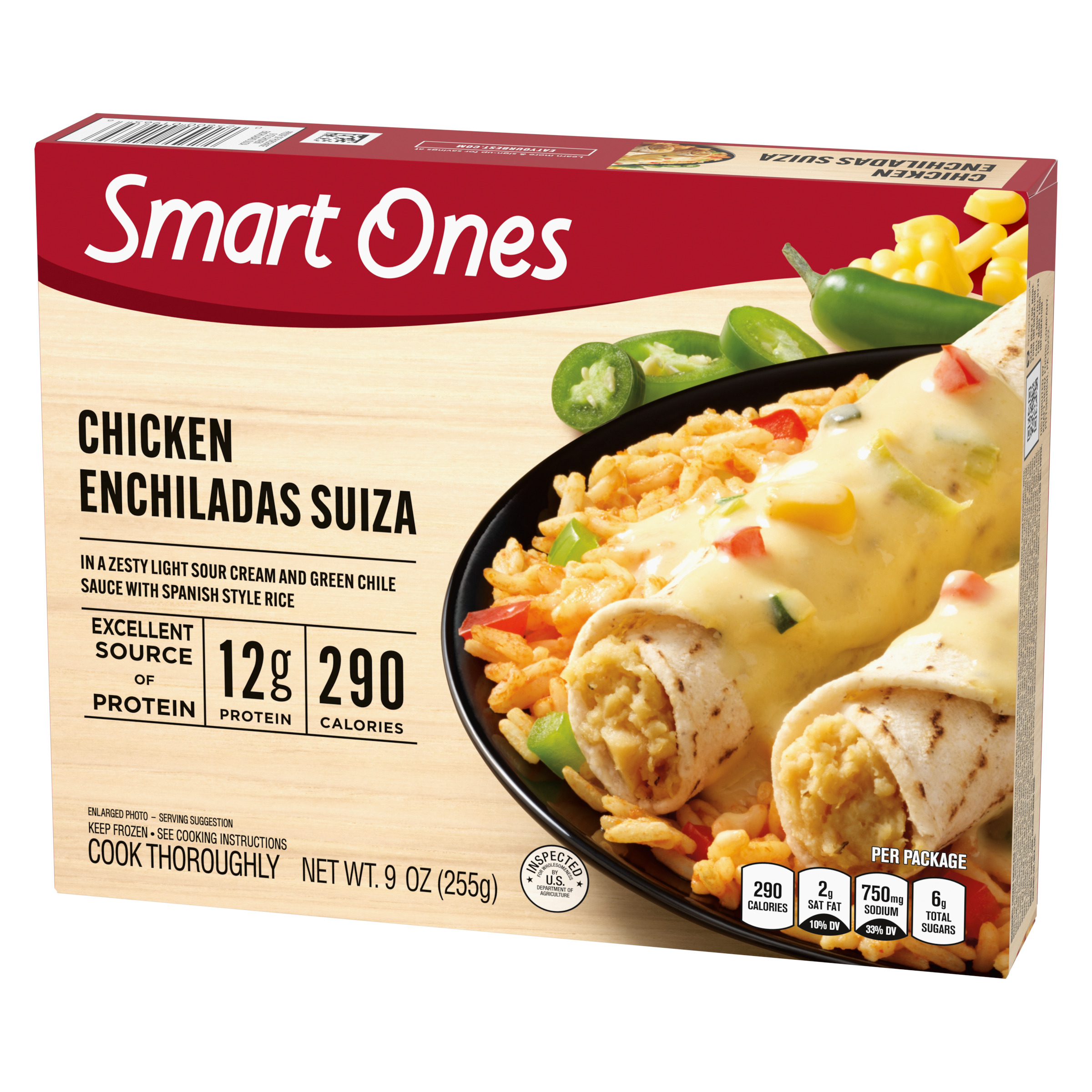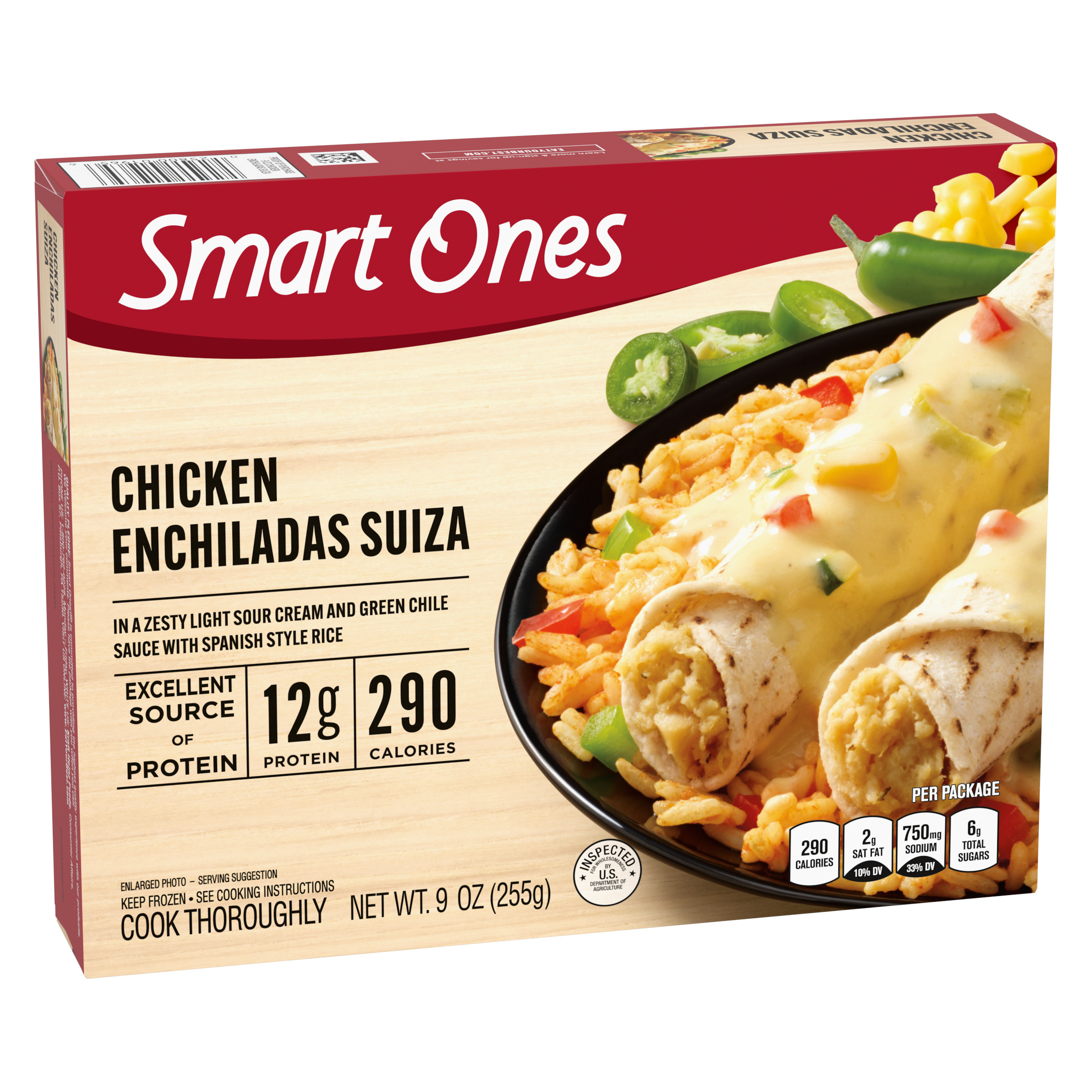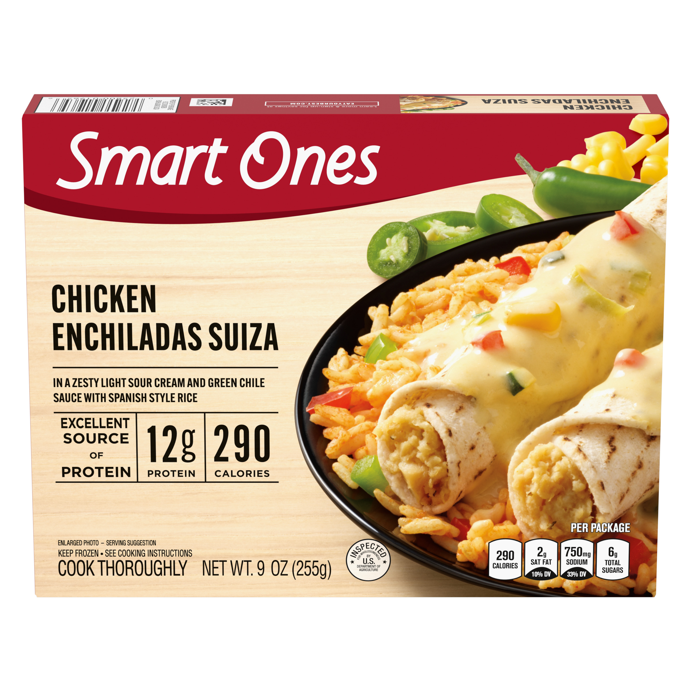 Product Description The easy way to make deliciously smart choices. When it's time to think about lunch or dinner, Smart Ones Chicken Enchiladas Suiza offers a quick meal solution. Our dish features chicken enchiladas suiza in a zesty light sour cream and green chile sauce with Spanish style rice. Each dish contains 290 calories, 12 grams of protein and 8 WW Points® per serving. Our savory enchiladas are an excellent source of protein. Ideal for an easy dinnertime solution, our convenient dish includes a microwave tray for effortless preparation. Cook as directed. Keep our frozen food in the freezer until ready to prepare and cook thoroughly.